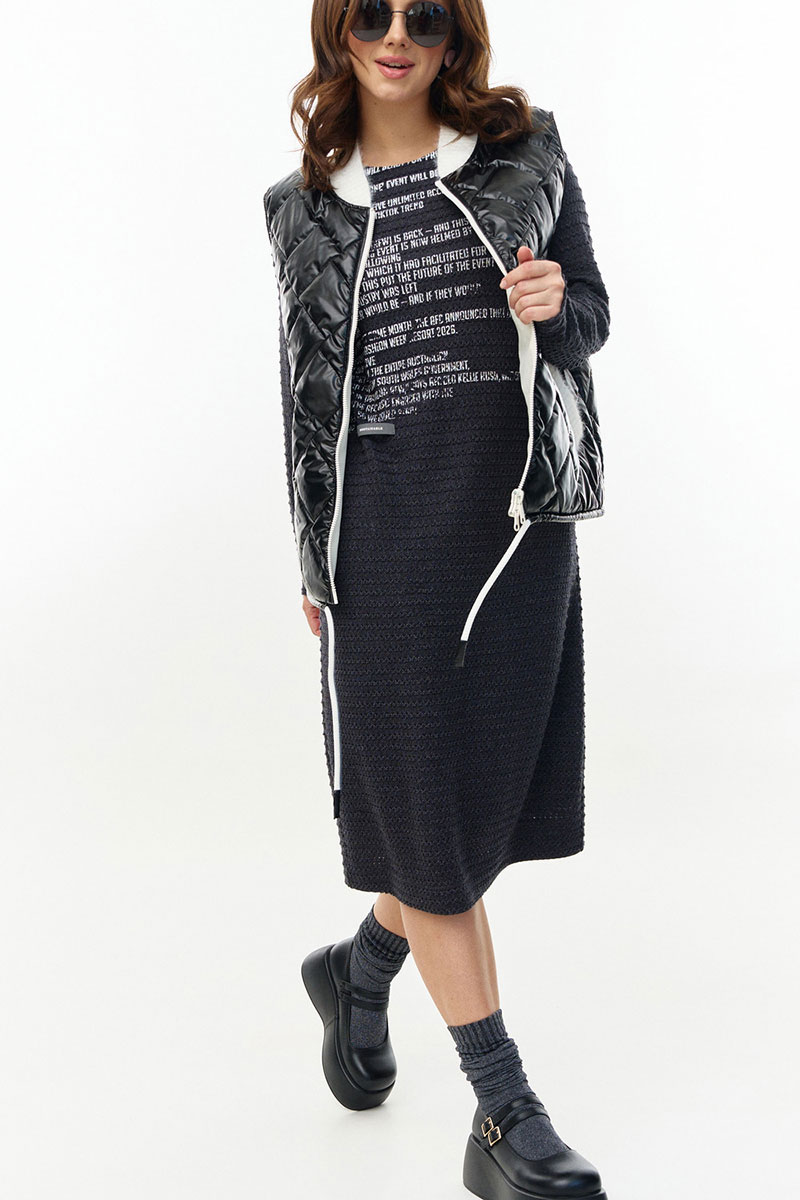 Платье из ажурного вискозного трикотажа, прямого силуэта с длинным рукавом, круглой горловиной и боковыми карманами. Перед декорирован авторским принтом. Изделие на трикотажной подкладке.