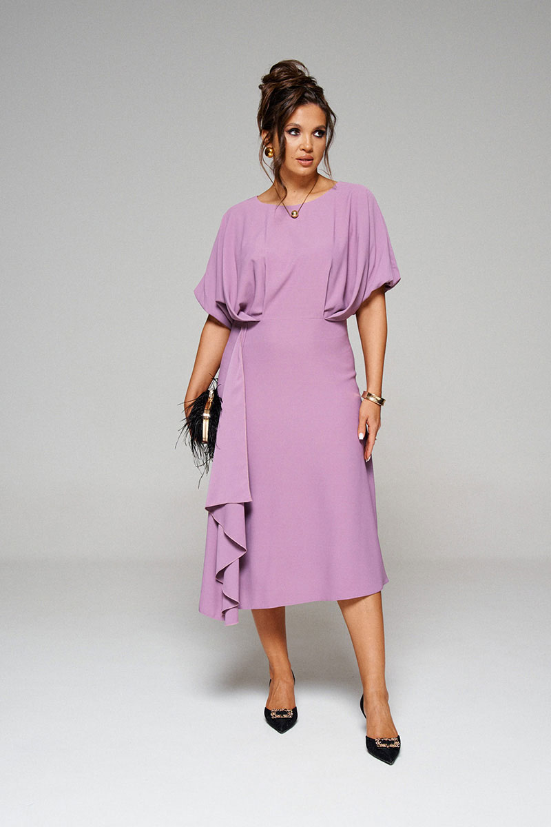 Конструкция верхней части платья выполнена в свободном стиле со спущенной линией плеча и глубокими складками на линии талии спереди.