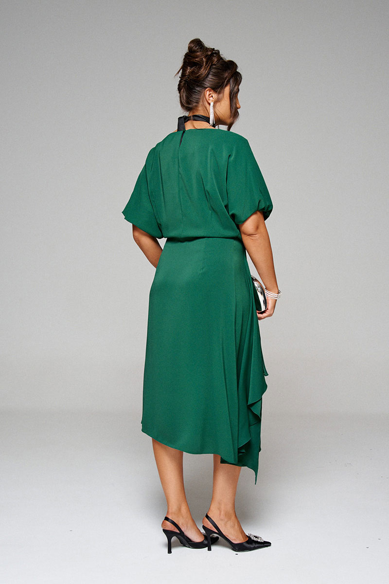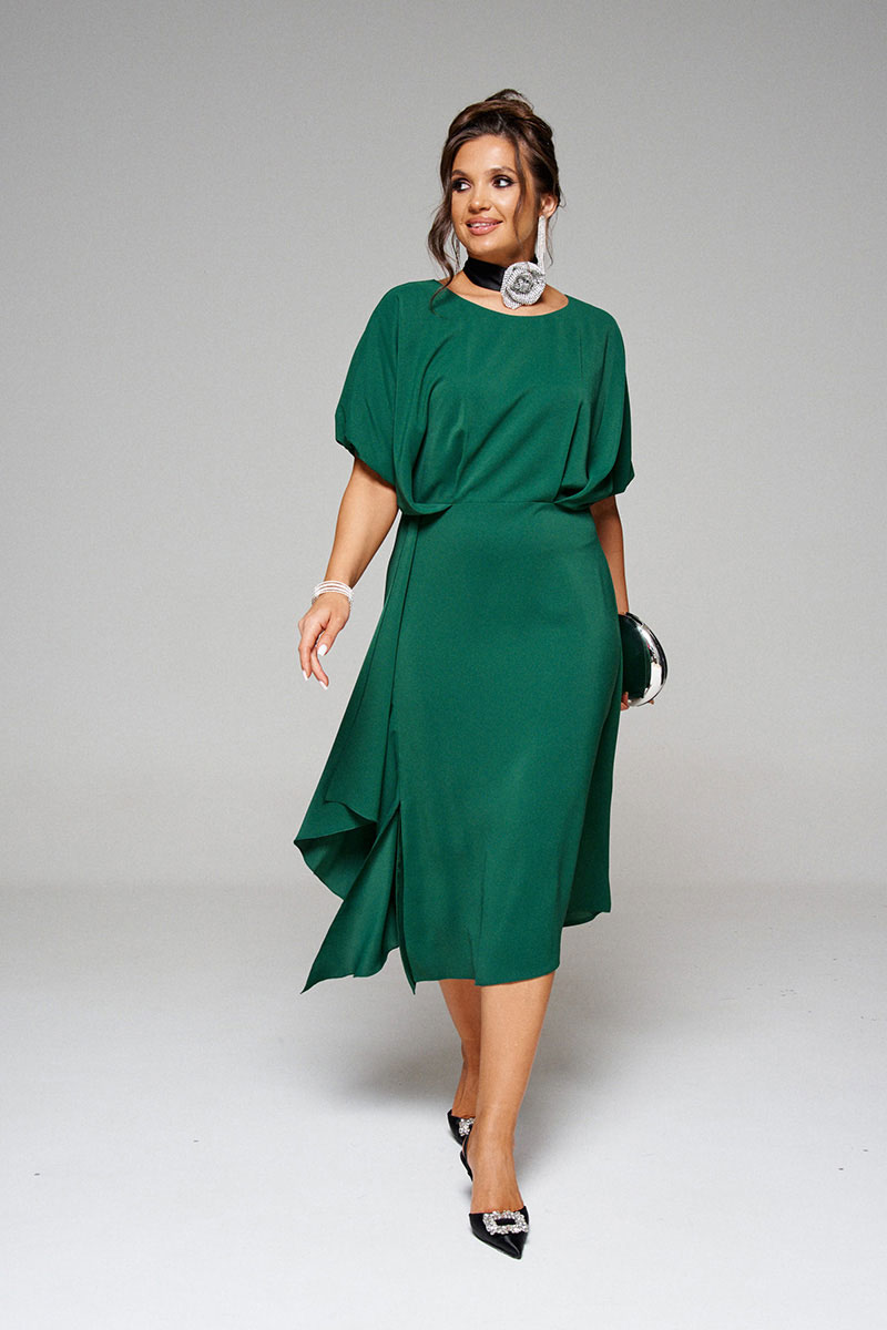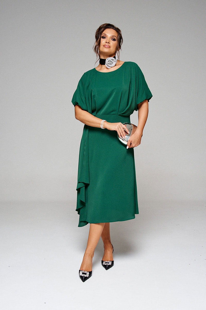 Конструкция верхней части платья выполнена в свободном стиле со спущенной линией плеча и глубокими складками на линии талии спереди.