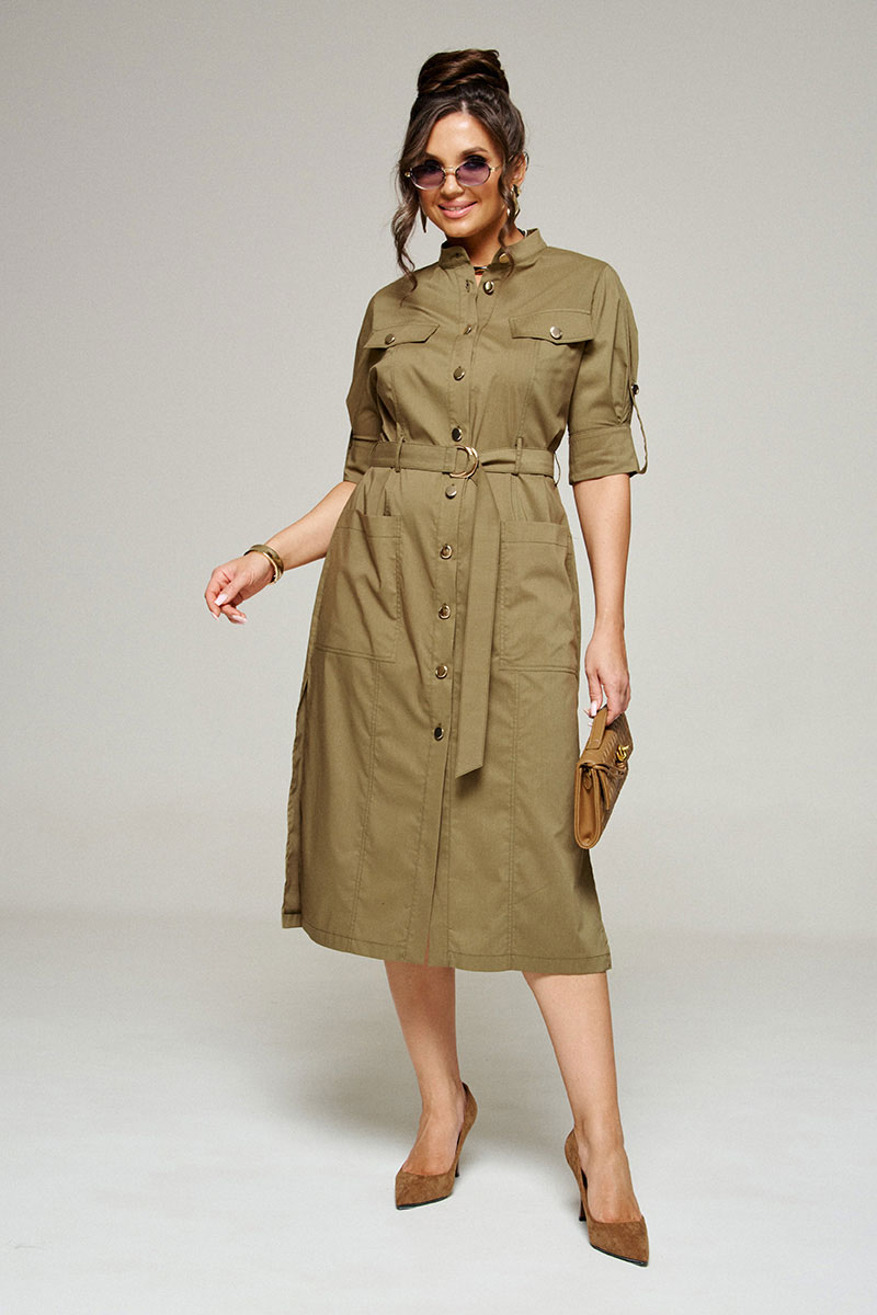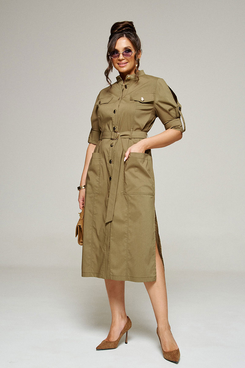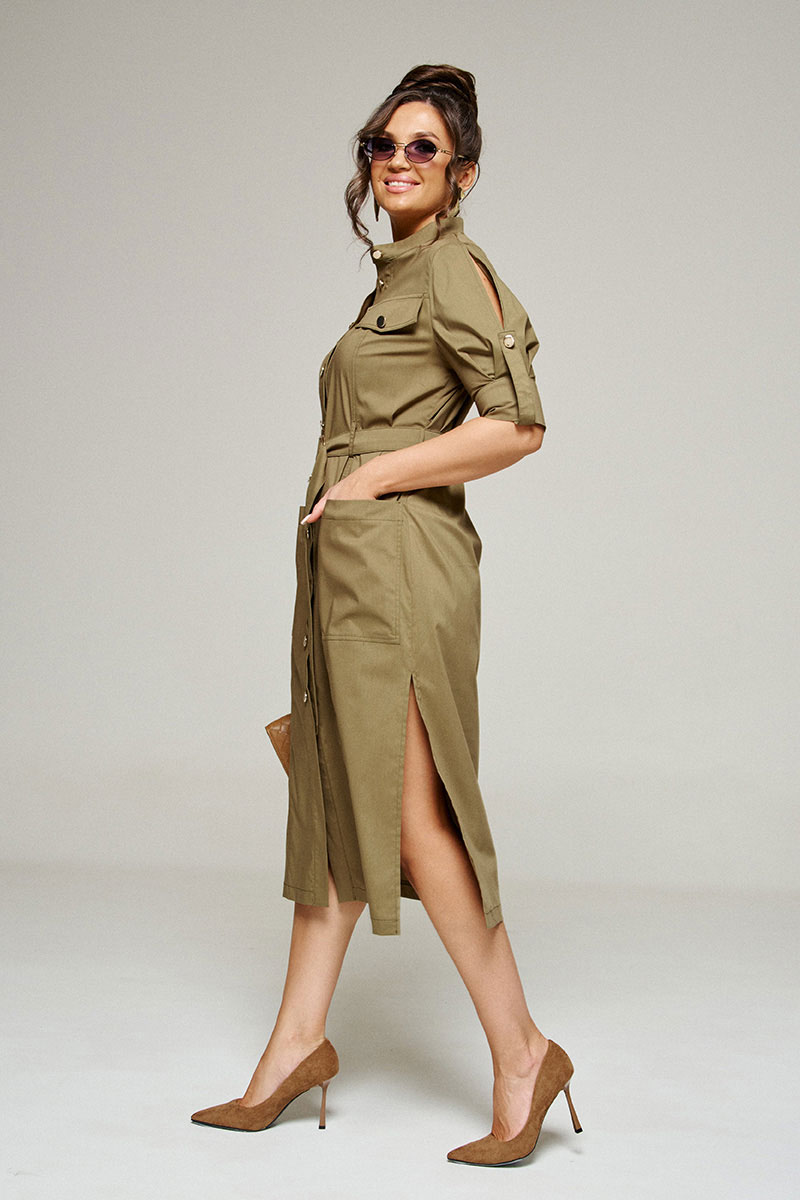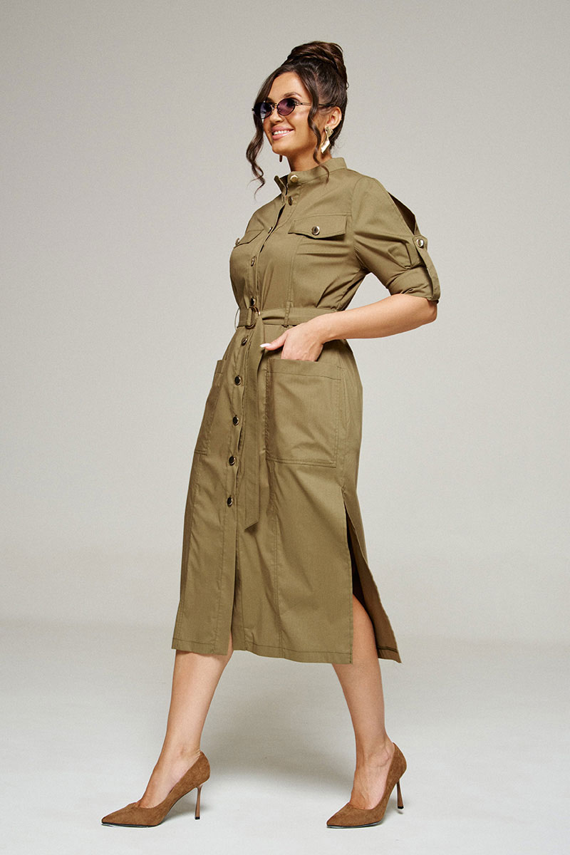 Платье женское полуприлегающего силуэта, длиной «миди», в строгом и практичном стиле «сафари» из смесового полотна с натуральным волокном – хлопок.