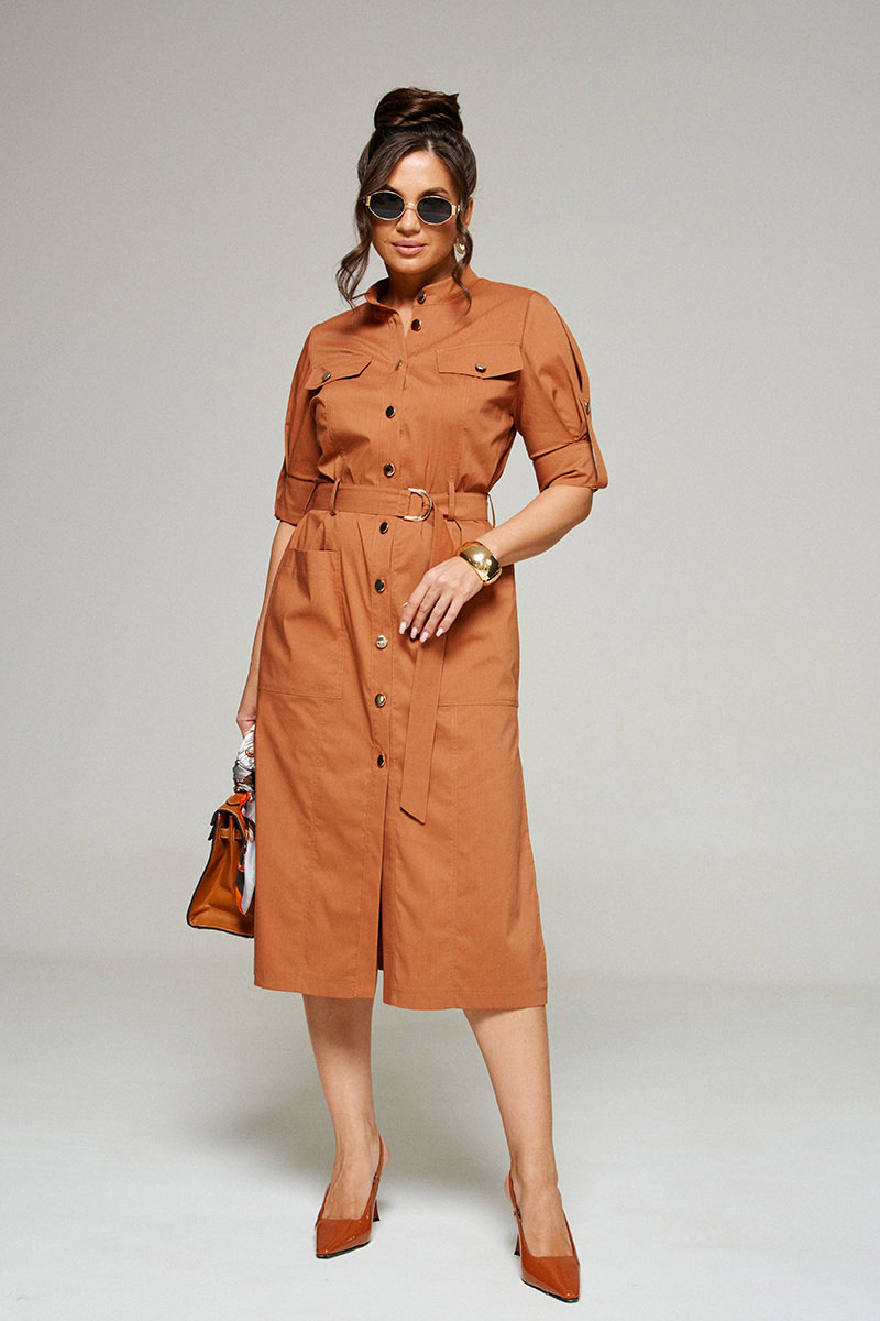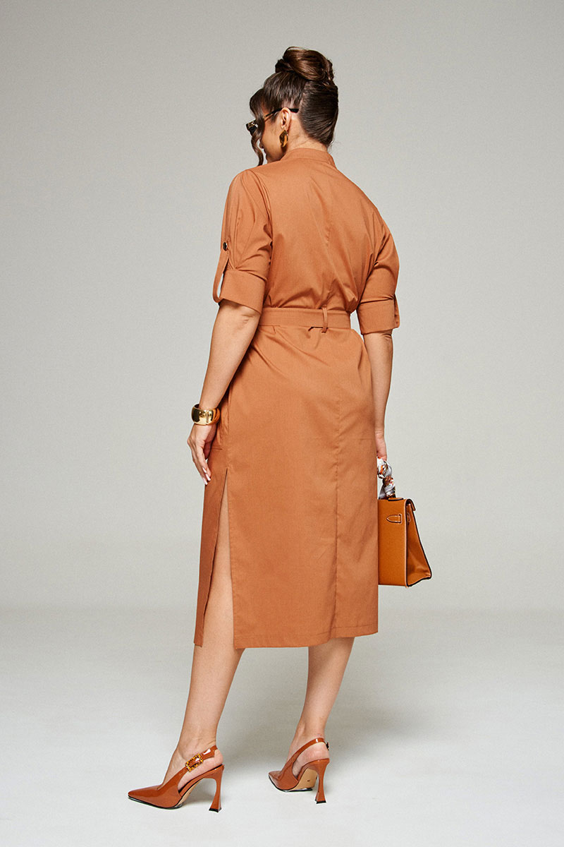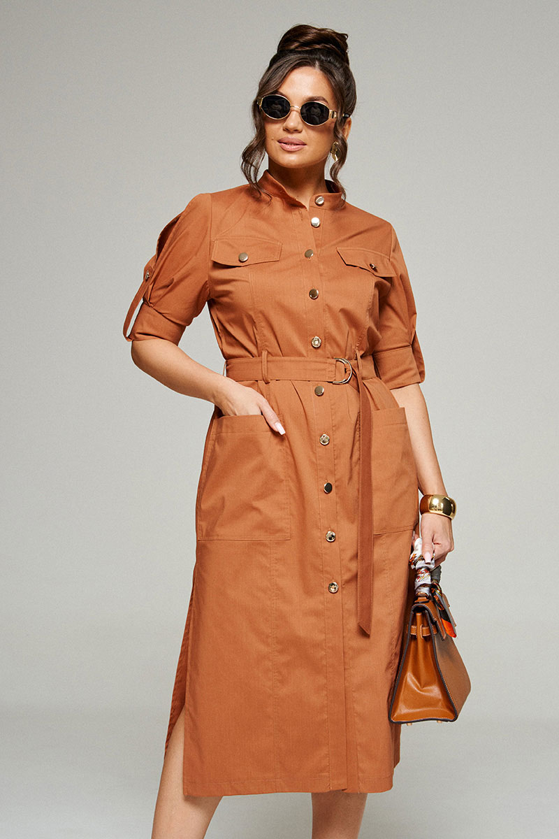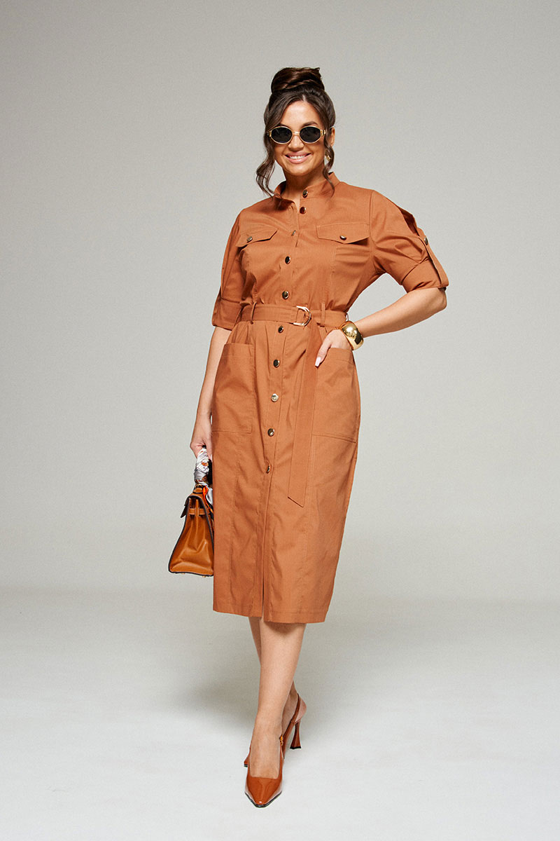 Платье женское полуприлегающего силуэта, длиной «миди», в строгом и практичном стиле «сафари» из смесового полотна с натуральным волокном – хлопок.