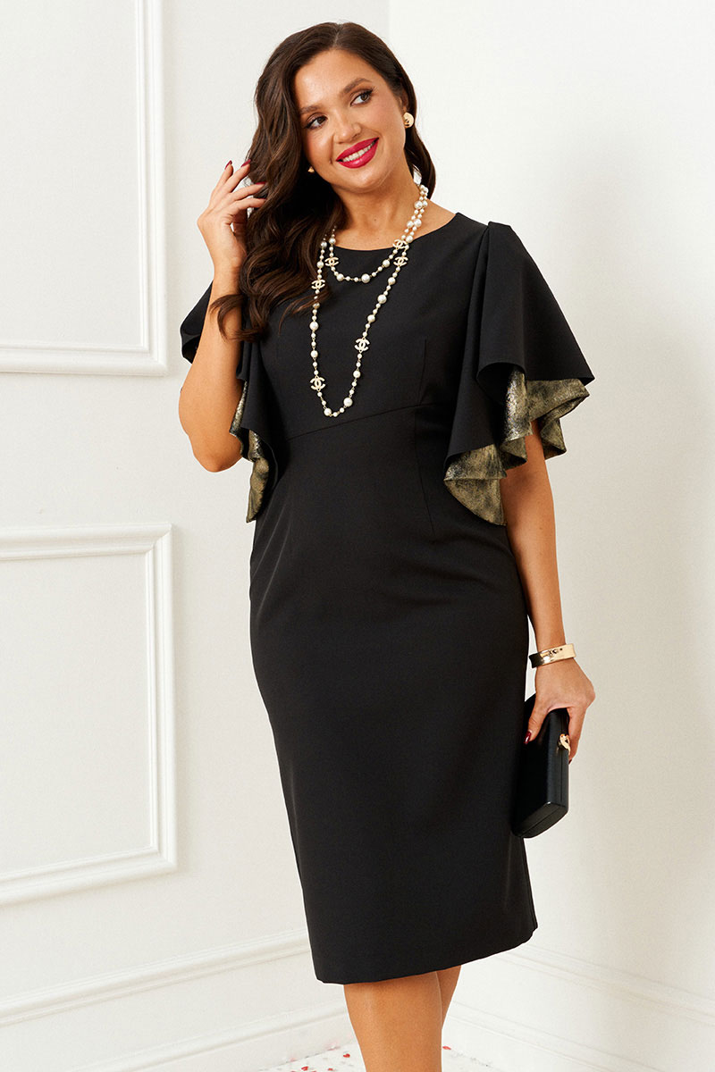 Платье женское прилегающего силуэта средней длины, выполнено из костюмно-смесового полотна с декоративной отделкой.