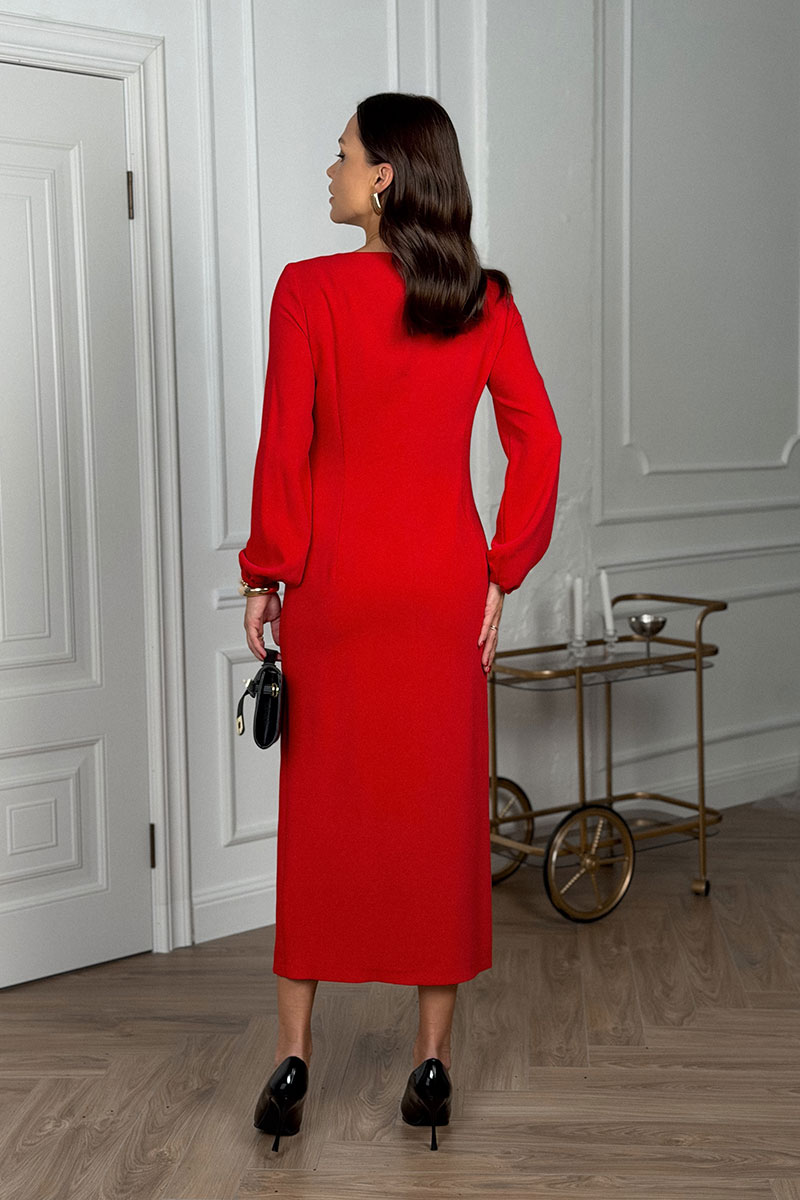 Платье женское, полуприлегающего силуэта, выполнено из плательной ткани высокого качества. В области талии декор в виде сложной драпировки. По переду платья - высокий разрез. Горловина округлой формы. Рукав втачной одношовный, по низу рукава небольшая сборка на эластичную ленту. В верхней части спинки разрез, застегивающийся на пуговицу, в боковом шве потайная молния. Данная модель платья - идеальное дополнение к гардеробу современной девушки.