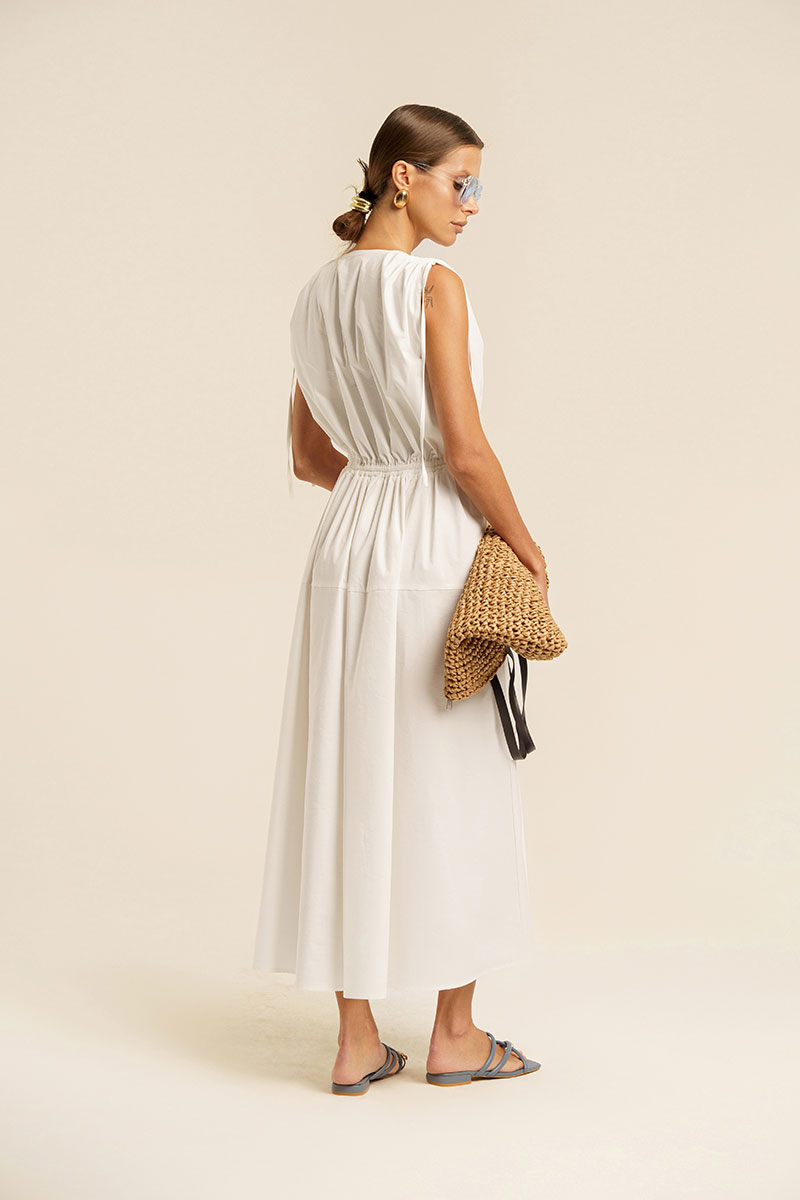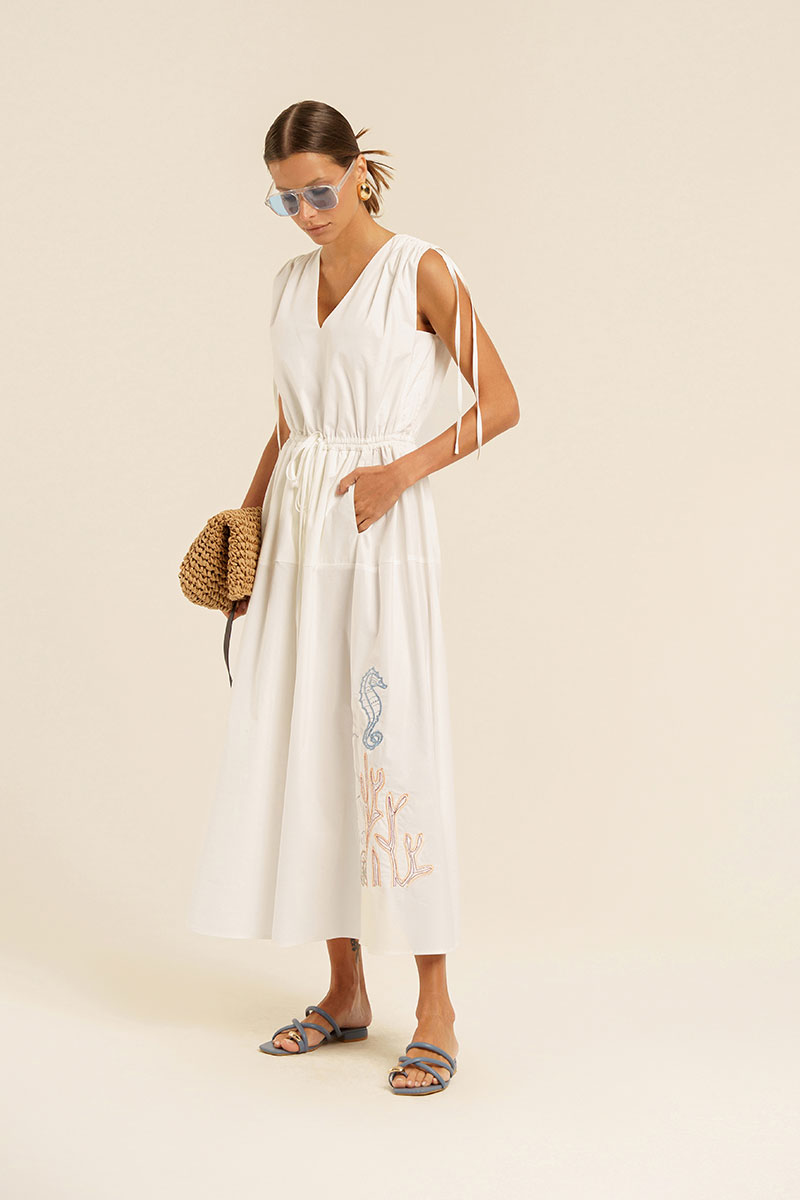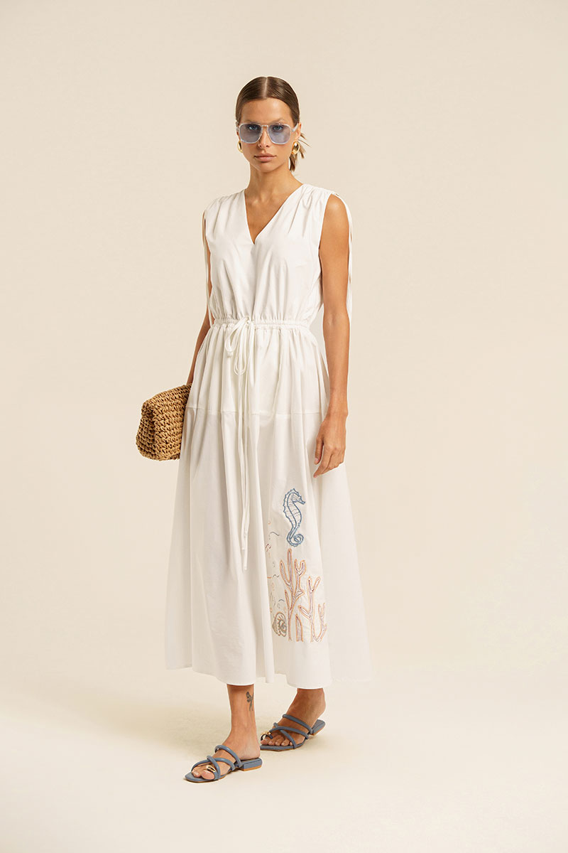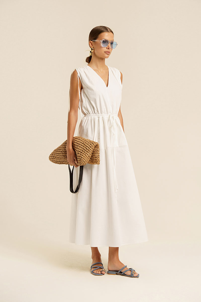 Платье женское приталенного силуэта из хлопковой ткани. Вырез горловины углубленный V-образной формы. Ширина линии плеч регулируется завязками. По линии талии также имеется функциональная кулиса, позволяющая регулировать длину обхвата талии.