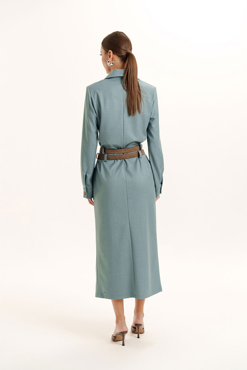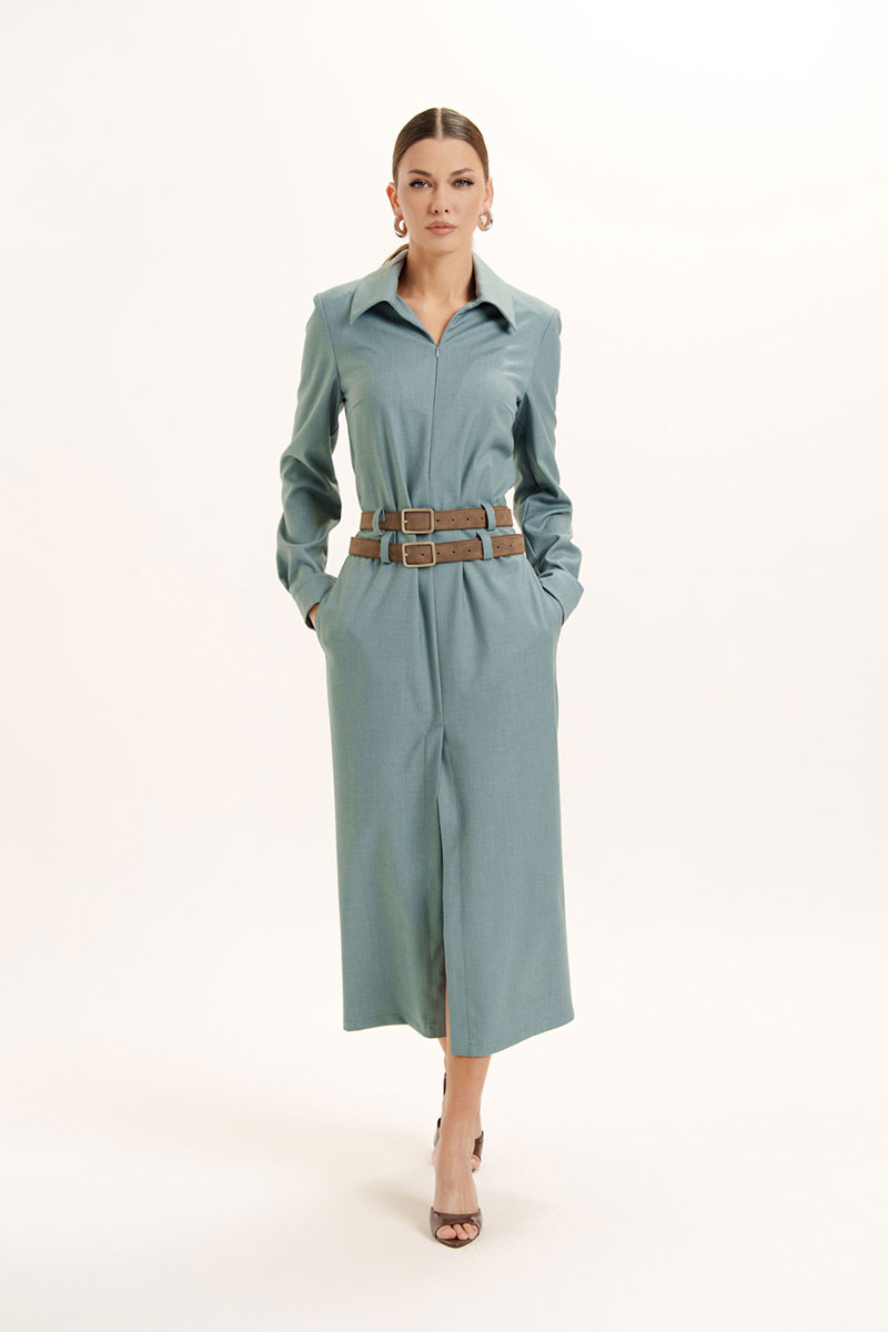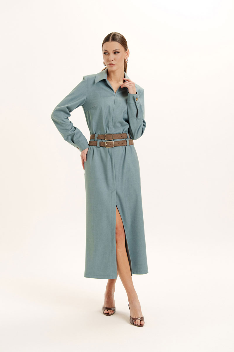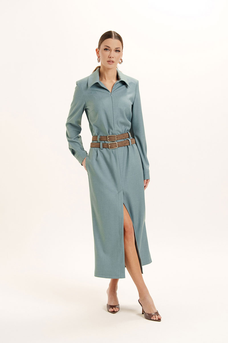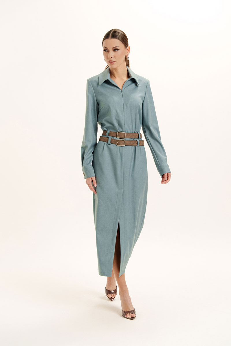 Платье женское прямого силуэта с воротником и застежкой по переду на потайную молнию. Рукав длинный на манжете с застежкой на петлю и пуговицу. В боковых швах обработаны карманы. По центру переда обработан разрез. На изделие пришиты шлевки. Платье декорировано съемными поясами. Отделочная фурнитура может меняться.