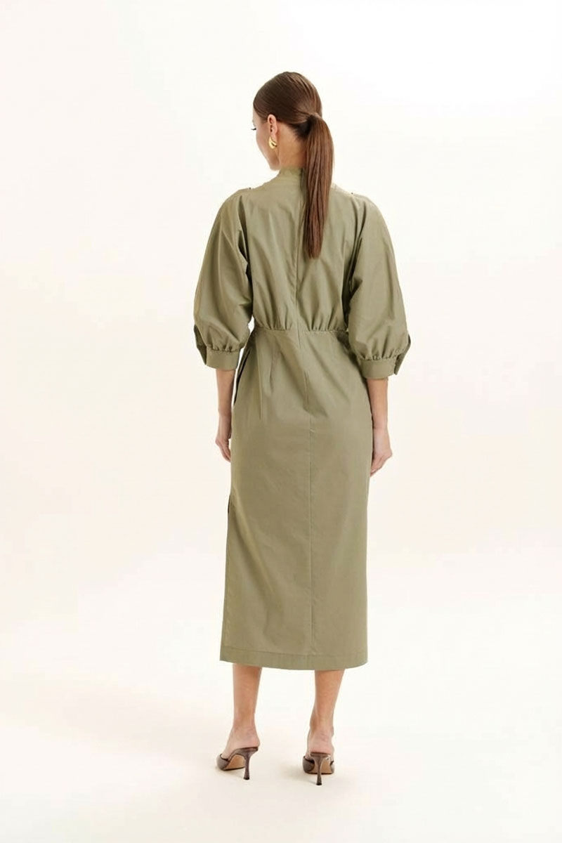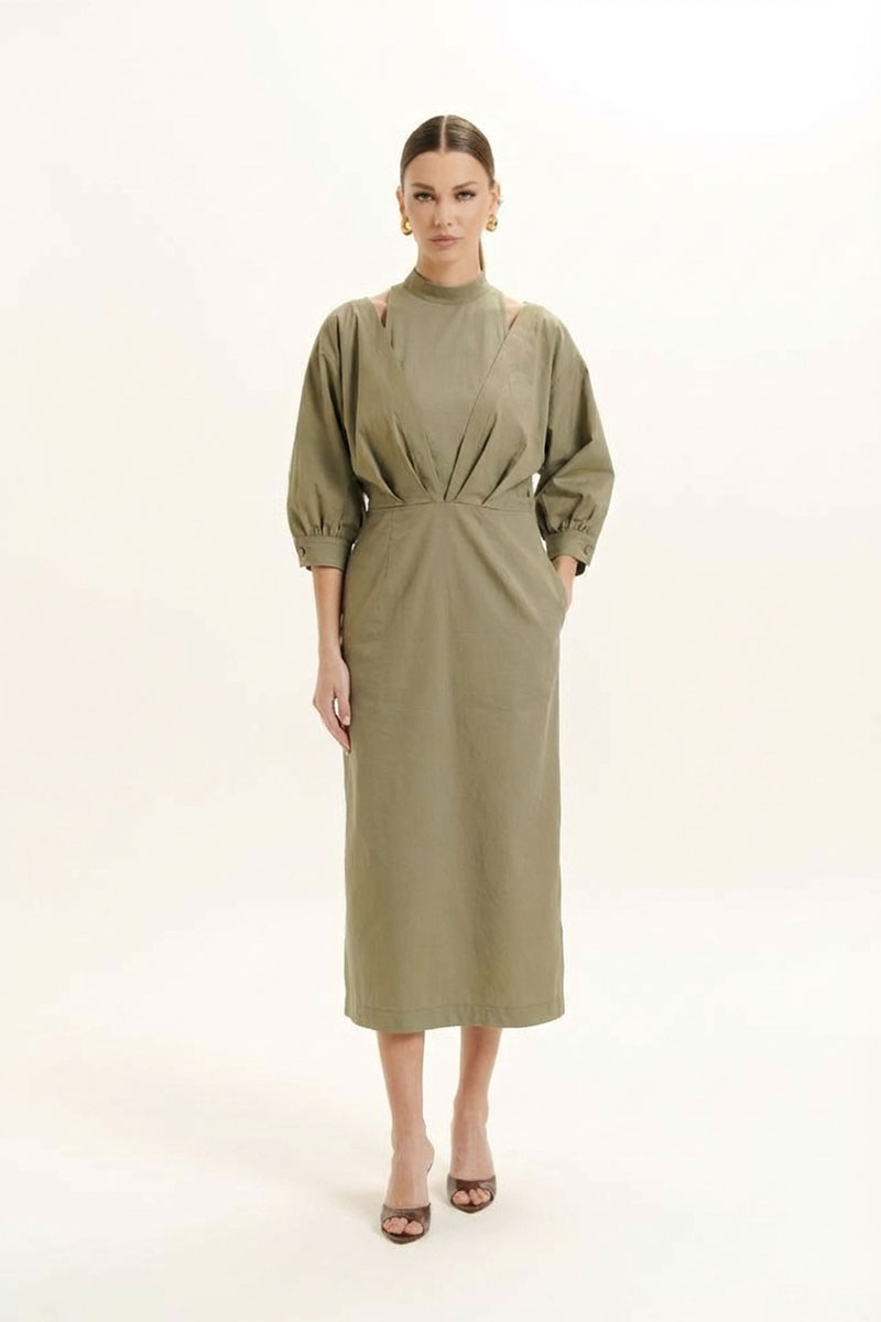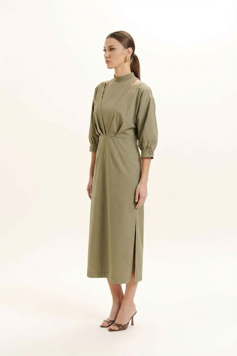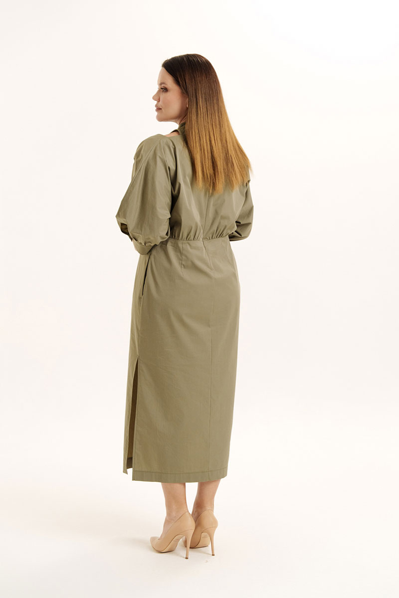 Красивое, стильное и элегантное платье прямого силуэта выполнено из хлопкового полотна и элит трикотажа. Модель платья классика с рукавом 3/4 ЛЕТУЧАЯ МЫШЬ, низ рукава на манжете. Горловина оформлена воротником - стойка из отделочной ткани с застежкой по спинке на потайную молнию , что делает платье универсальным нарядом в гардеробе любой женщины или девушки. На платье обработан подрез со складками. По боковому шву разрез.