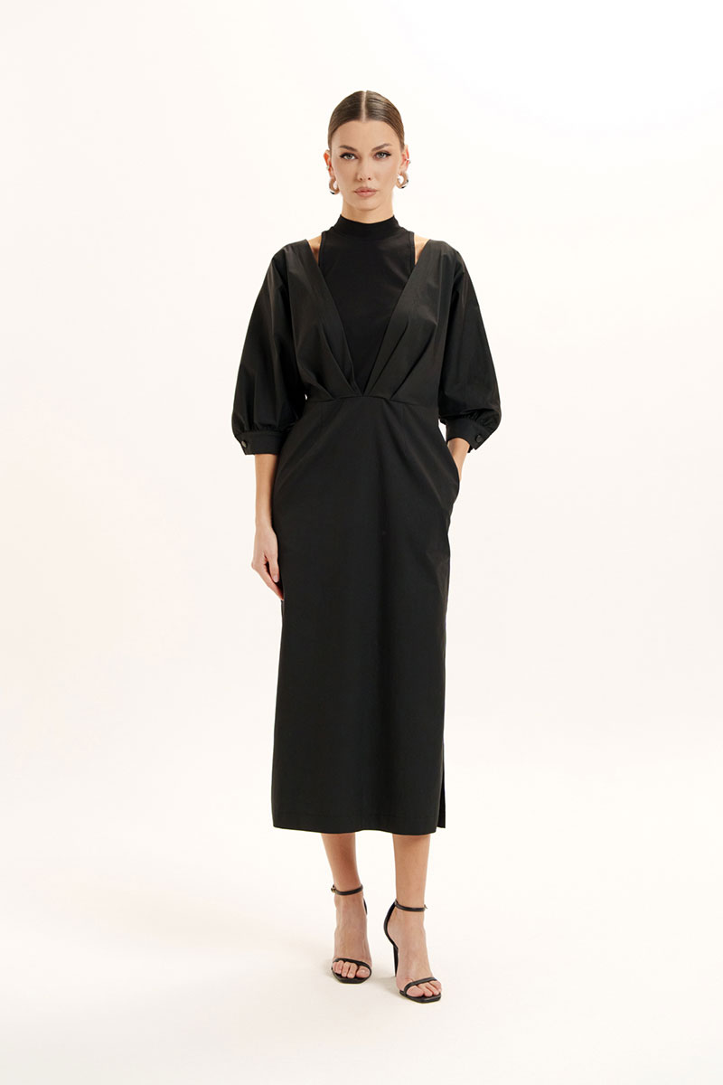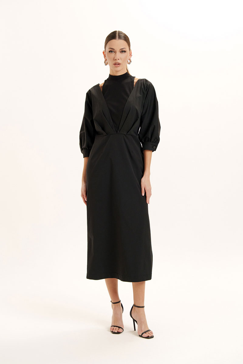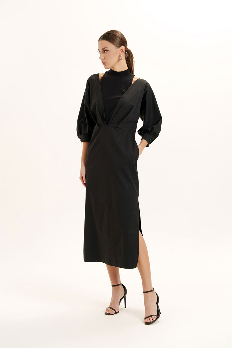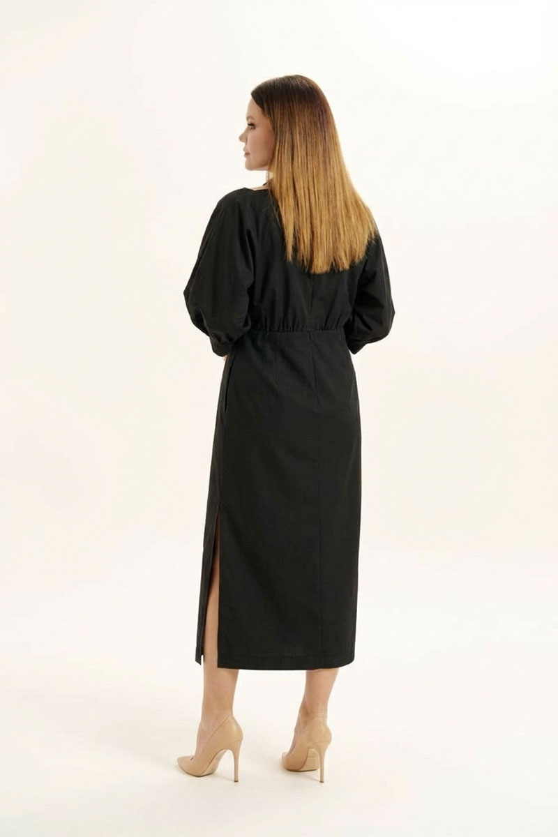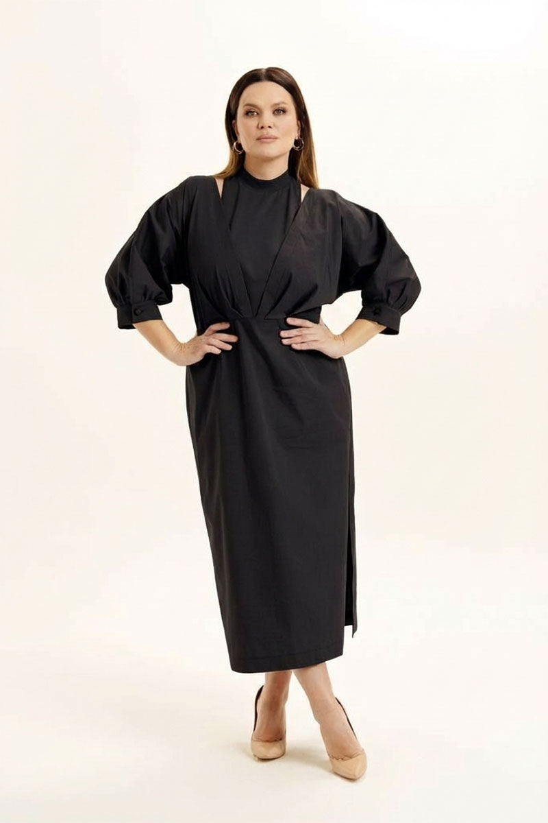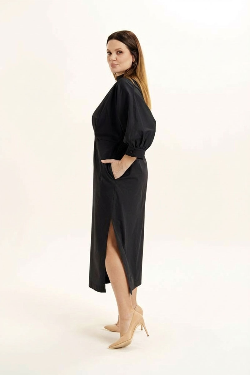 Красивое, стильное и элегантное платье прямого силуэта выполнено из хлопкового полотна и элит трикотажа. Модель платья классика с рукавом 3/4 ЛЕТУЧАЯ МЫШЬ, низ рукава на манжете. Горловина оформлена воротником - стойка из отделочной ткани с застежкой по спинке на потайную молнию , что делает платье универсальным нарядом в гардеробе любой женщины или девушки. На платье обработан подрез со складками. По боковому шву разрез.