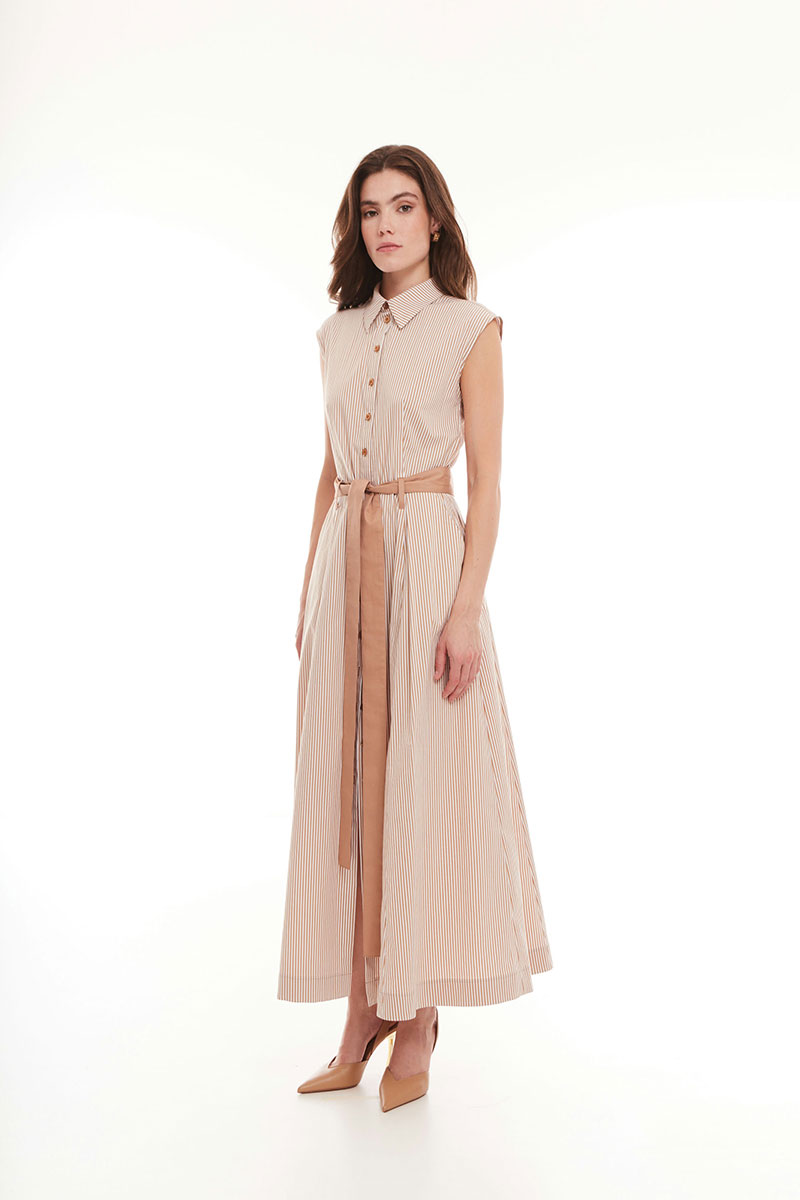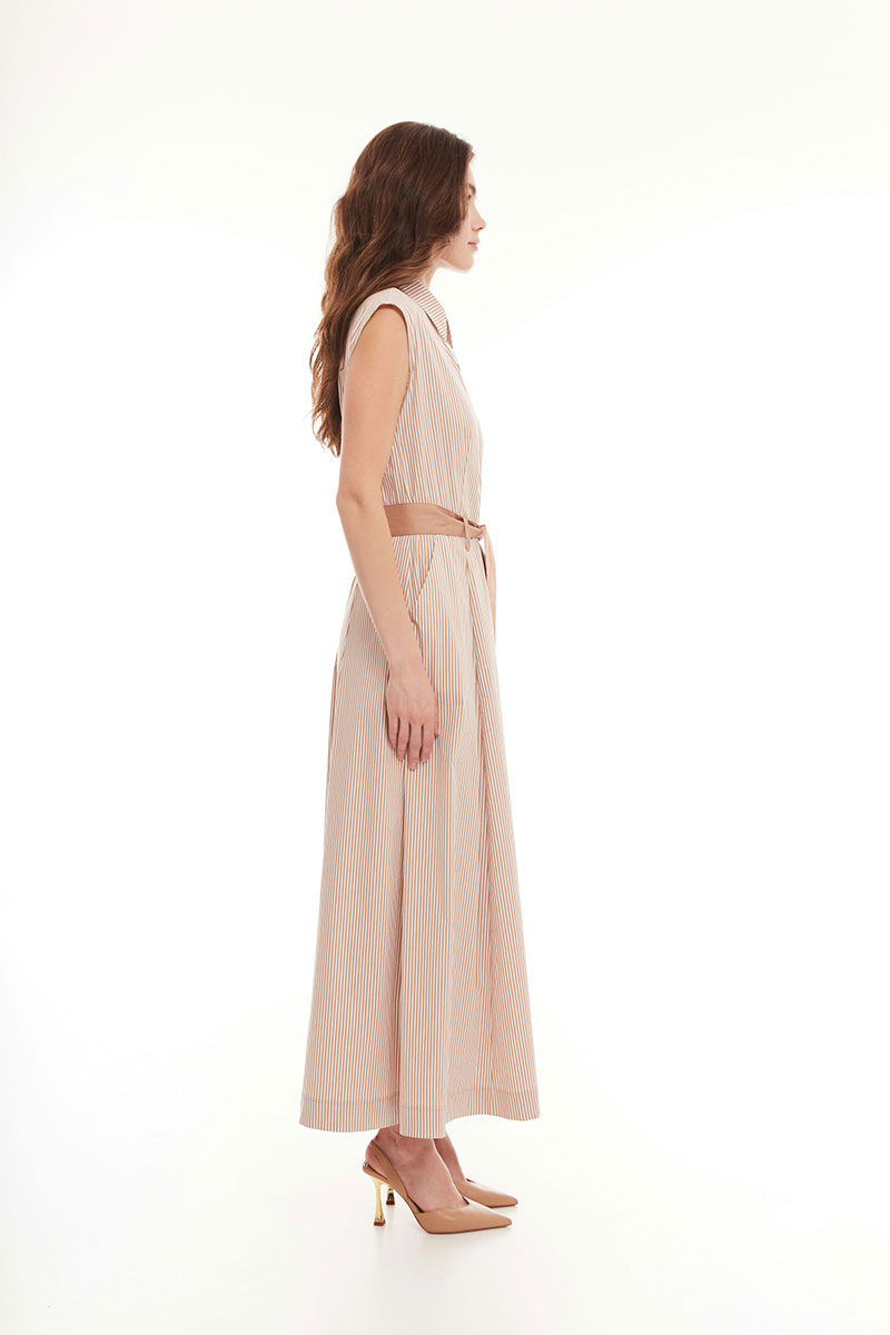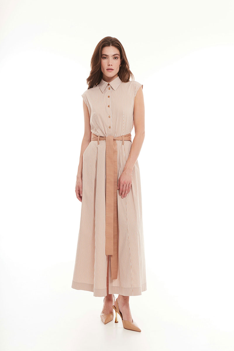 Платье женское, отрезное по линии талии, длиной по щиколотку. Воротник рубашечный. На переде и спинке по талии заложены складки. По переду застежка на петли и пуговицы. Плечо спущенное, без рукава. Карманы наклонные в боковых швах. В комплекте пояс.