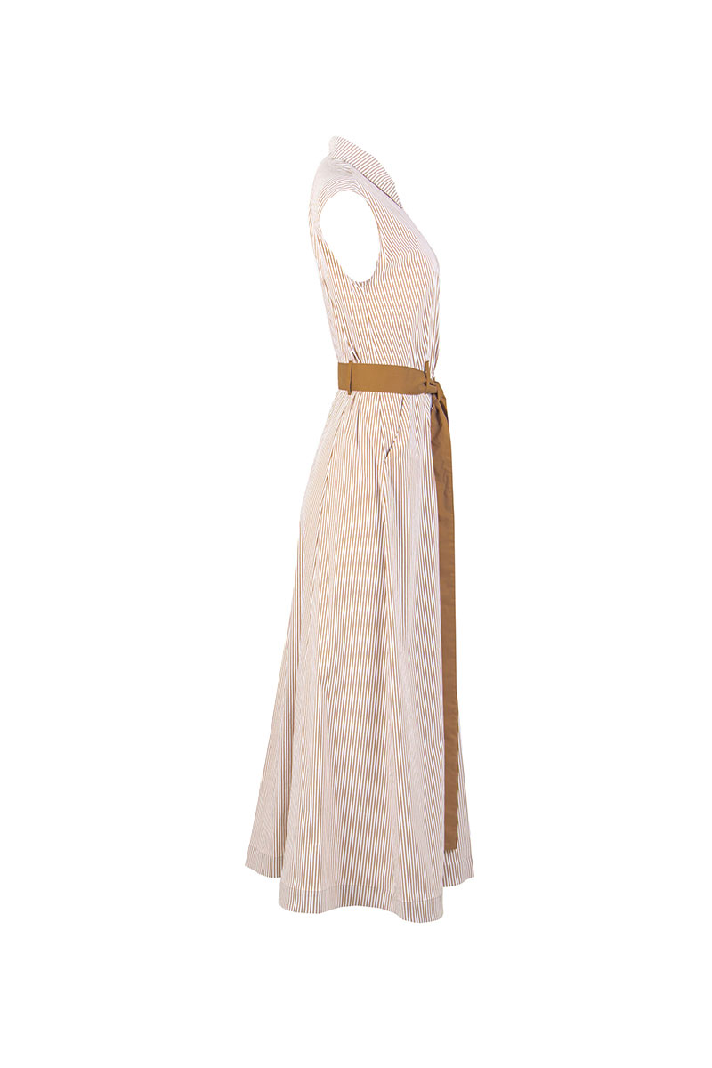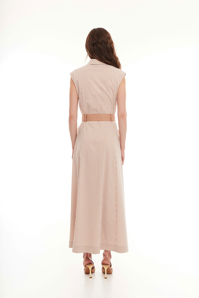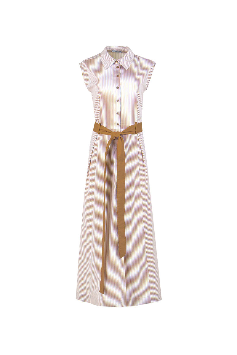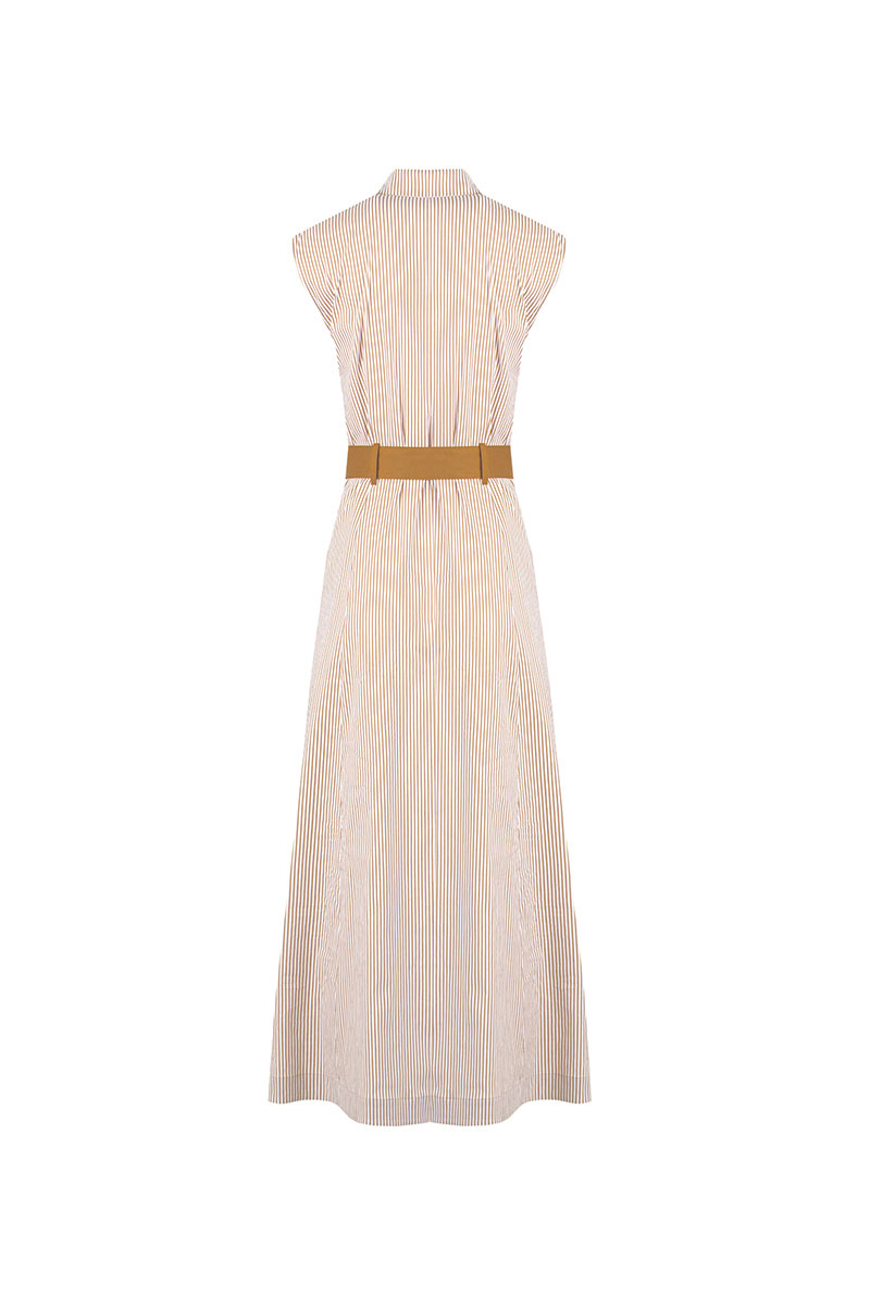 Платье женское, отрезное по линии талии, длиной по щиколотку. Воротник рубашечный. На переде и спинке по талии заложены складки. По переду застежка на петли и пуговицы. Плечо спущенное, без рукава. Карманы наклонные в боковых швах. В комплекте пояс.