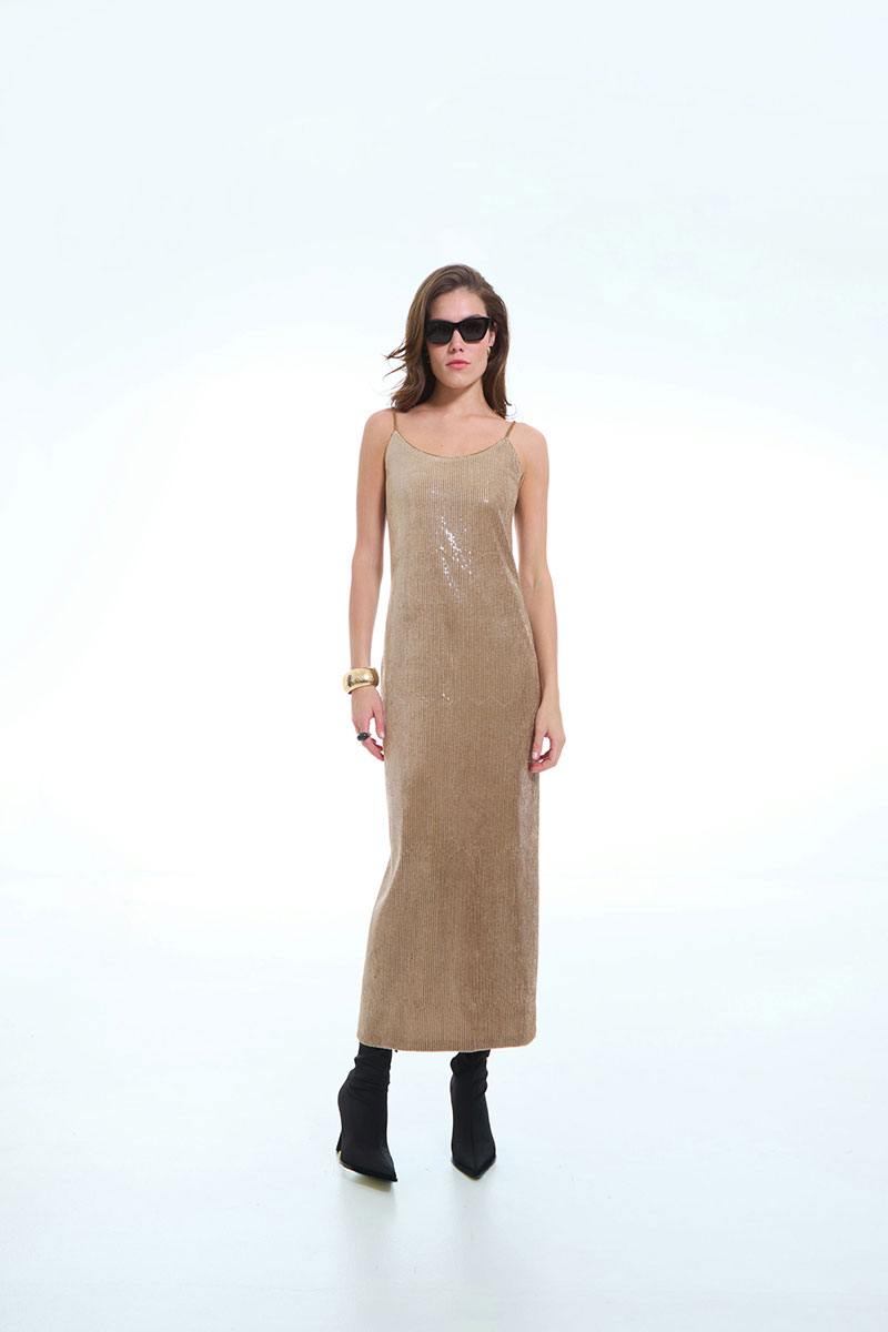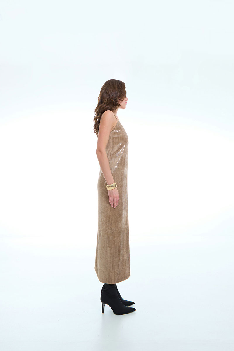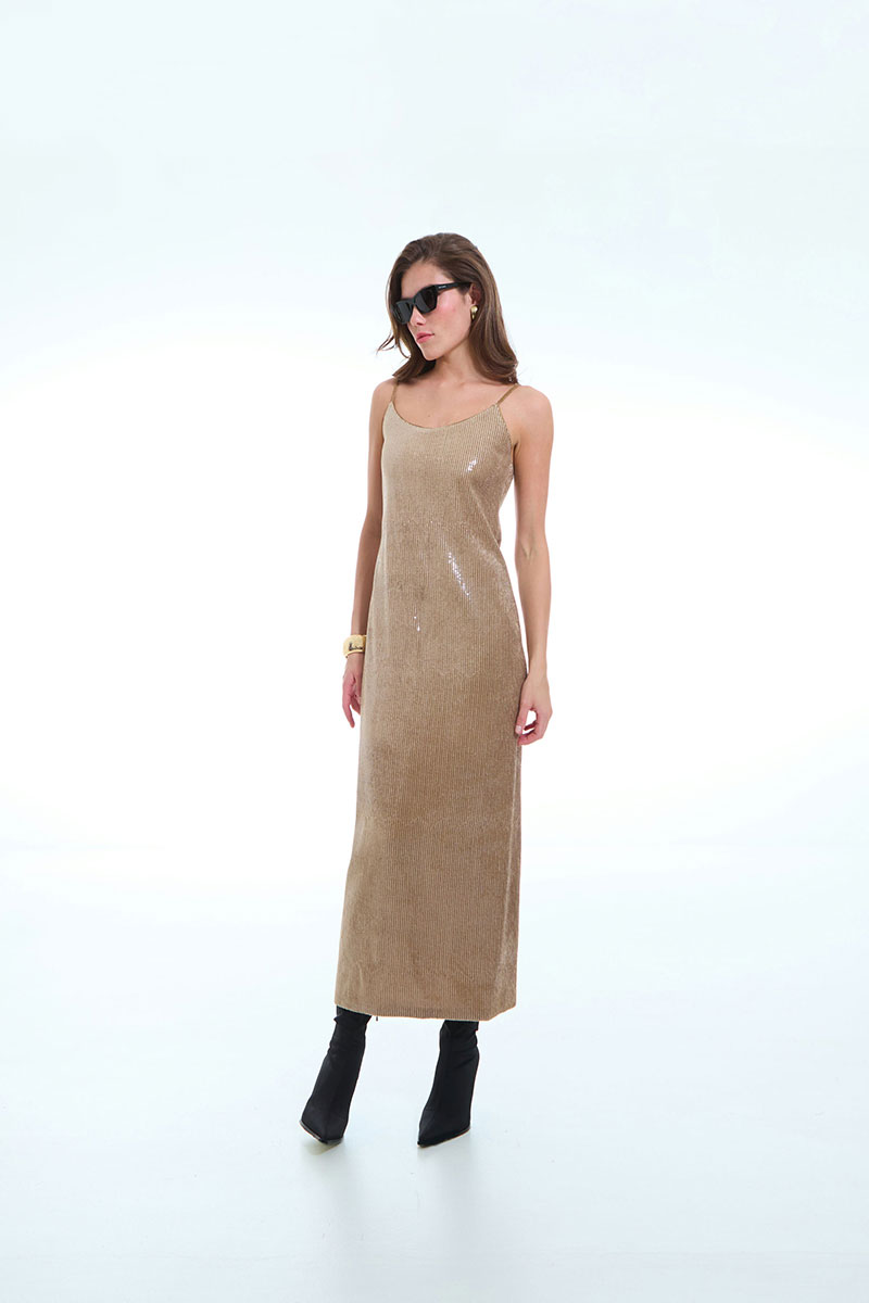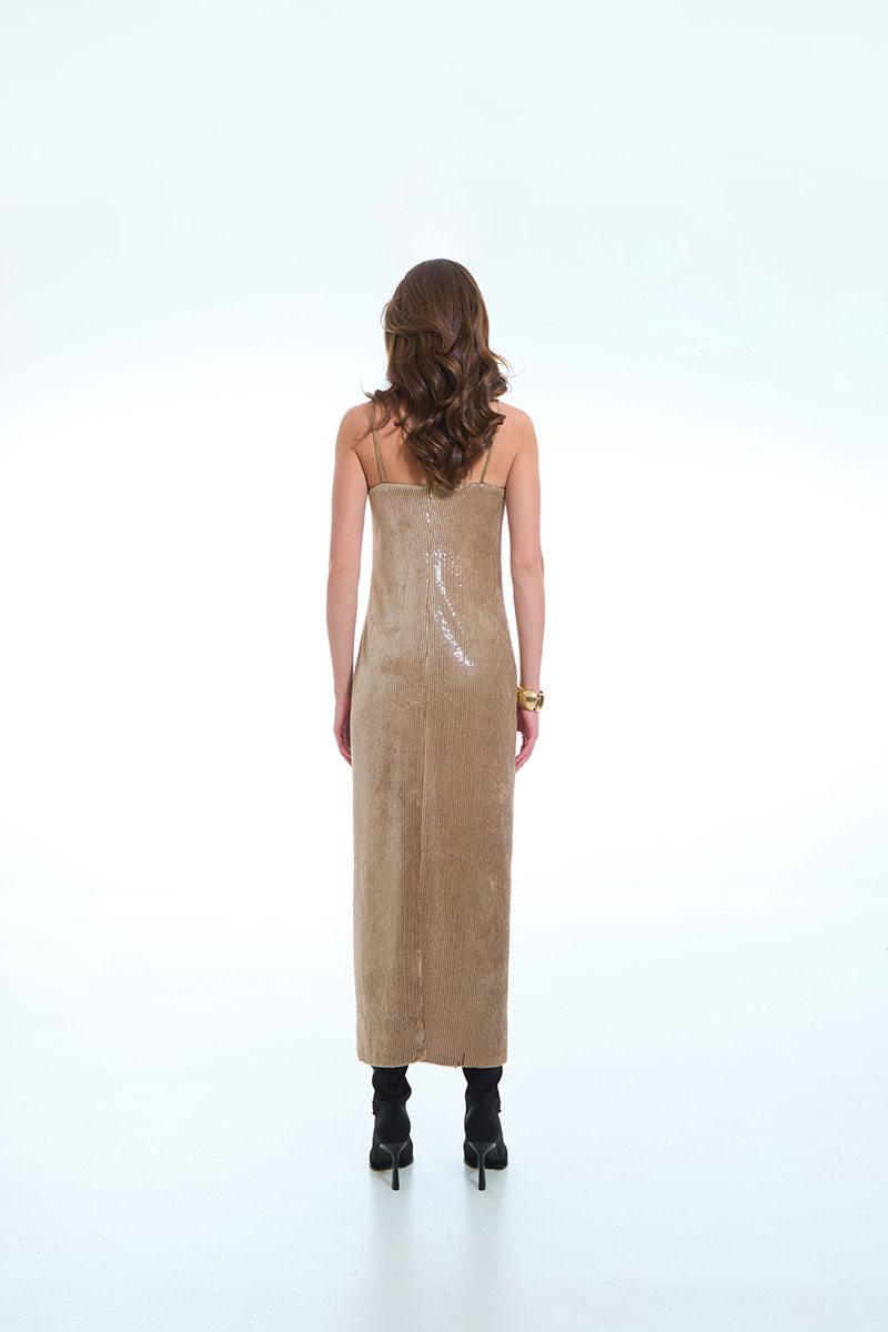Платье женское прилегающего силуэта, длинное, из трикотажного полотна с пайетками, на подкладке. По спинке застежка на потайную молнию. Платье на бретелях, бретели регулируются.