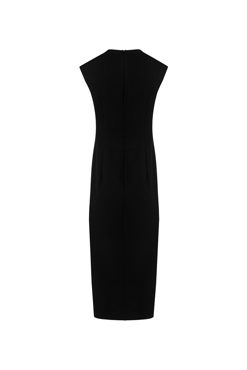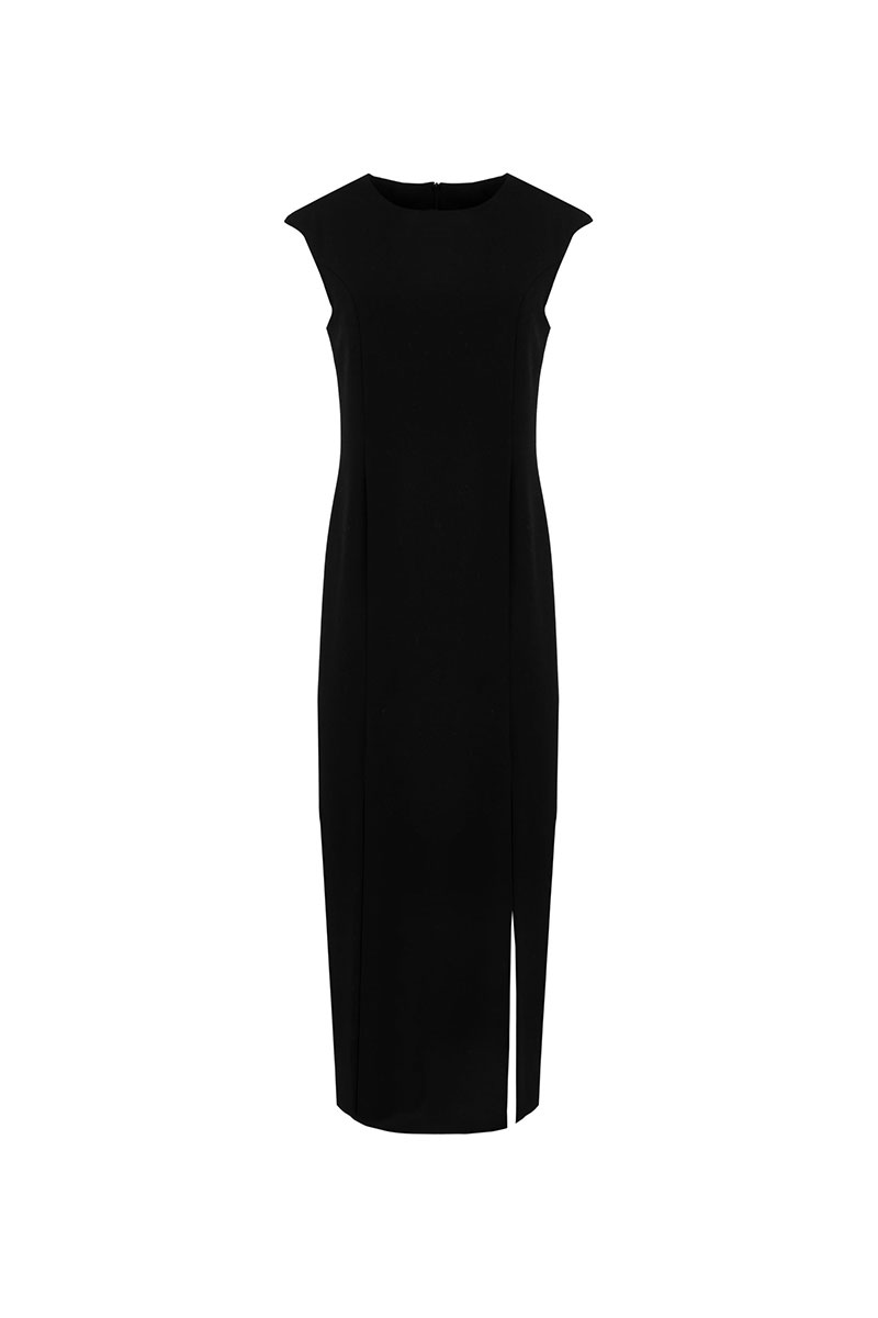 Элегантное женское платье прилегающего силуэта подчеркивает изгибы фигуры и создаёт утончённый, современный образ. Длинная модель без рукавов дополнена выразительными плечевыми накладками, придающими силуэту лёгкую структурированность и графичность. На передней части платья расположен стильный боковой разрез, добавляющий образу динамики и соблазнительной изюминки. Застёгивается платье с помощью потайной молнии, аккуратно вшитой в средний шов спинки, что обеспечивает гладкий и безупречный силуэт. Идеальный выбор для особых случаев и вечерних выходов.