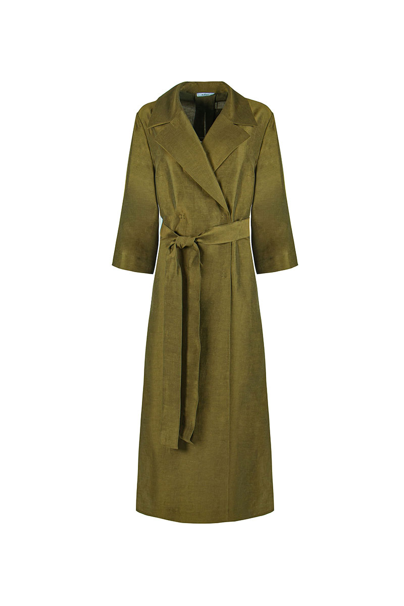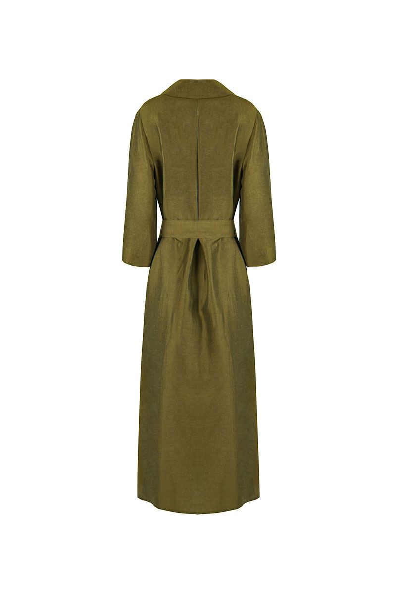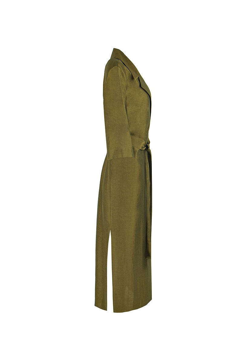 Платье миди прямого силуэта с изящной двубортной застежкой, обрамленным воротником и лацканом, придаёт образу деловую элегантность. Особенности модели включают цельнокроеную спинку с встречной складкой в верхней части, короткий втачной рукав и разрезы в нижней части боковых швов, придающие платью легкость движения. Дополнительным акцентом служит пояс, который завершает стильный образ и подчеркивает женственные линии фигуры.