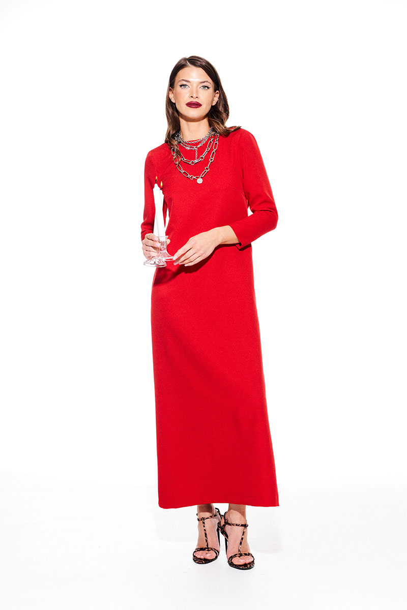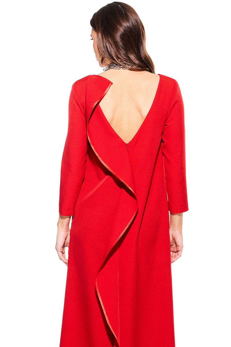 Платье из костюмно-плательной ткани, умеренного объема, прямого силуэта, с застежкой на потайную молнию в среднем шве спинки. Перед с круглым вырезом горловины и нагрудными вытачками. Спинка с V-образным вырезом горловины, средним швом и разрезом. Вырез горловины и средний шов спинки оформлены воланом. Рукав 3/4, втачной, одношовный. Длина платья до щиколотки.