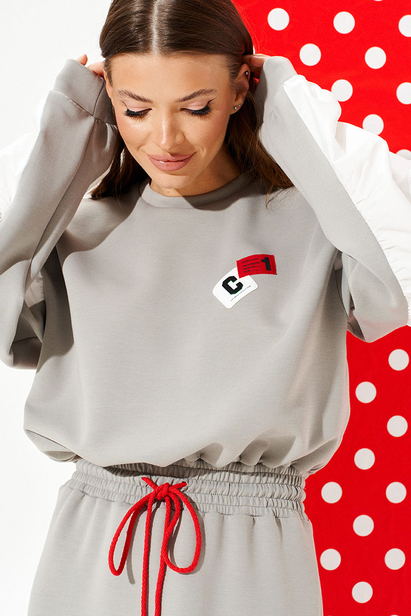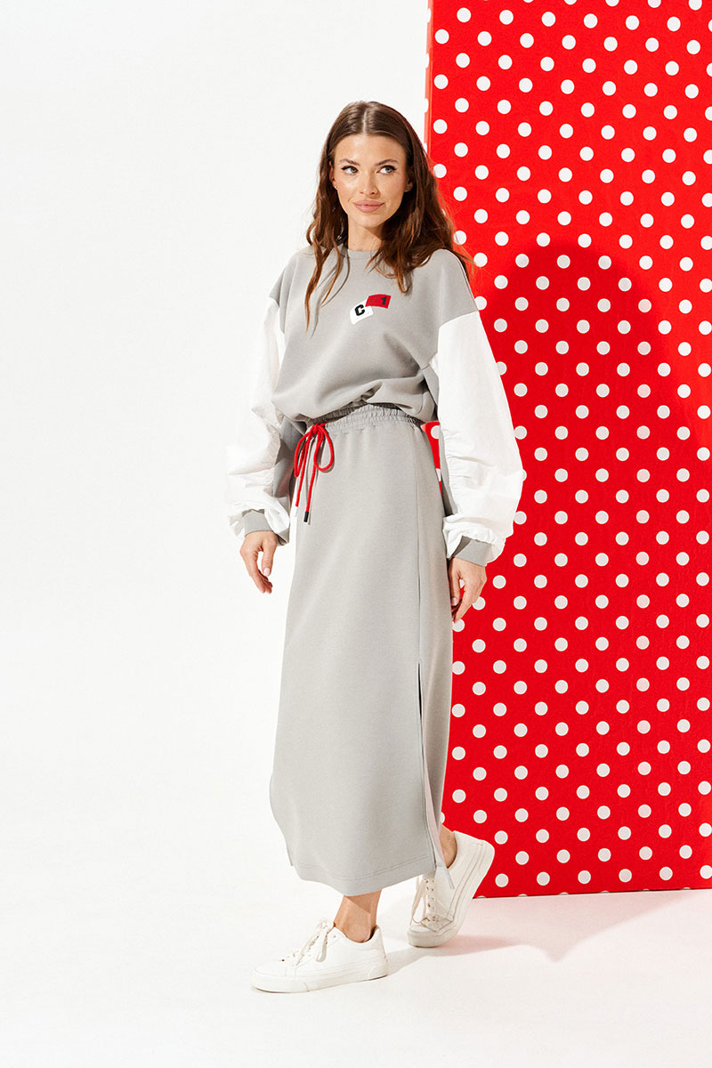 Платье из трикотажного полотна умеренного объема, приталенного силуэта, отрезное по линии талии, с круглым вырезом горловины. Верхняя деталь переда декорирована двумя настрочными нашивками. Нижняя деталь спинки со средним швом. Боковые швы заканчиваются разрезами. Пояс притачной, на резинке. По поясу проложены отделочные строчки, образующие кулиску, в которую продет декоративный шнур-завязка с наконечниками. Рукав втачной, трехшовный, длинный. Рукав со вставкой из контрастной ткани со сборкой по швам притачивания детали к рукаву. Нижний срез рукава обработан манжетой.