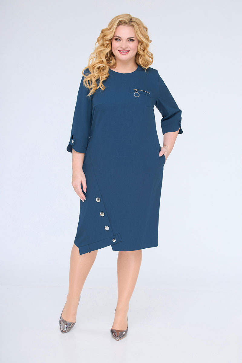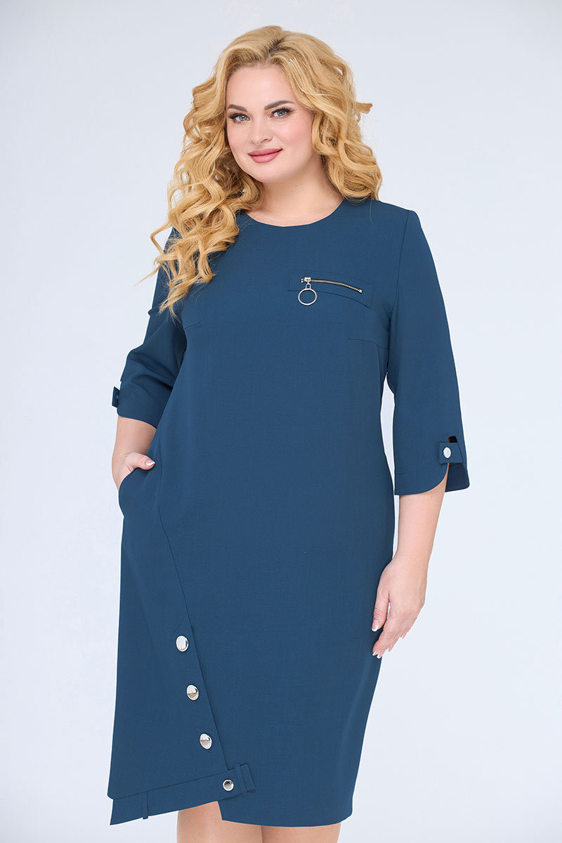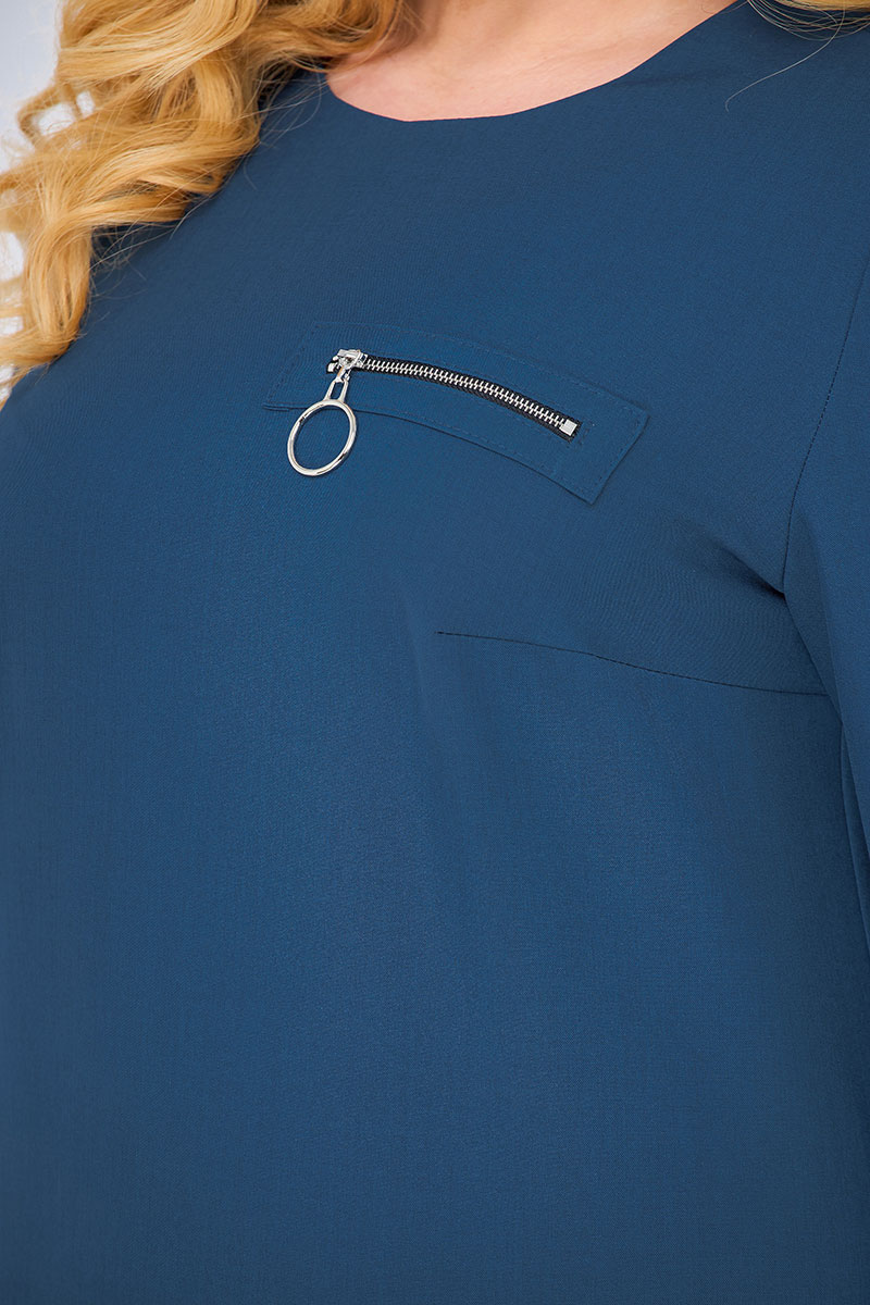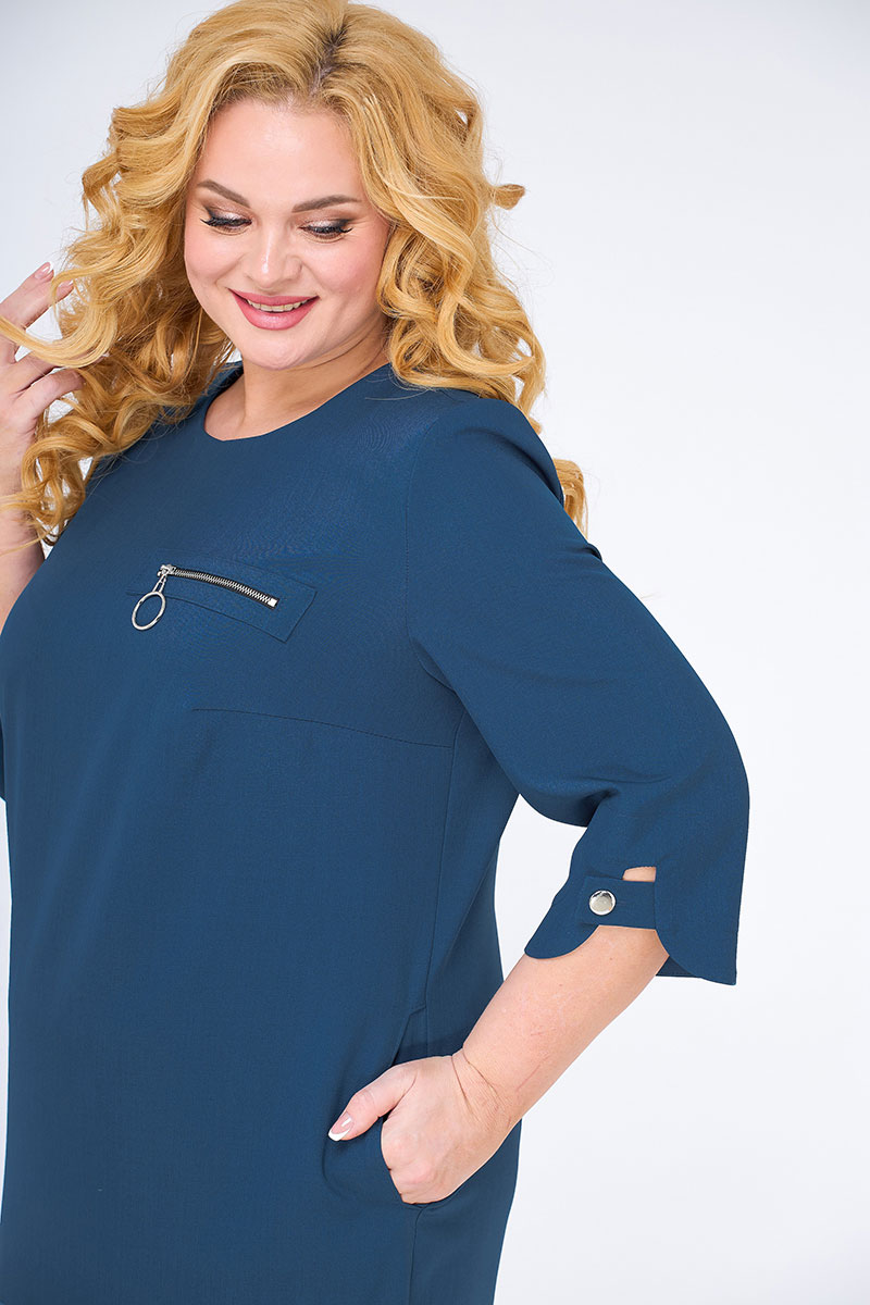 Платье прямого силуэта, слегка зауженное к низу. На полочке нагрудные вытачки. В верхней левой части полочки декоративная нашивка с молнией. Горловина круглая, обтачная в среднем шве спинки застежка-молния, на спинке рельефные вытачки. Рукав втачной, одношовный. Низ рукава фигурный. В боковых швах функциональные карманы. Низ изделия ассимметричный, с фантазийным дизайнерским решением. Такое плате способно превратить даже будни в праздник.
