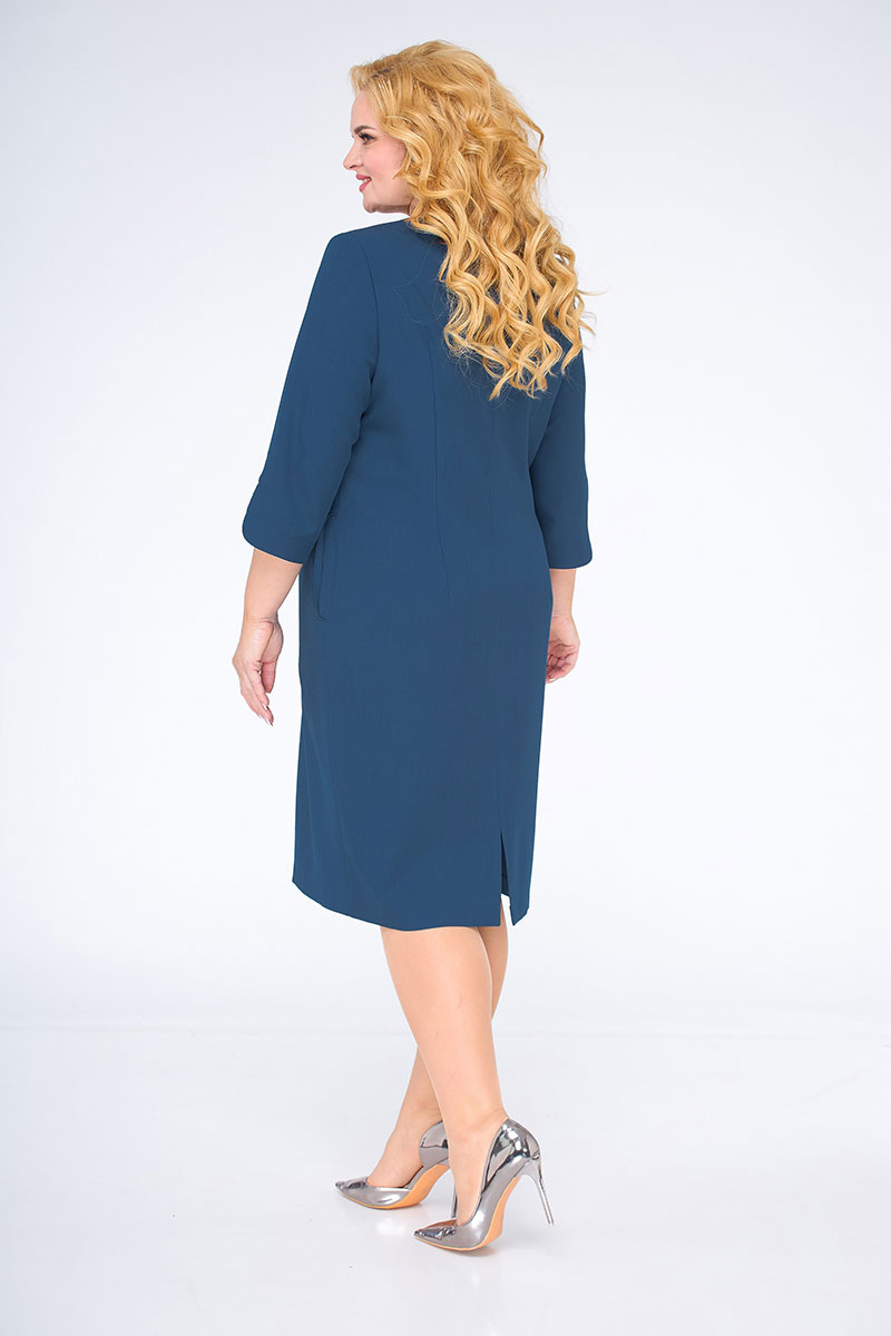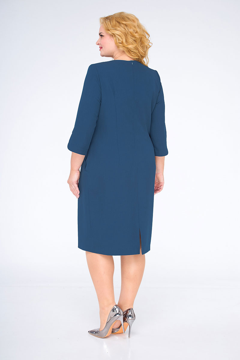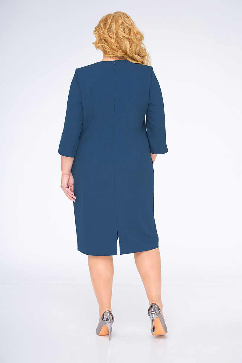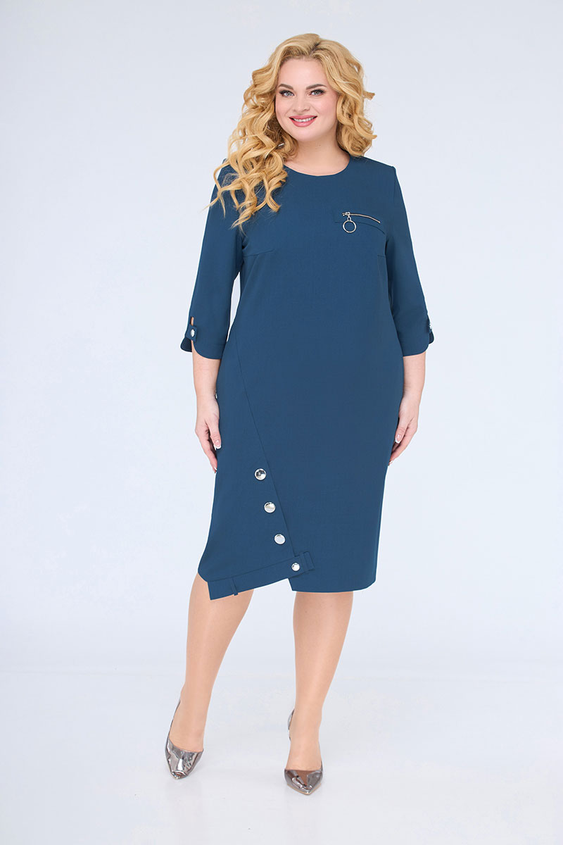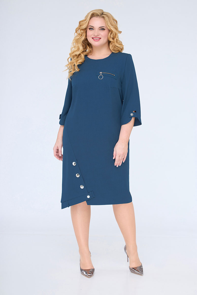 Платье прямого силуэта, слегка зауженное к низу. На полочке нагрудные вытачки. В верхней левой части полочки декоративная нашивка с молнией. Горловина круглая, обтачная в среднем шве спинки застежка-молния, на спинке рельефные вытачки. Рукав втачной, одношовный. Низ рукава фигурный. В боковых швах функциональные карманы. Низ изделия ассимметричный, с фантазийным дизайнерским решением. Такое плате способно превратить даже будни в праздник.