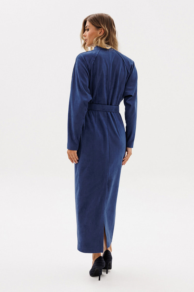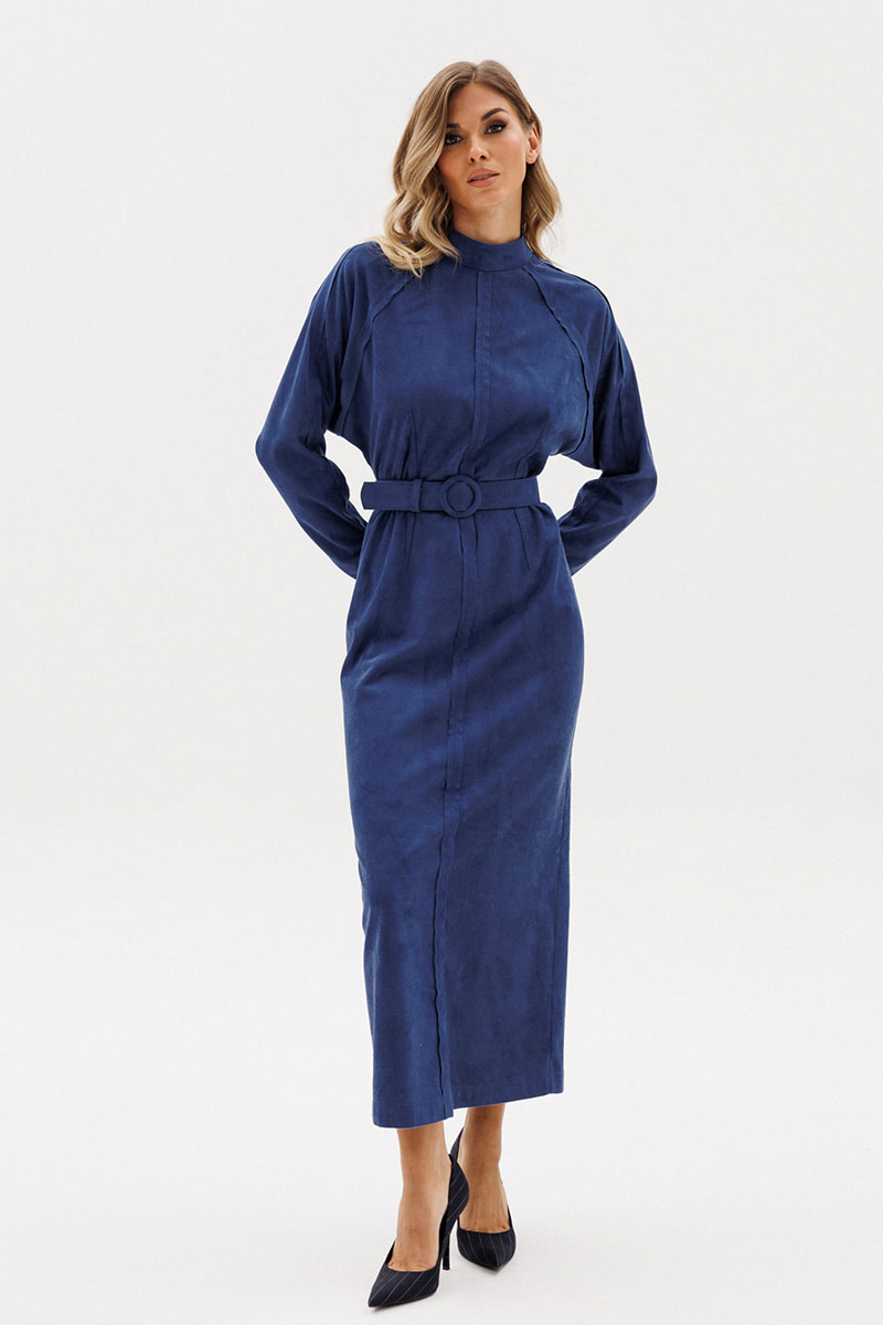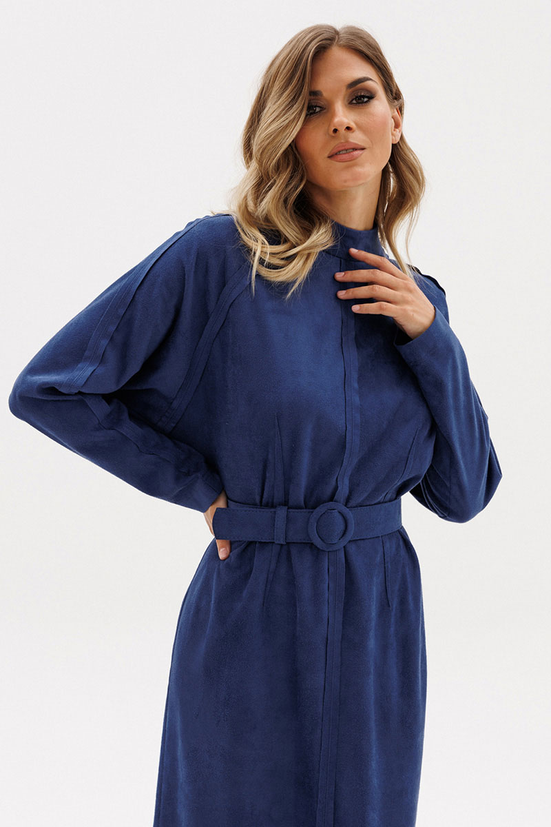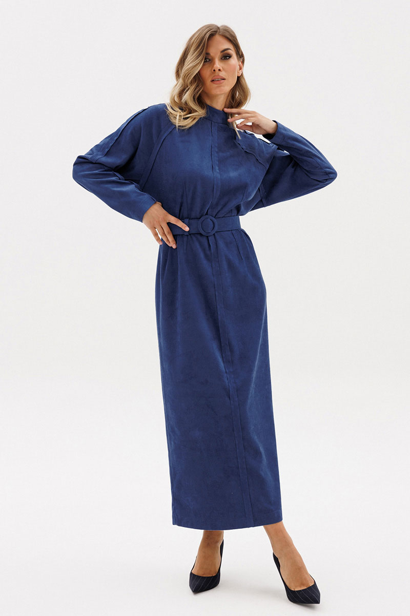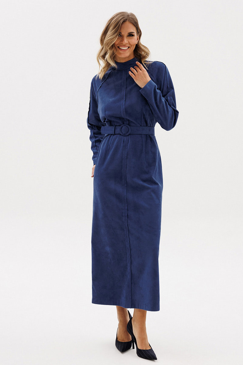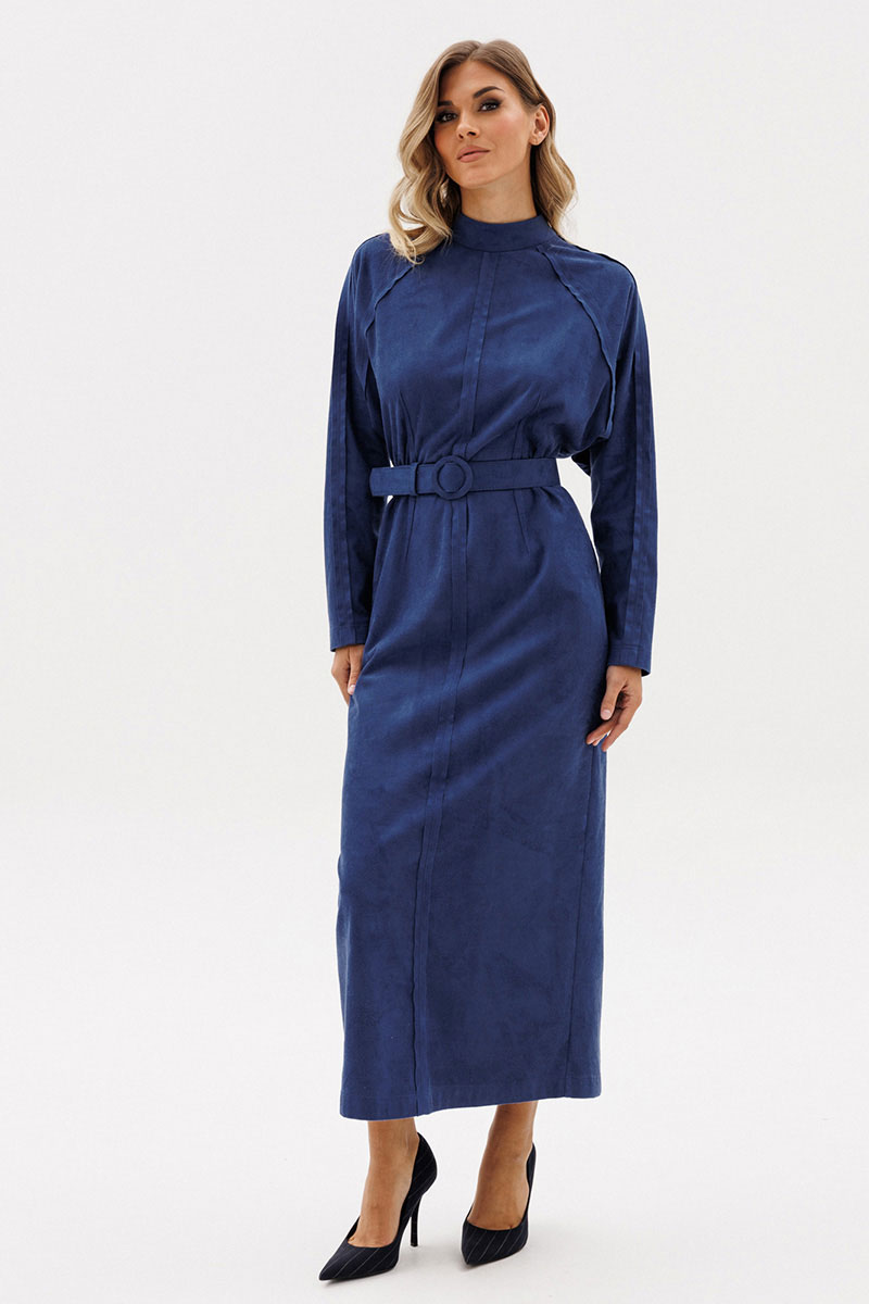 Платье выполнено из тонкой искуственной замши. Платье полуприлегающего силуэта, длиной миди. Платье отрезное по линии талии. Спереди и на спинке талиевые вытачки и средний шов. Застежка на потайную молнию в среднем шве спинки. Воротник-стойка. Рукав покроя реглан. Средний шов переда, талиевые вытачки, верхний шов рукава и линии реглана обработаны "на лицо". В комплект входит съемный ремень из основной ткани с обтяжной пряжкой.
