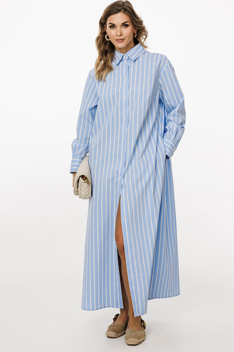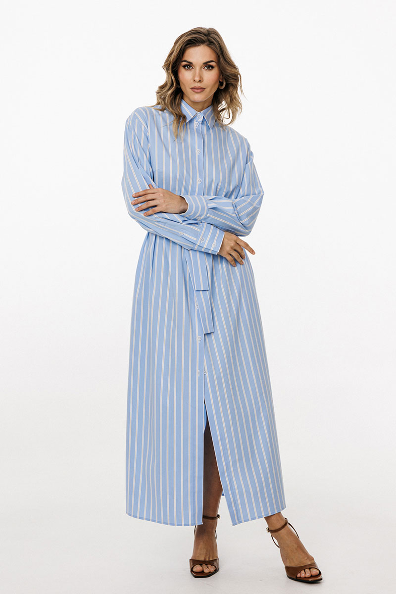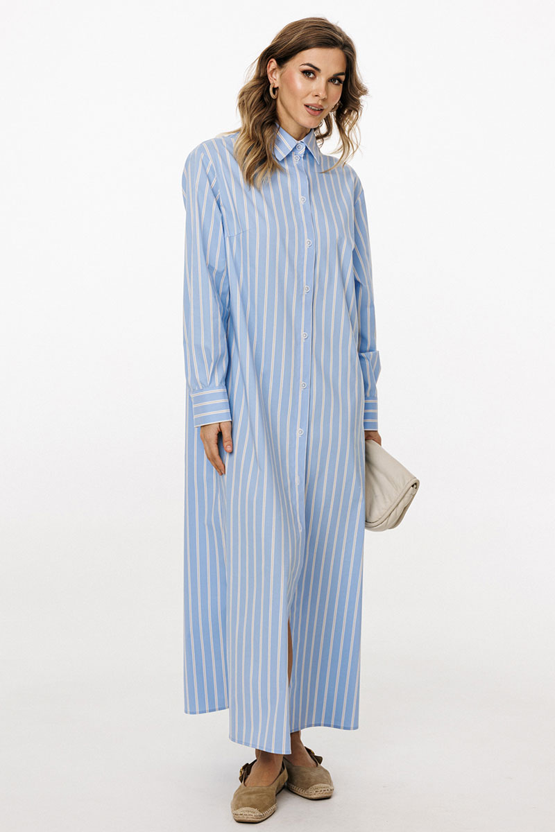 Платье выполнено из плательно-блузочной ткани в полоску. Платье прямого силуэта, длиной до линии щиколотки. По переду центральная застежка до верха с цельнокроеной планкой. На спинке обработаны кокетка и две складки от неё. Горловина округлой формы, обработана стояче-отложным воротником с отрезной стойкой. Плечевой шов удлинен. Рукав рубашечного покроя, одношовный, с двумя складками и обтачкой прорези по низу. Низ рукава обработан притачной манжетой, застегивающейся на две петли и пуговицы. В боковых швах обработаны карманы и разрезы.