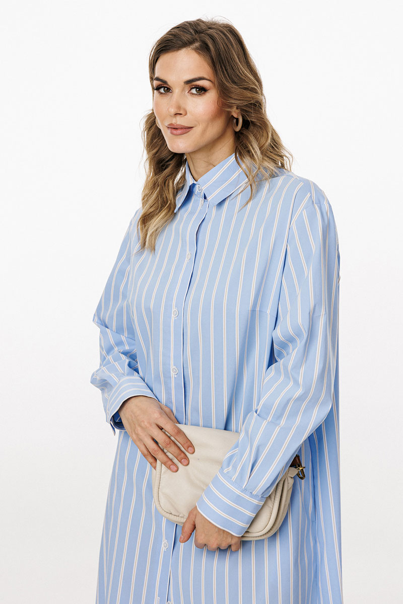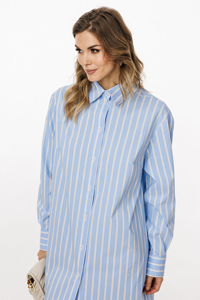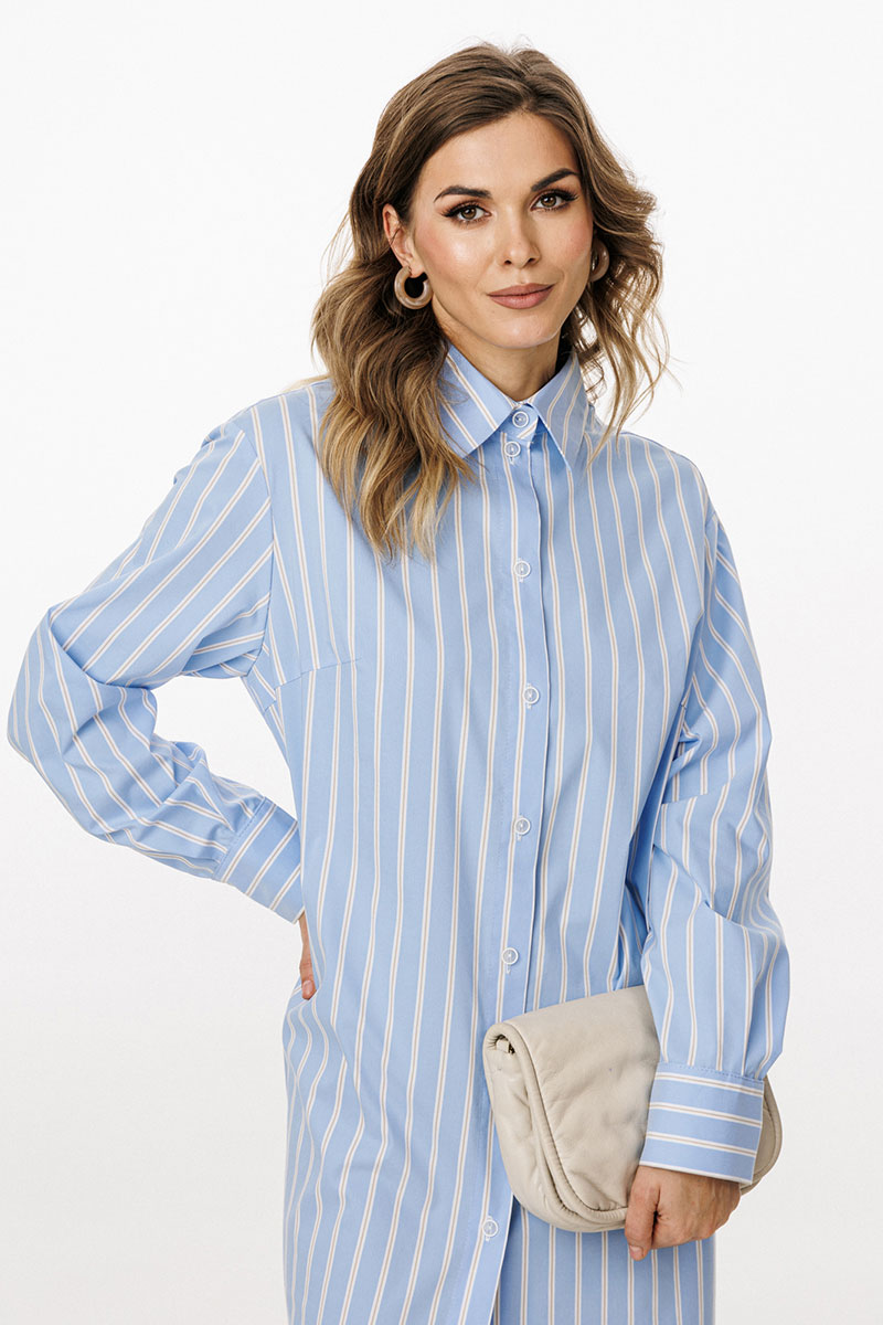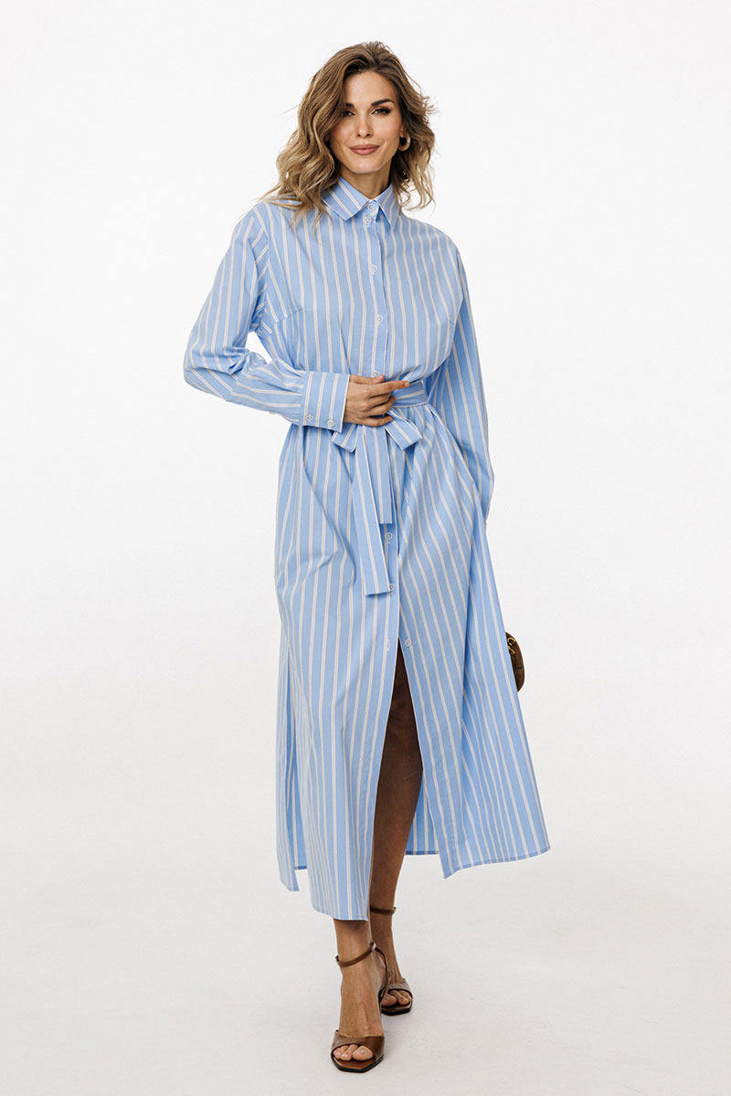 Платье выполнено из плательно-блузочной ткани в полоску. Платье прямого силуэта, длиной до линии щиколотки. По переду центральная застежка до верха с цельнокроеной планкой. На спинке обработаны кокетка и две складки от неё. Горловина округлой формы, обработана стояче-отложным воротником с отрезной стойкой. Плечевой шов удлинен. Рукав рубашечного покроя, одношовный, с двумя складками и обтачкой прорези по низу. Низ рукава обработан притачной манжетой, застегивающейся на две петли и пуговицы. В боковых швах обработаны карманы и разрезы.