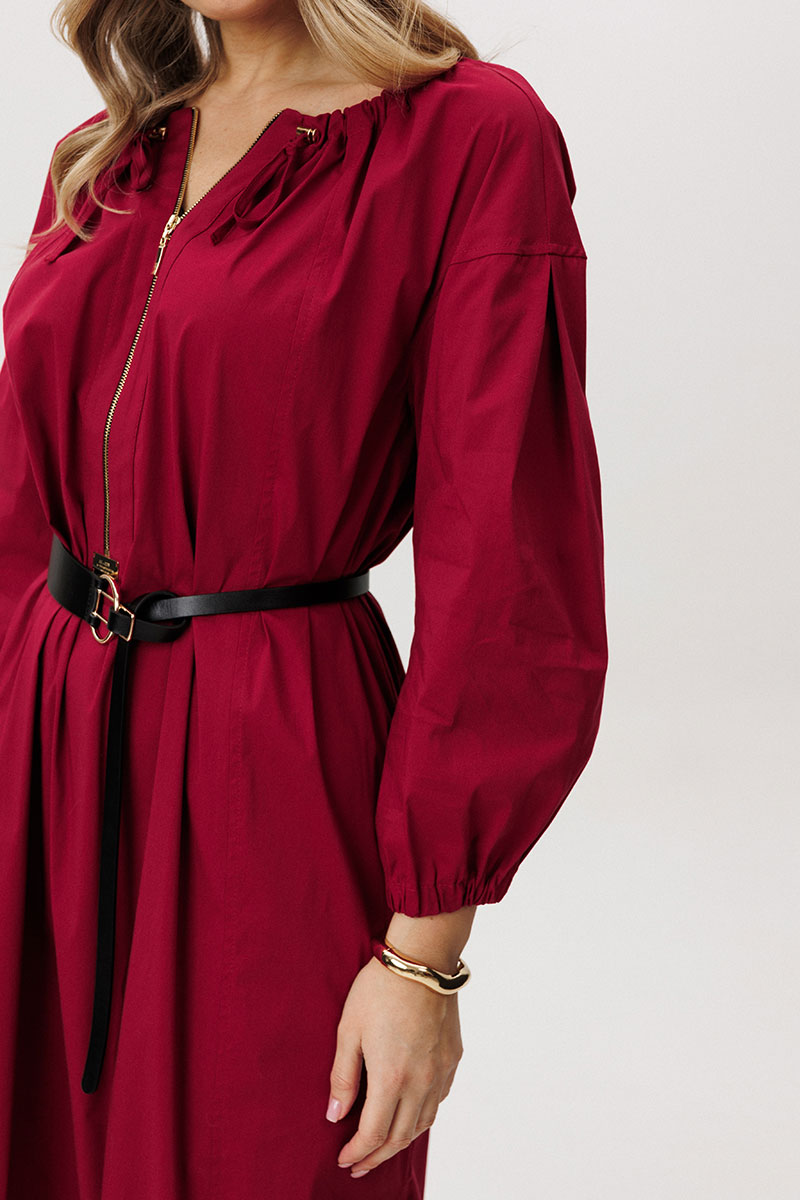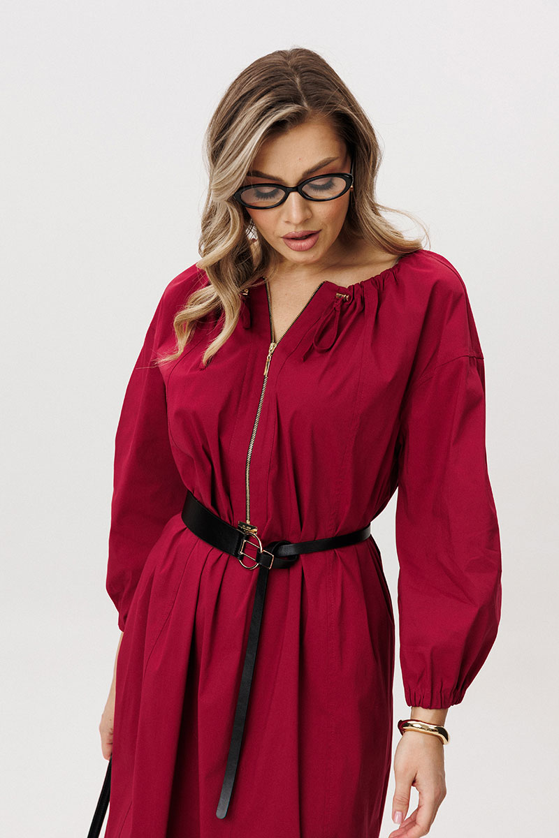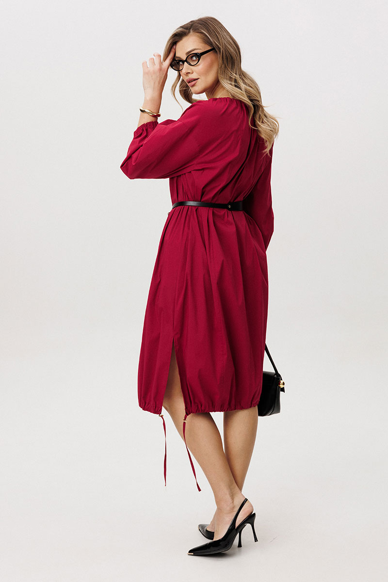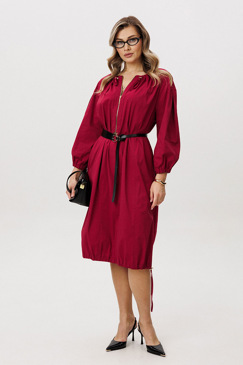Свободный силуэт, рубашечный рукав, круглая расширенная горловина с кулисой и эластичной тесьмой. Полочка с вертикальными рельефами от горловины, застёжкой на декоративную молнию в верхней части, отделочными высокими вытачками от низа центральной части. Спинка с центральным швом, вертикальными рельефами. Рукав со встречной складкой по окату и эластичной тесьмой по низу. По низу платья кулиса с эластичной тесьмой.