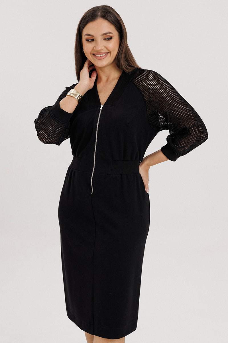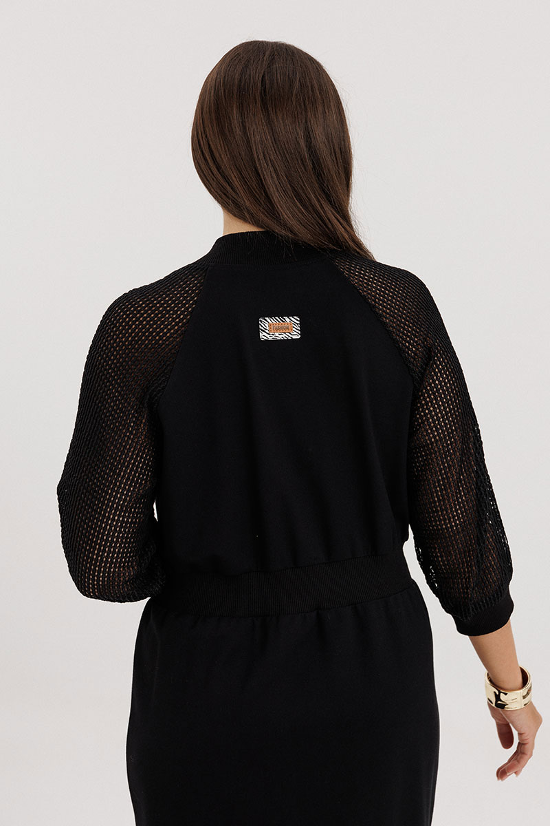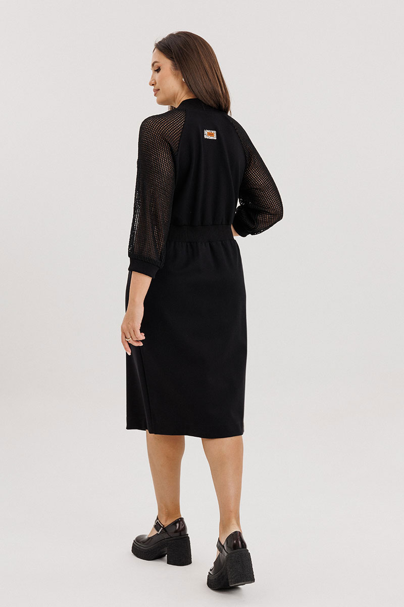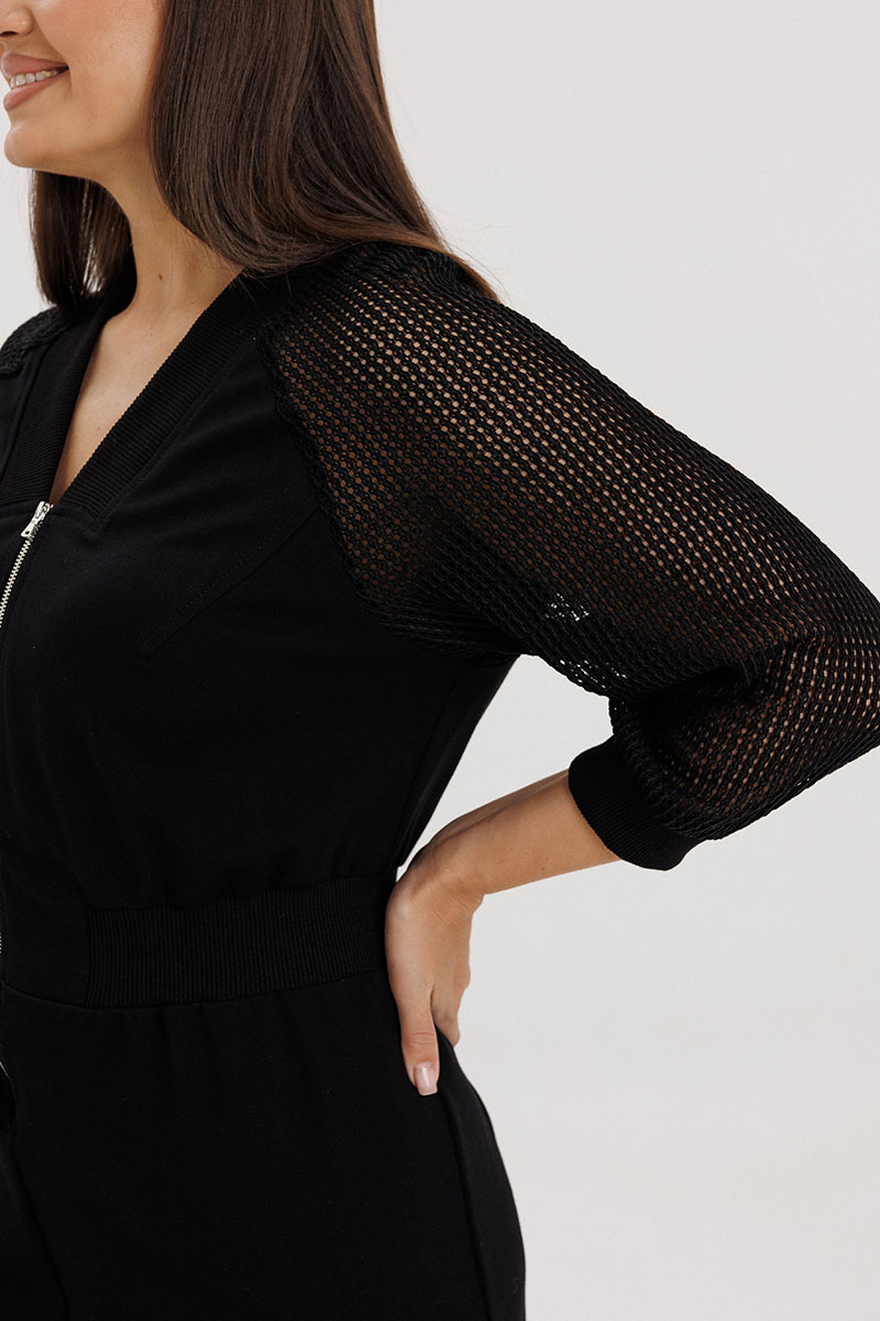 Полочка с нагрудными вытачками и центральным швом. Рукав из отделочной ткани. Линию талии подчёркивает трикотажное эластичное полотно в тон основной ткани, повышенной эластичности. Этим же отделочным полотном обработана горловина и манжета рукавов.