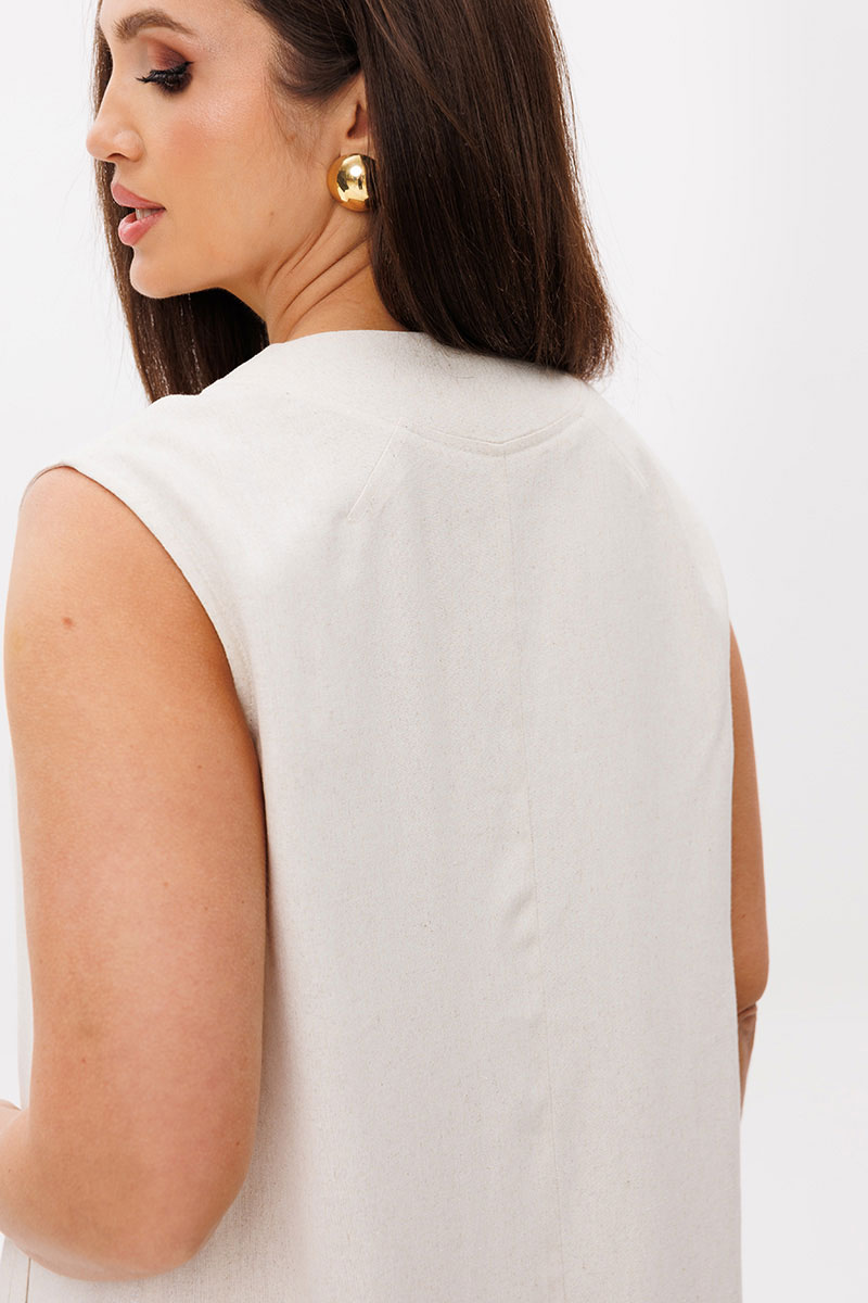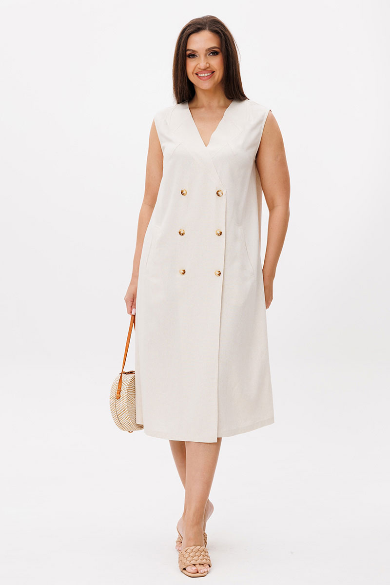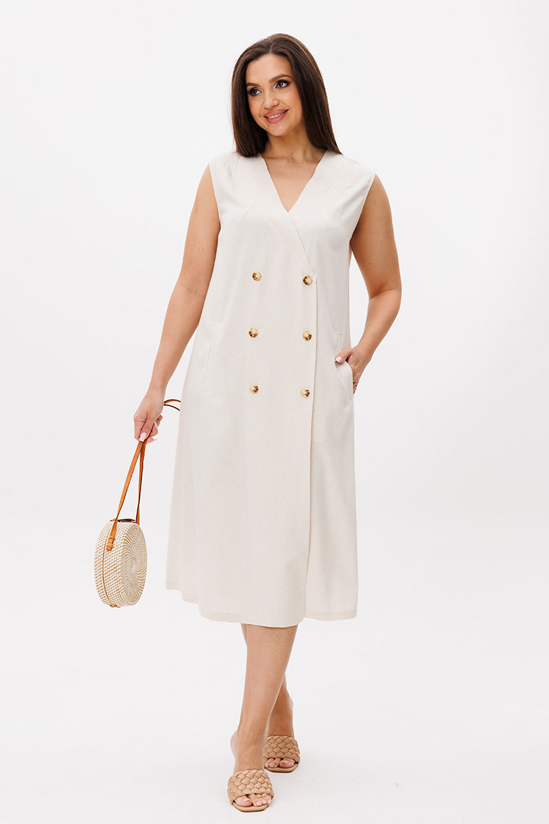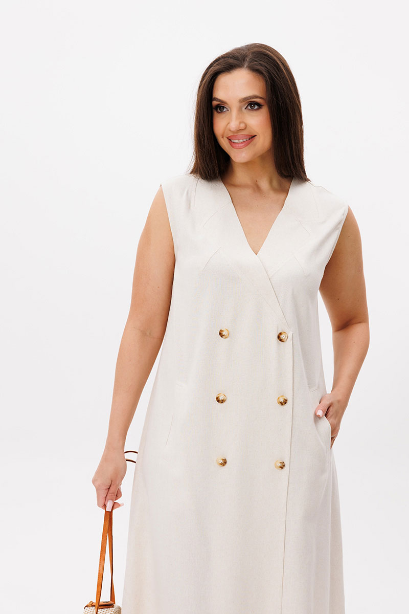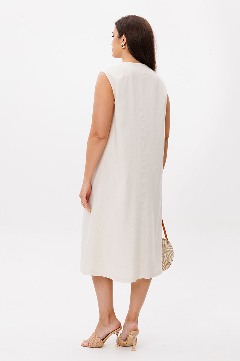 Натуральный лен, как нельзя лучше дополняет лаконичный А-силуэт. Кажущееся простым платье, на самом деле, вовсе не простое. Эдакая модель с изюминкой, где каждый элемент, продуман до мелочей. Платье без рукава, полочка с имитацией застежки, отделочными пуговицами, прорезными карманами с листочкой и необычным вырезом, кажущимся что это воротник.