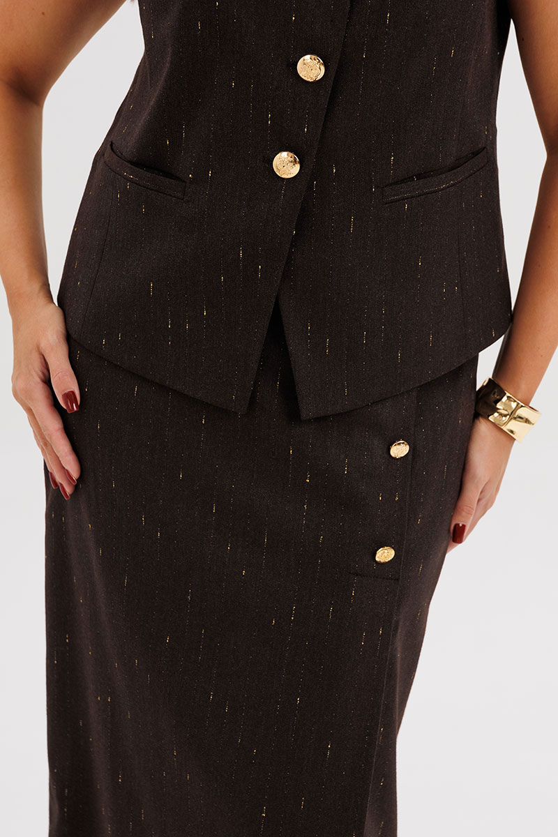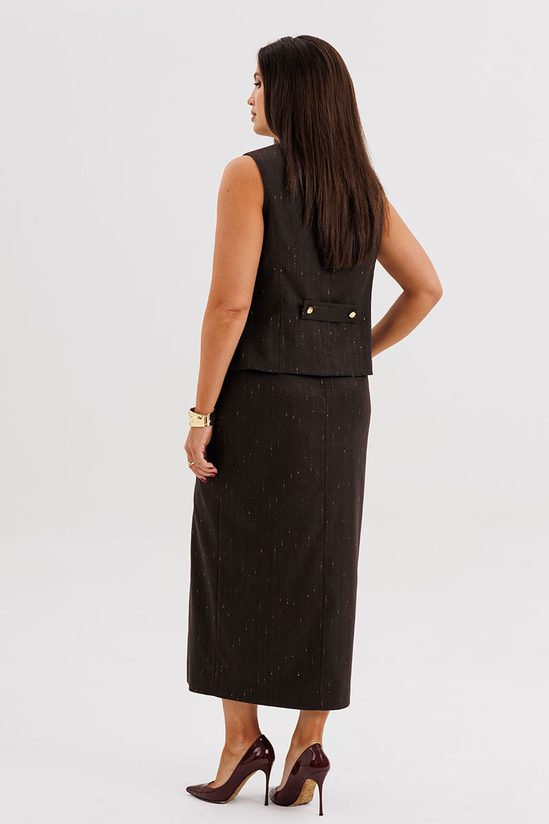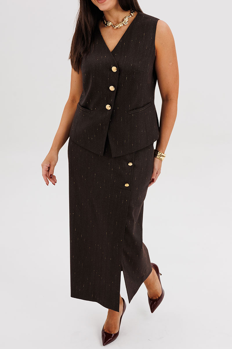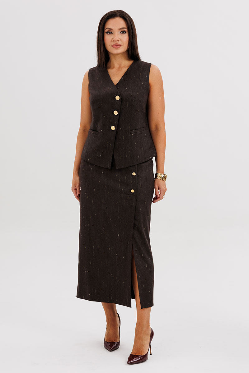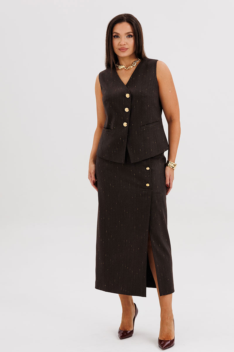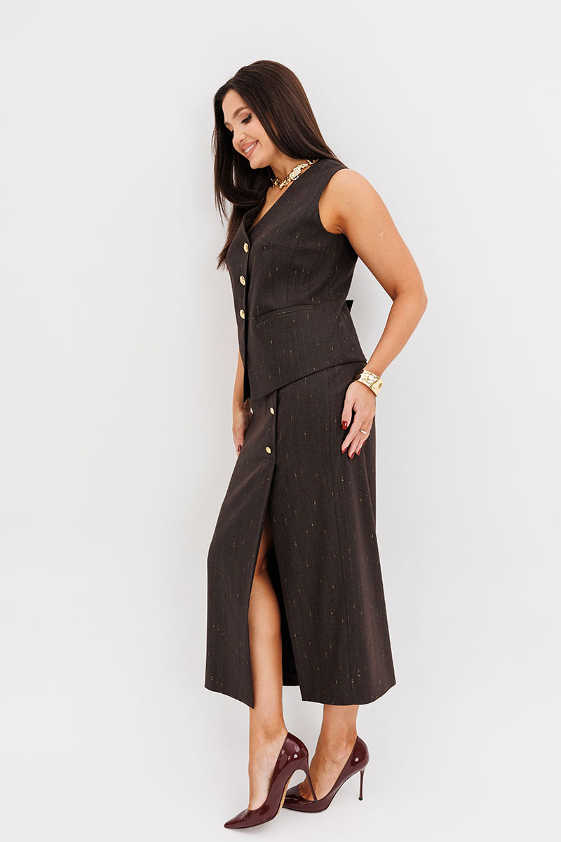 Жилет полуприлегающего силуэта подчёркивает линию талии и застёгивается на крупные декоративные пуговицы, создавая акцент на вертикали фигуры. Юбка миди с разрезом спереди и асимметричной застёжкой добавляет динамику и визуально удлиняет силуэт.