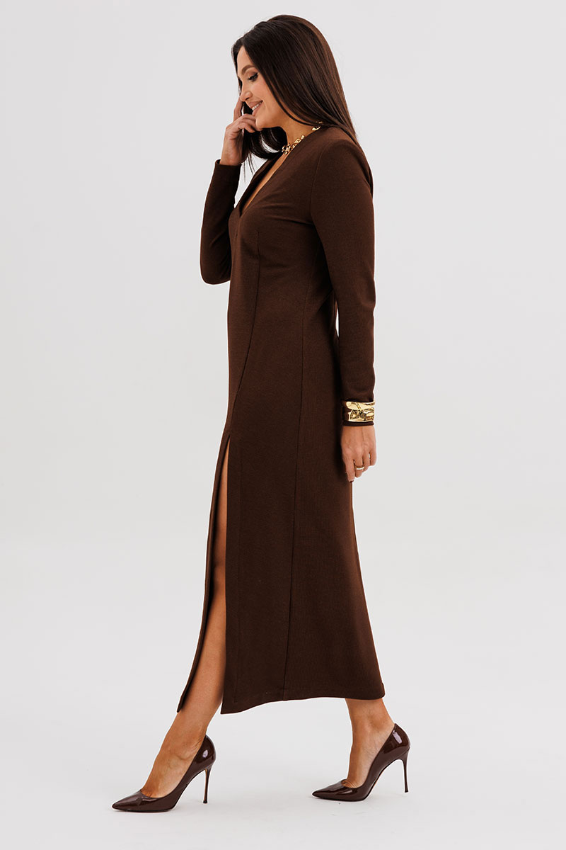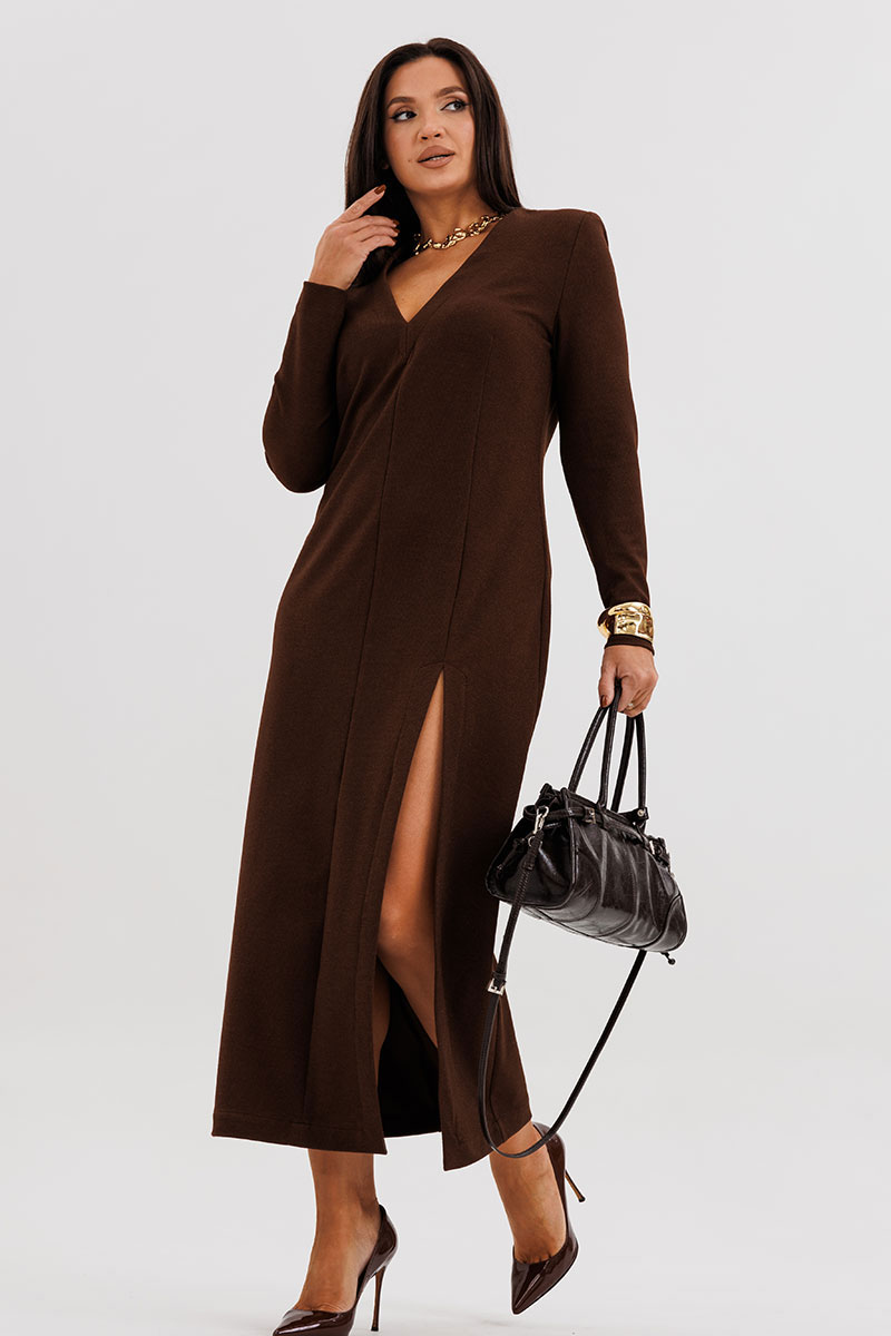 Шикарное платье из мягкого трикотажного полотна с едва заметным вкраплением люрекса — идеальное сочетание комфорта и элегантности. Втачной крой с лёгким прилеганием подчёркивает силуэт, а асимметричный рельеф визуально вытягивает фигуру, добавляя образу динамики. Глубокий V-вырез создаёт женственный акцент, а эффектный разрез спереди придаёт образу уверенность и утончённую привлекательность.