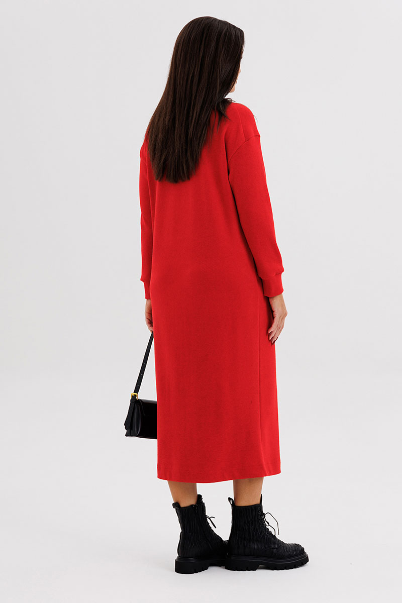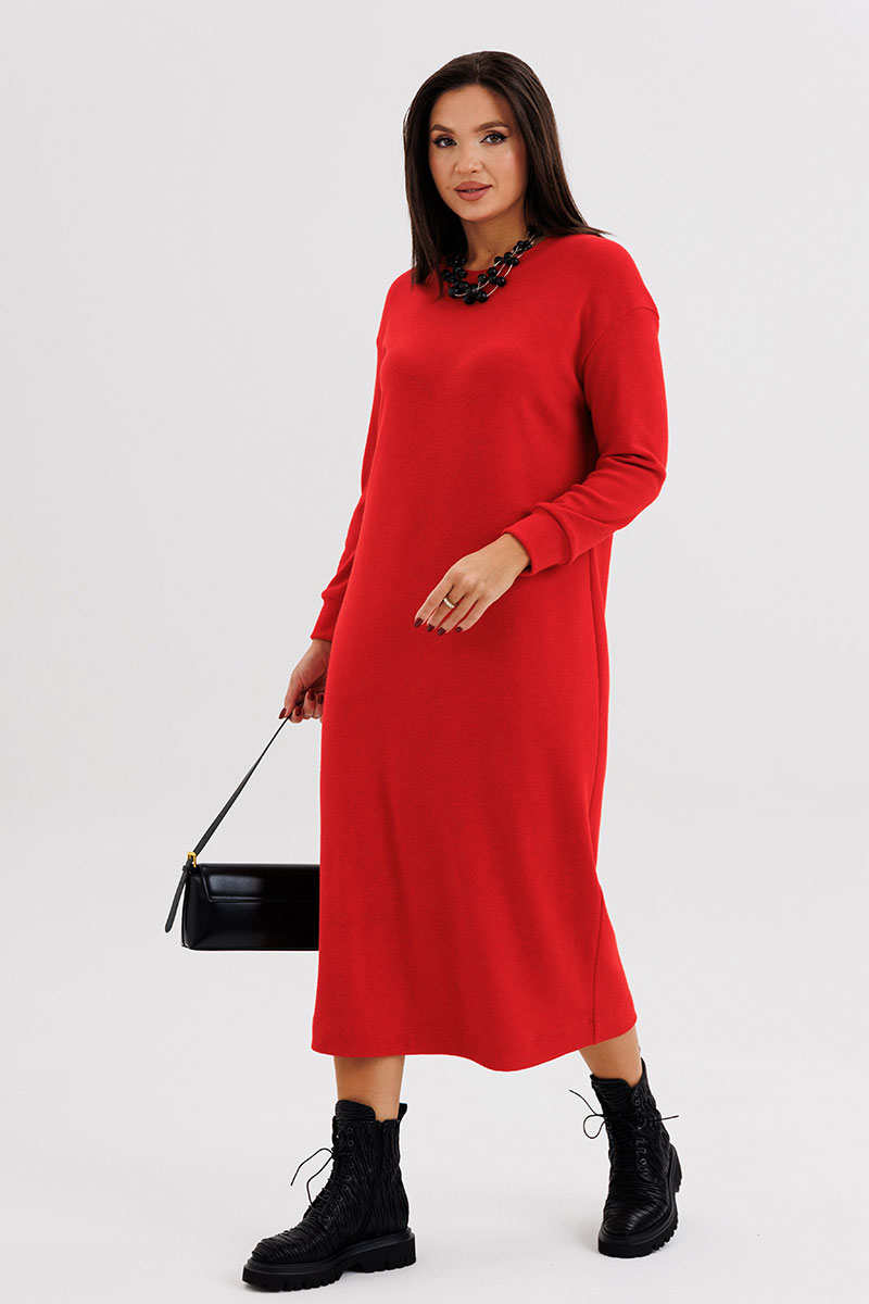 Мягкая фактура ткани приятна к телу и подходит для любого сезона. Насыщенный красный цвет подчёркивает женственность и уверенность, а минималистичный стиль позволяет комбинировать платье с различными аксессуарами и обувью — от классических туфель до ботильонов.