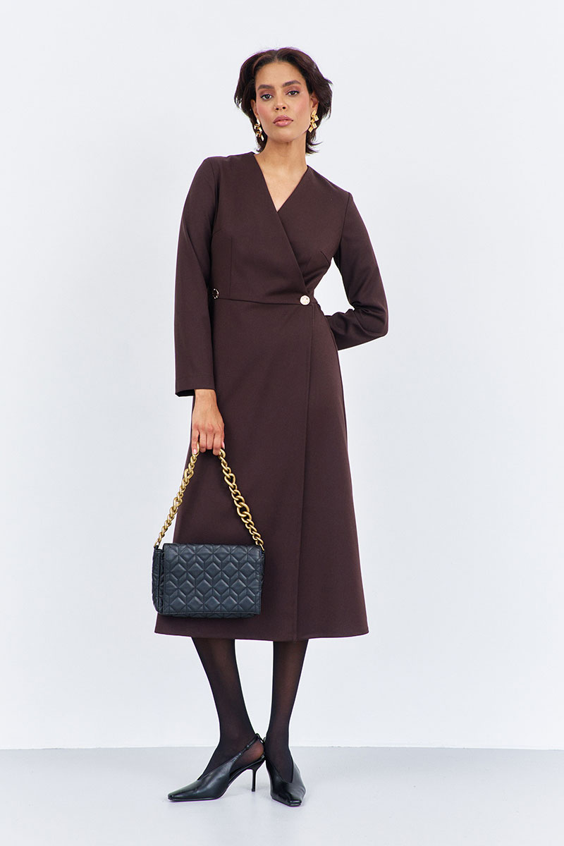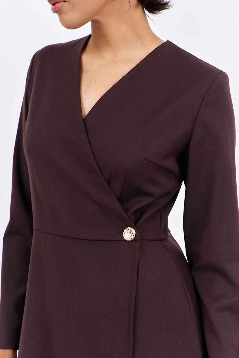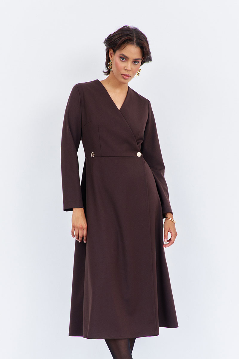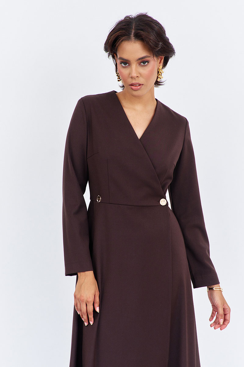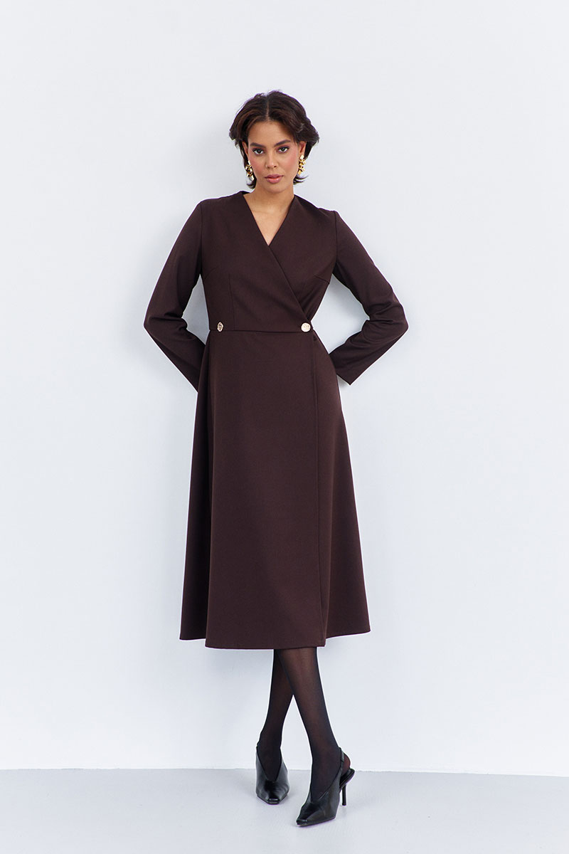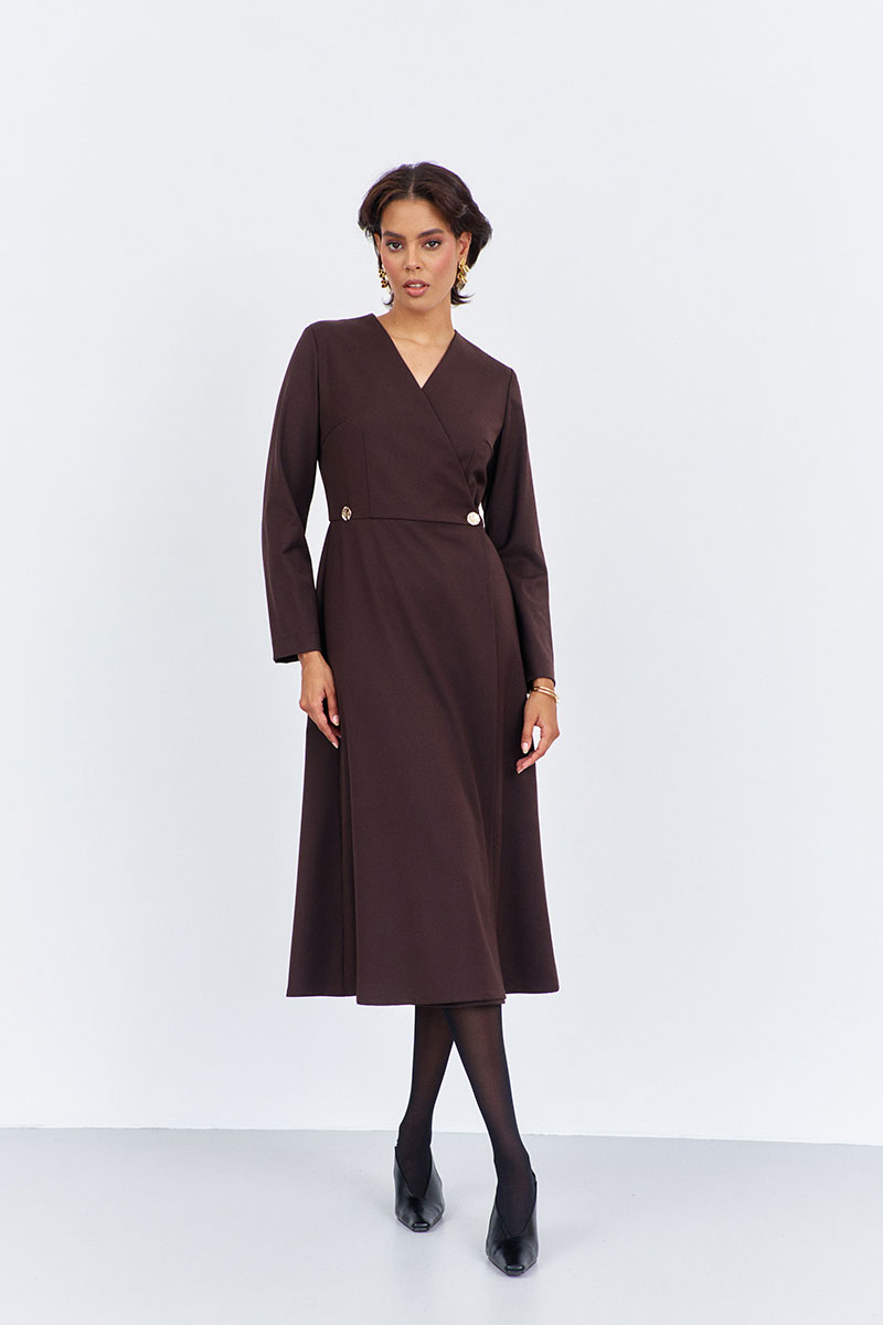 Платье приталенное на запах. Характеристики: выполнено из плательной ткани в цвете шоколад, отрезное по линии талии, по переду и спинке обработаны вытачки, по переду запах на декоративные петли и пуговицы.