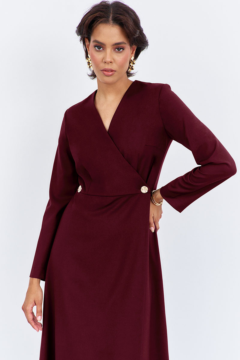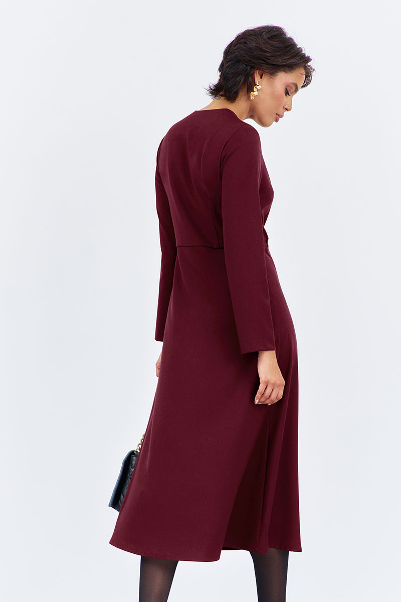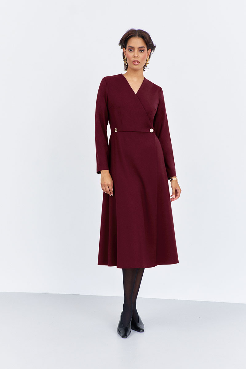Платье приталенное на запах. Характеристики: выполнено из плательной ткани в цвете марсала, отрезное по линии талии, по переду и спинке обработаны вытачки, по переду запах на декоративные петли и пуговицы.