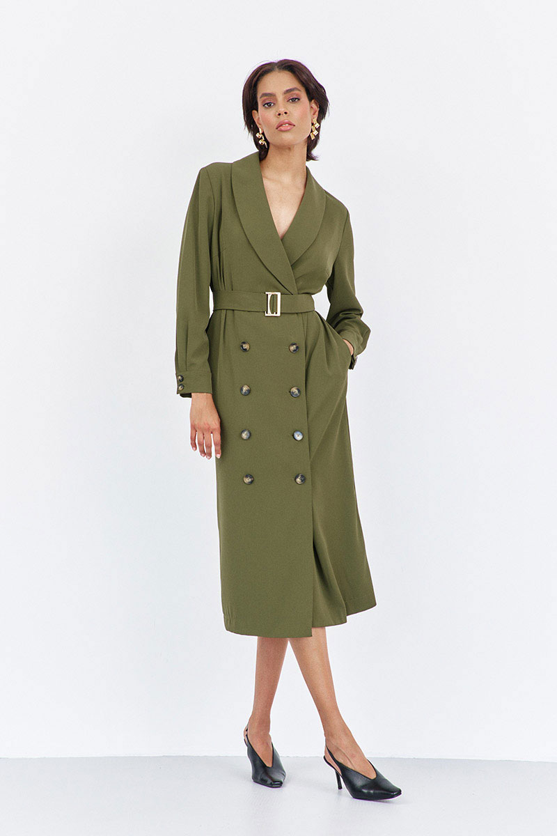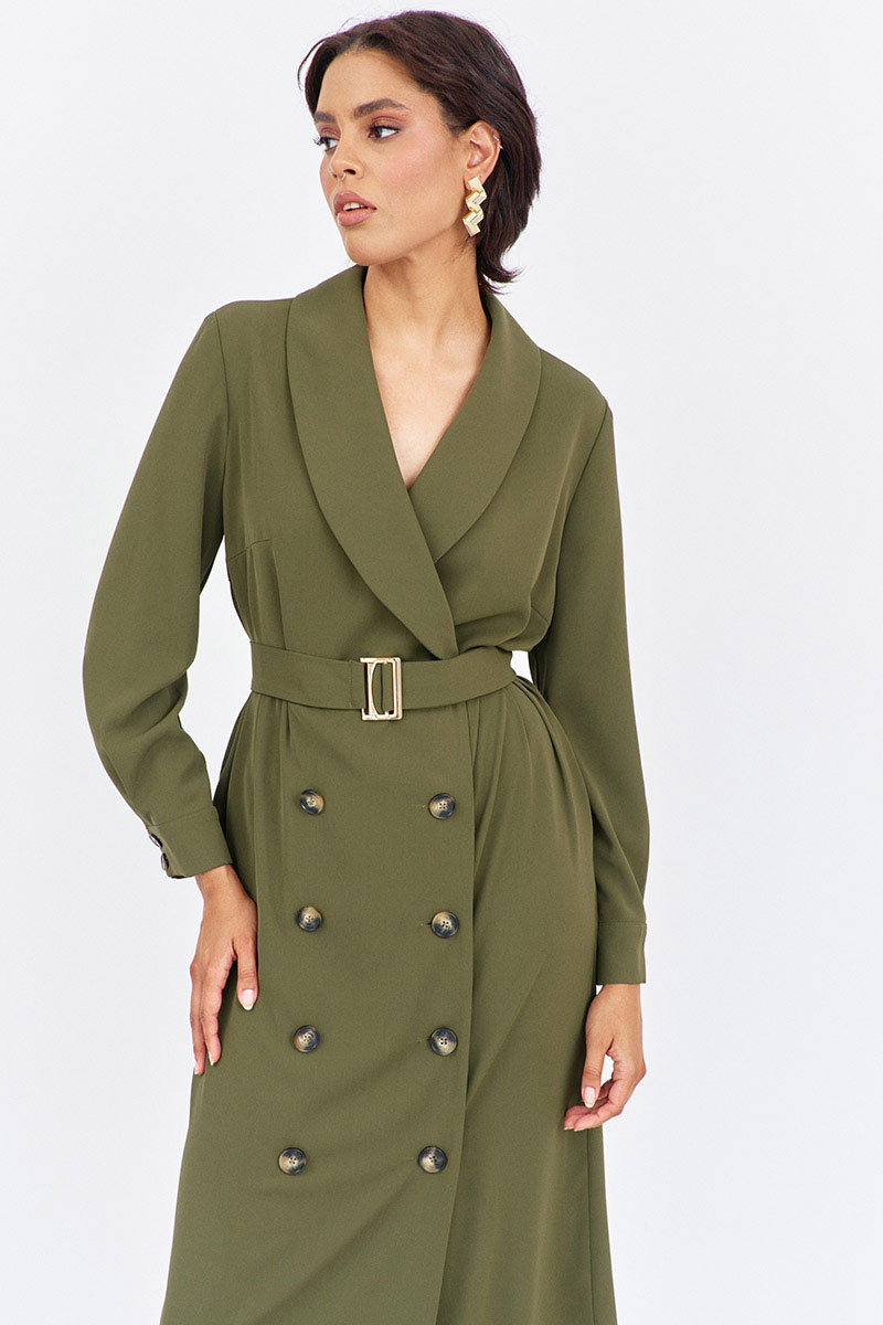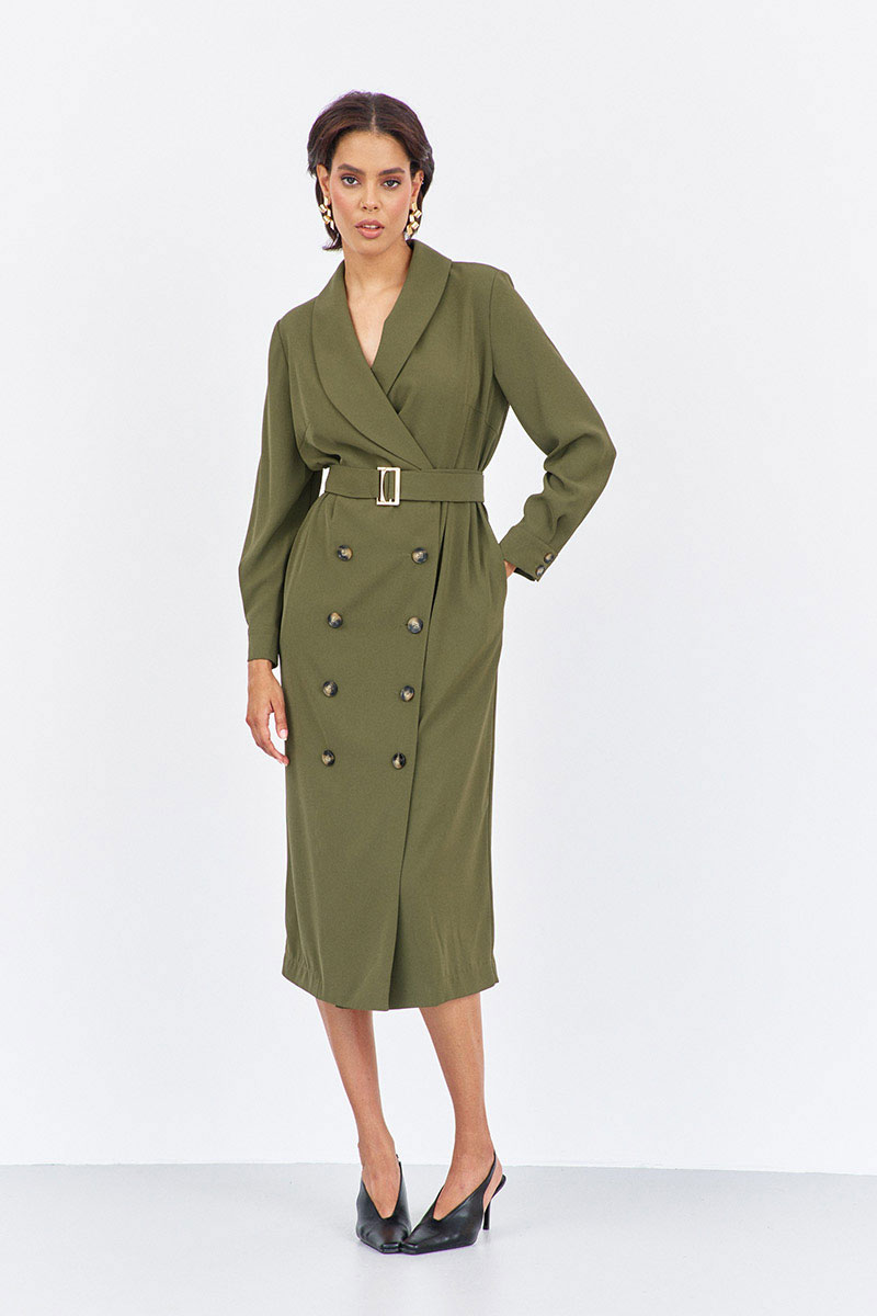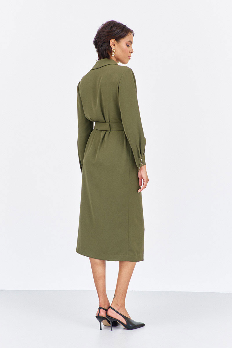 Платье прямого силуэта со смещенной застежкой. Характеристики: выполнено из плательной ткани в цвете хаки, воротник отложной - шаль, застежка-смещенная на петли и пуговицы, по рукаву манжеты на петли и пуговицы, в боковых швах карманы, по талии съемный пояс.