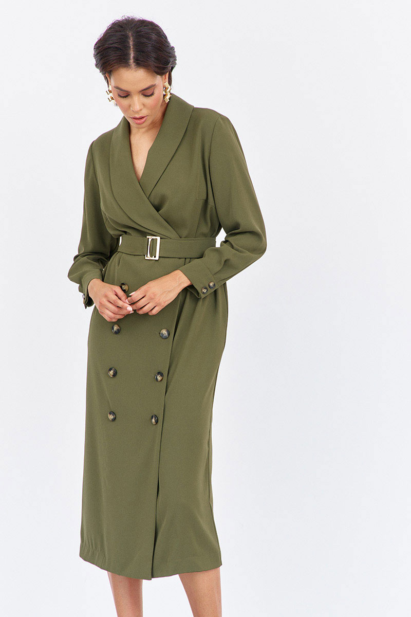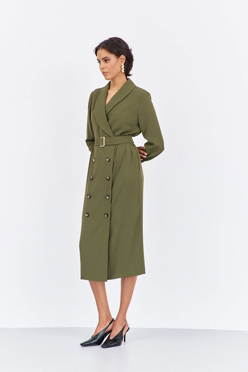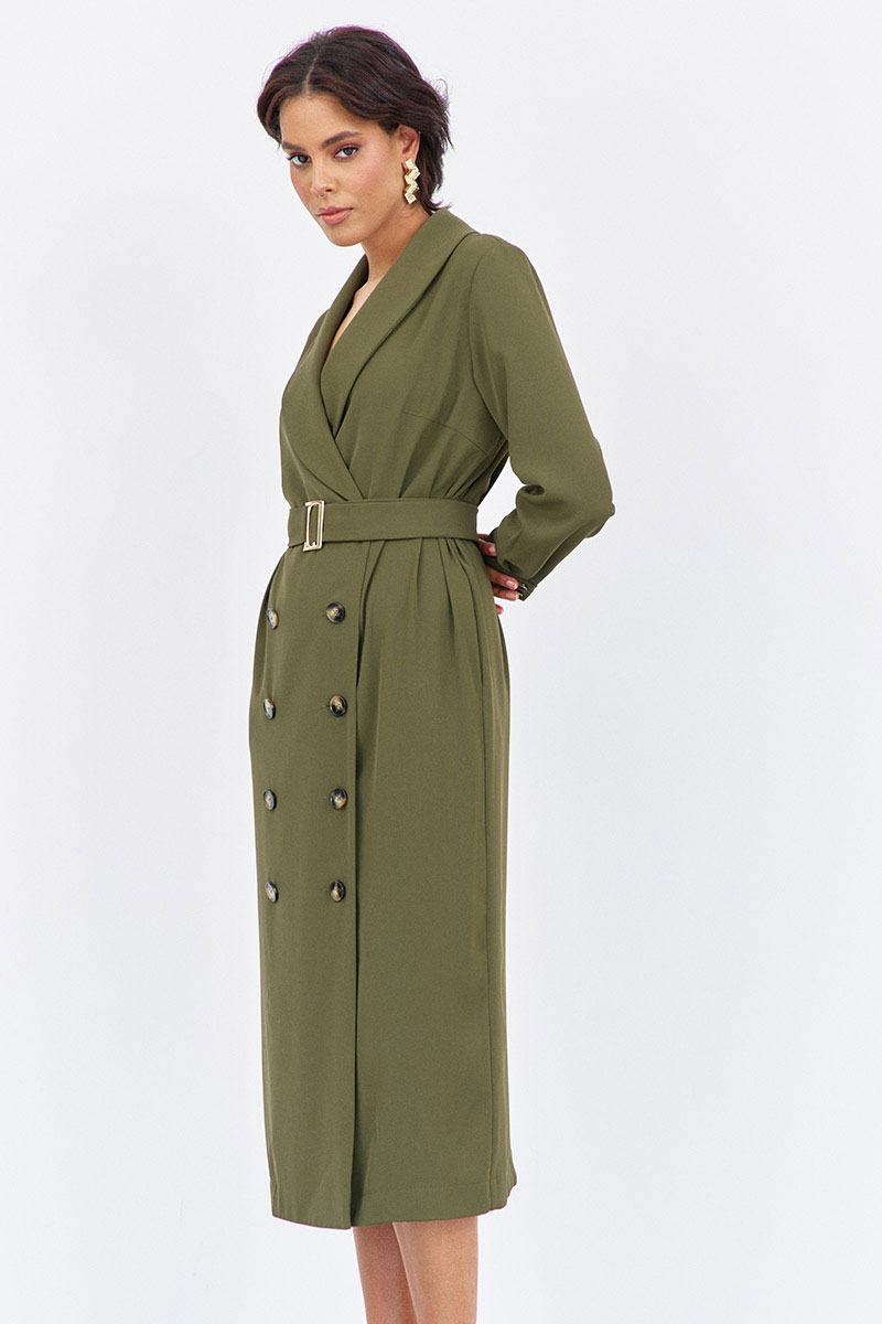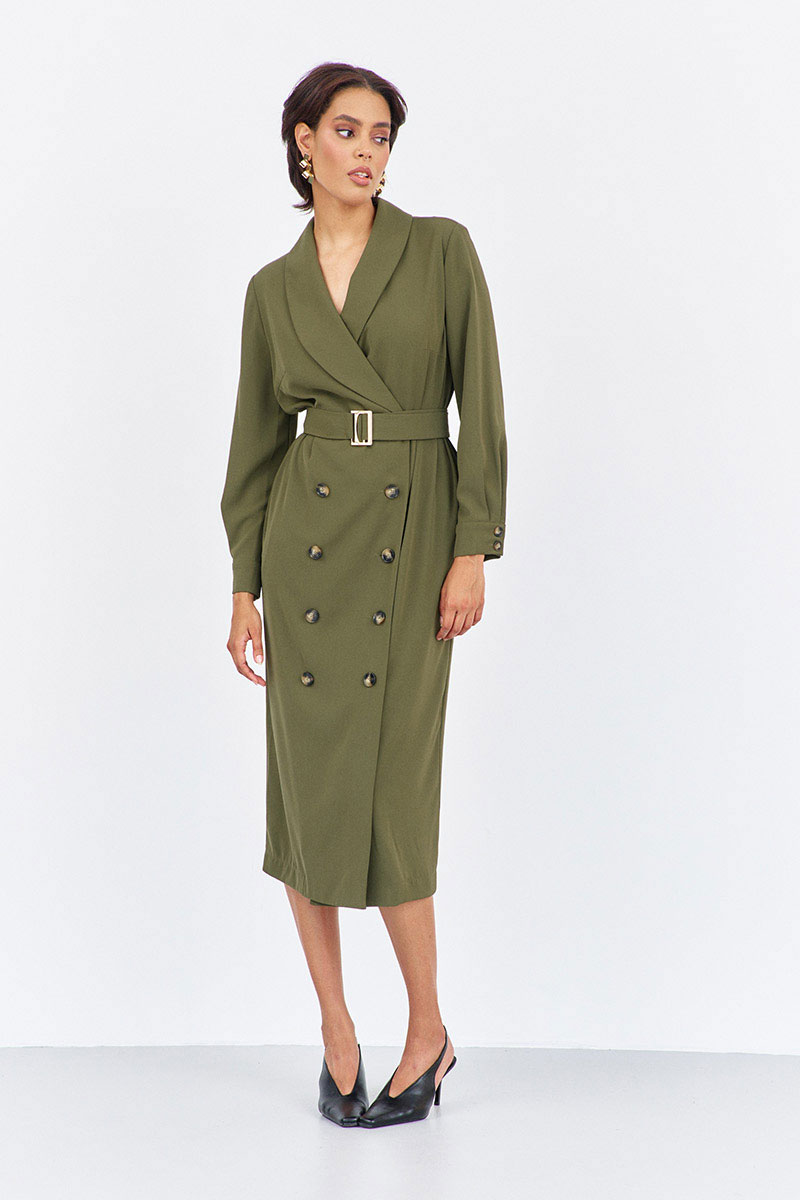 Платье прямого силуэта со смещенной застежкой. Характеристики: выполнено из плательной ткани в цвете хаки, воротник отложной - шаль, застежка-смещенная на петли и пуговицы, по рукаву манжеты на петли и пуговицы, в боковых швах карманы, по талии съемный пояс.