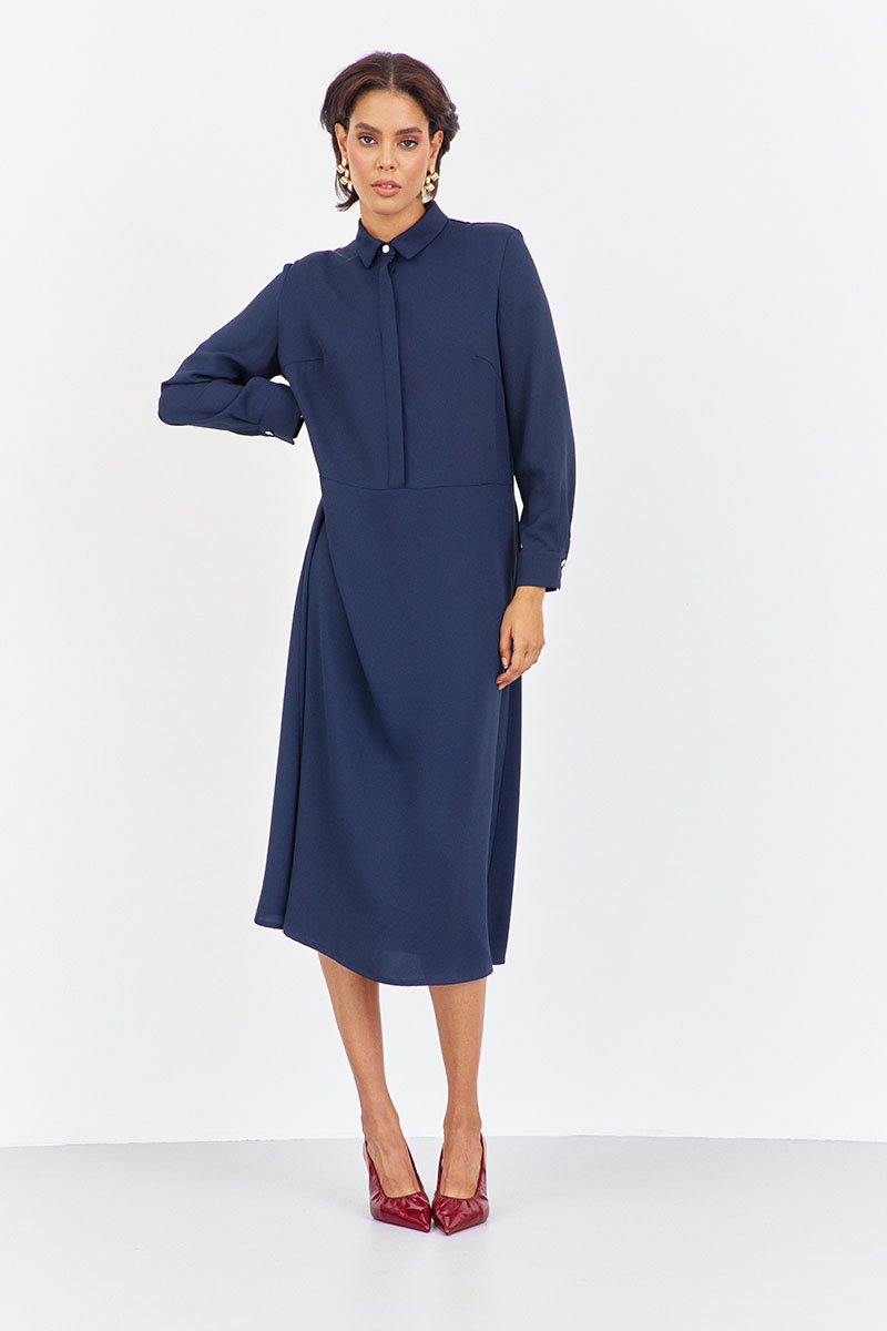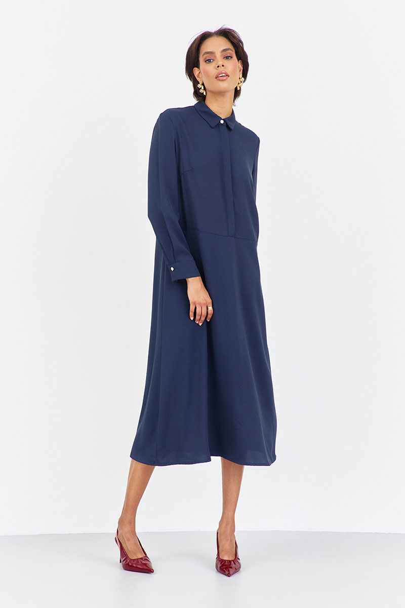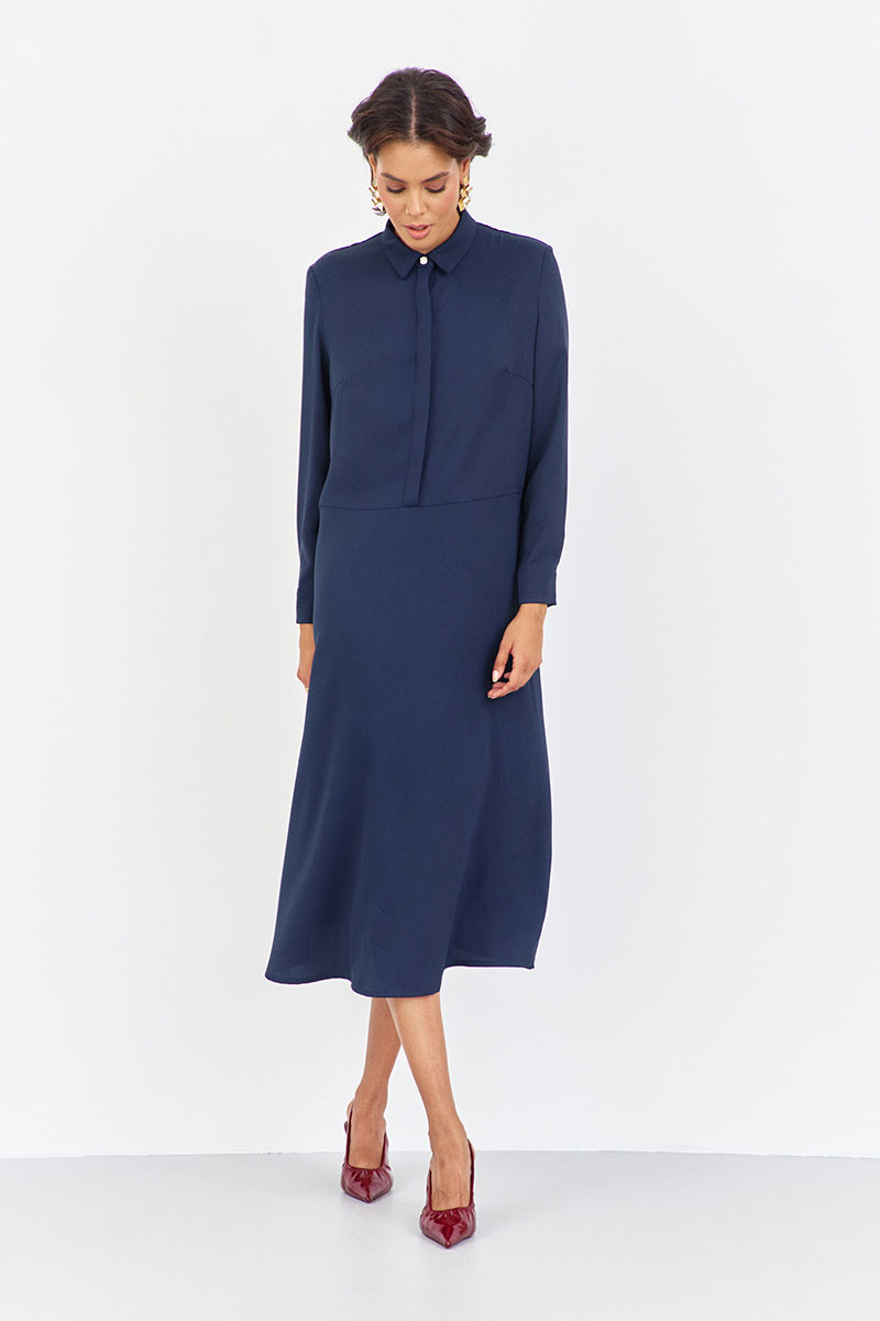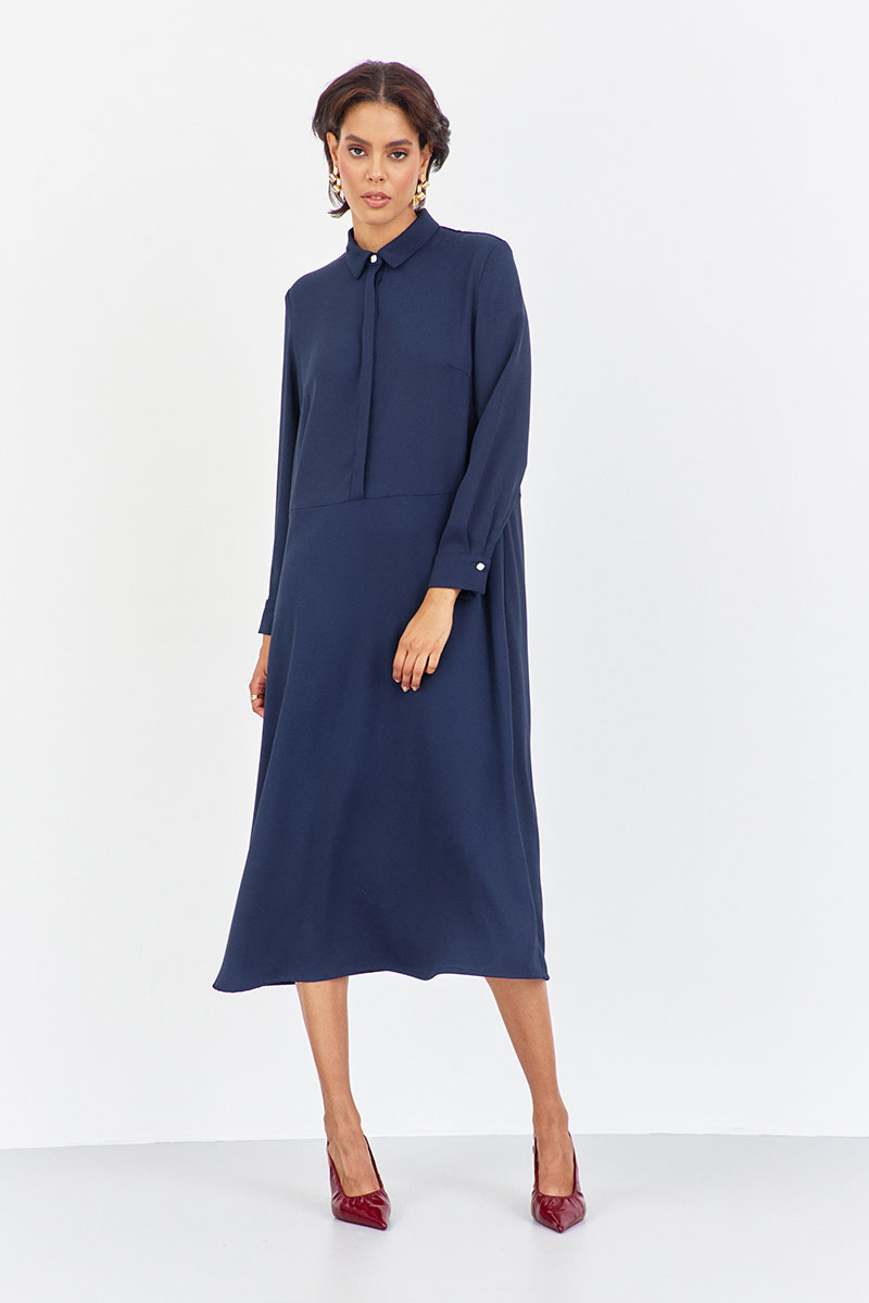 Платье прямого силуэта с потайной застежкой. Характеристики: выполнено из плательной ткани в синем цвете, отрезное по линии талии, по переду потайная застежка на петли и пуговицы, по спинке кокетка, воротник рубашечного типа, рукава на манжете.