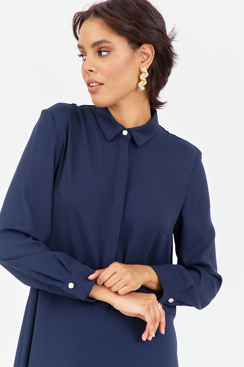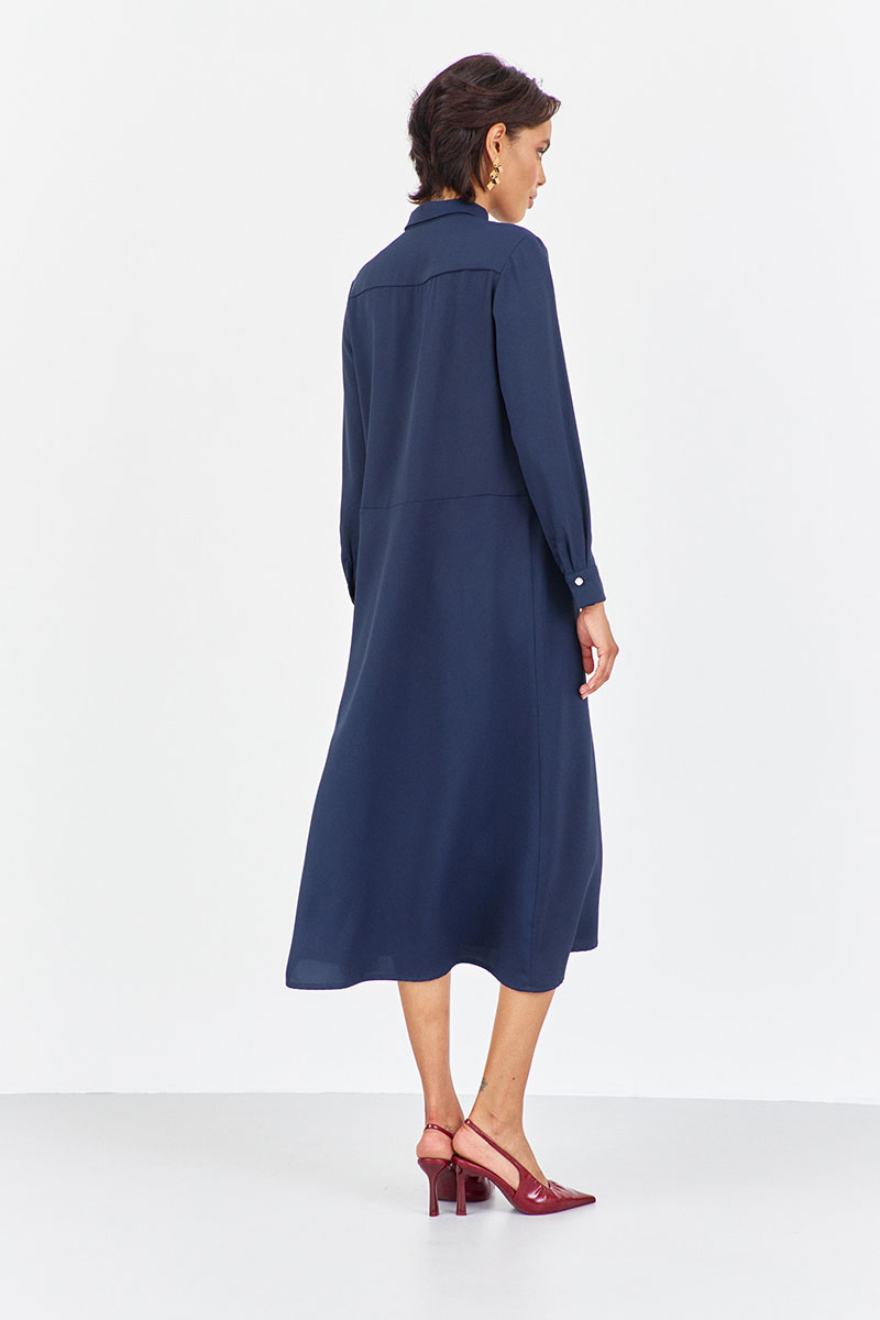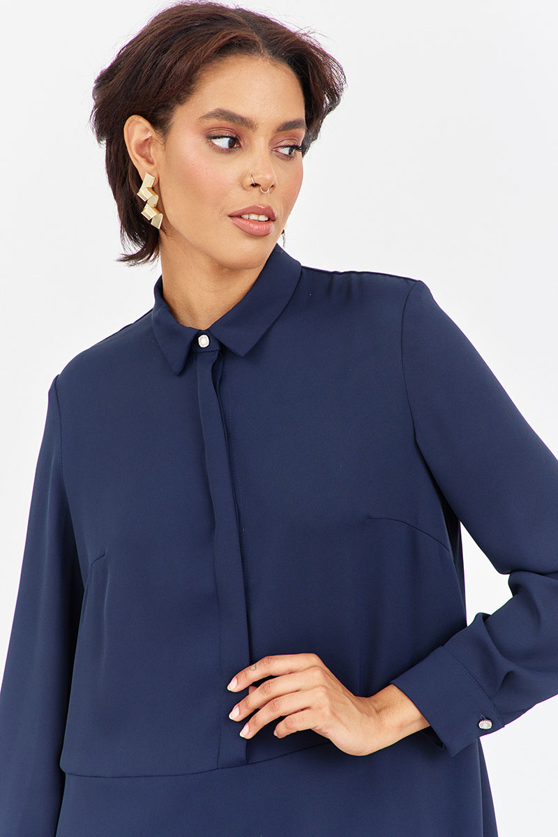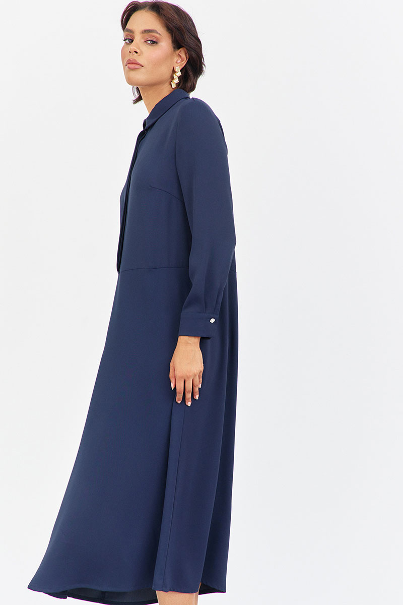 Платье прямого силуэта с потайной застежкой. Характеристики: выполнено из плательной ткани в синем цвете, отрезное по линии талии, по переду потайная застежка на петли и пуговицы, по спинке кокетка, воротник рубашечного типа, рукава на манжете.