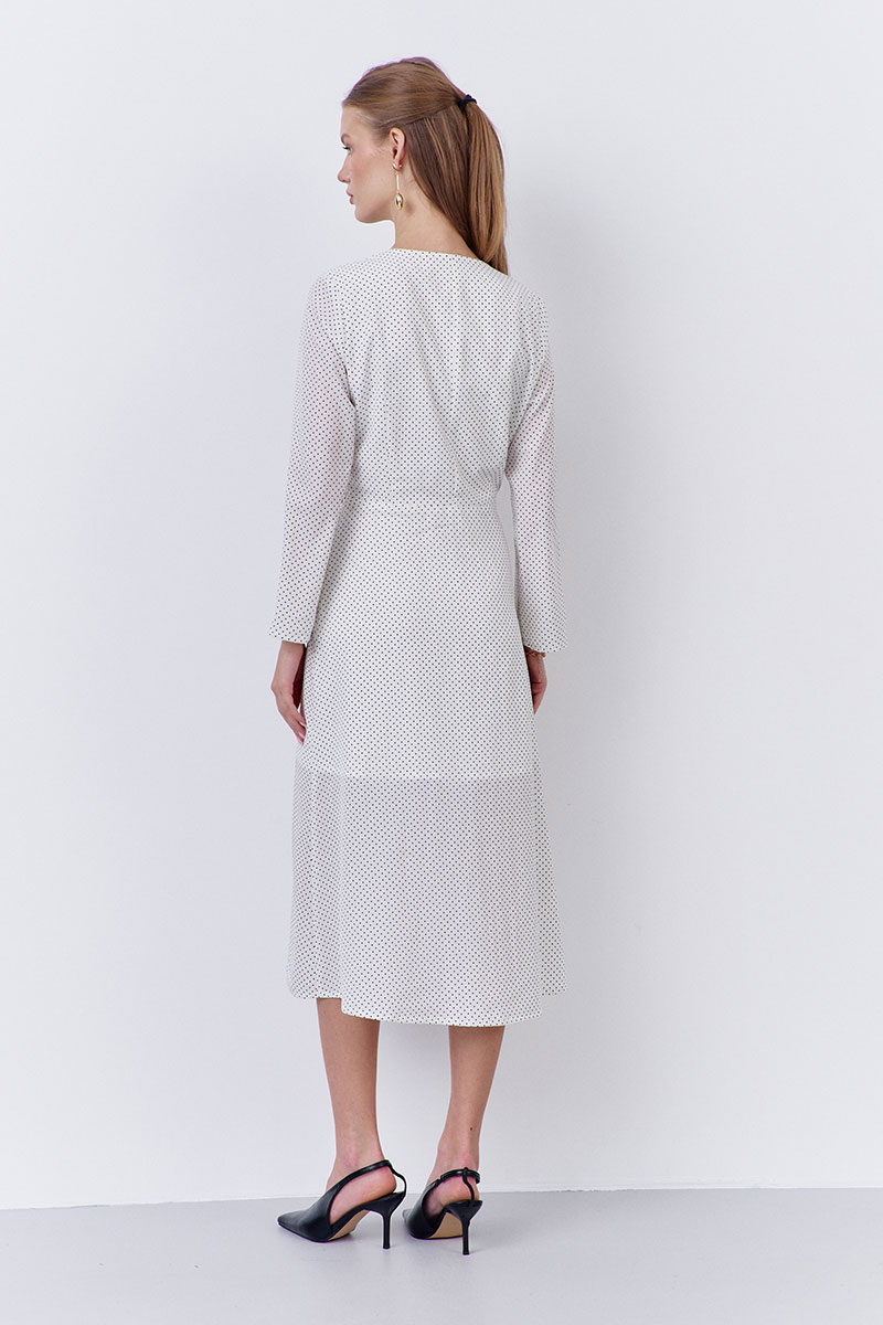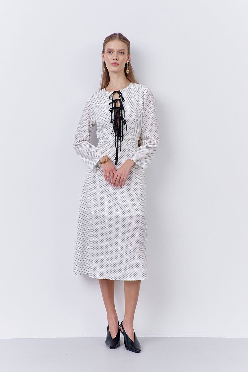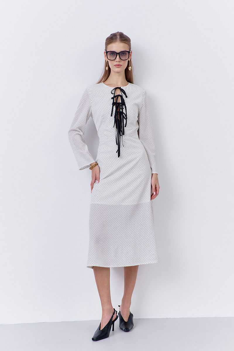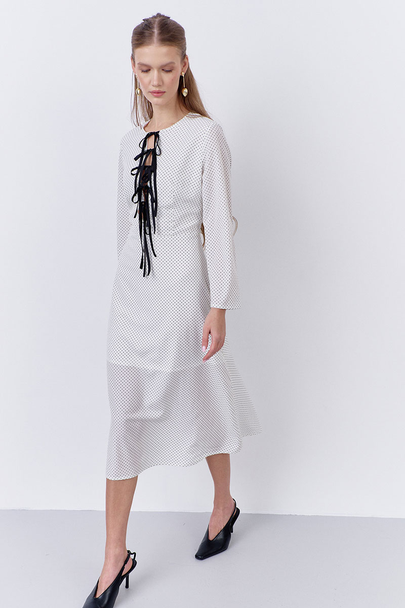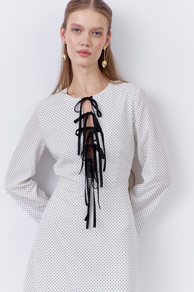 Платье приталенного силуэта с декоративными завязками по переду. Характеристики: выполнено из плательной ткани в принте белый горох, застежка-молния в боковом шве, отрезное по талии, по переду завязки из отделочной ткани.