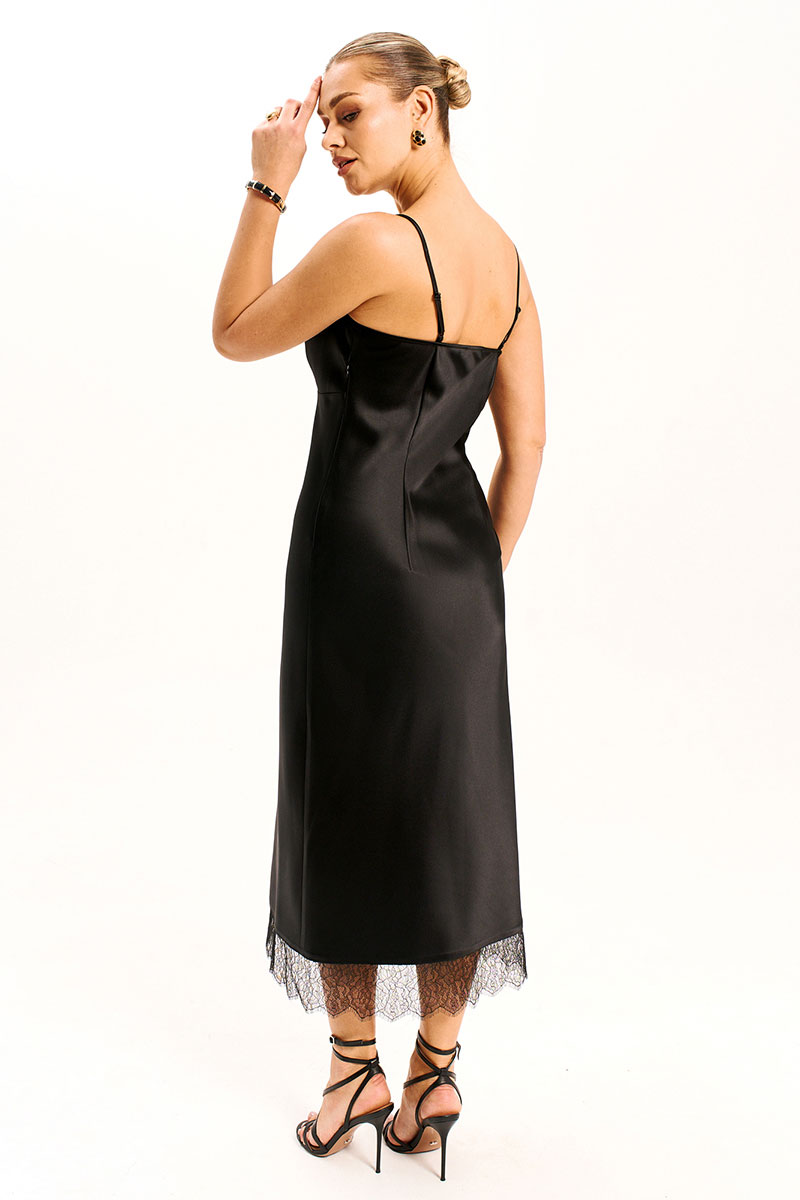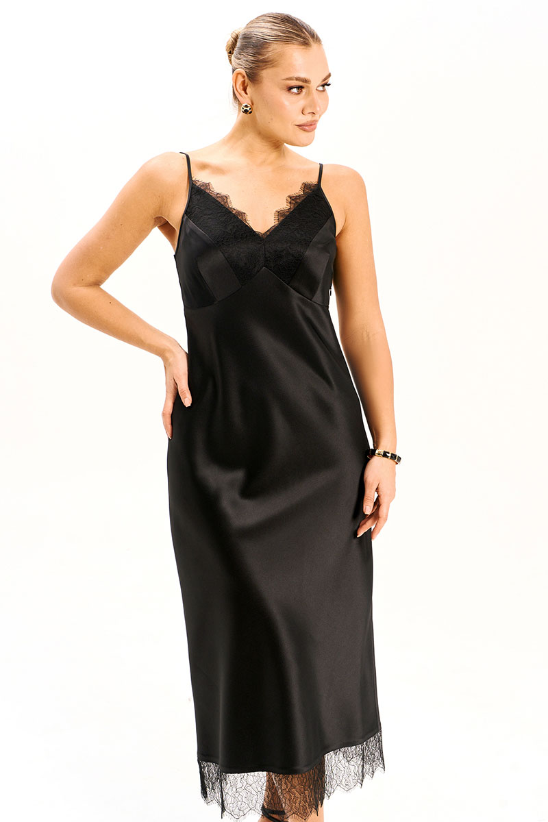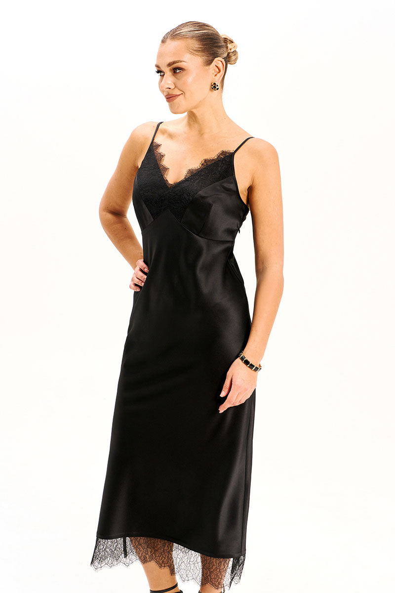 Платье - миди прилегающего силуэта выполнено из струящегося шелк - сатина на регулируемых бретелях и молнией в боковом шве. Подрезы по линии груди и низу платья дополнены мягким французким кружевом, которое держит форму. Платье полностью соответствует заявленному размеру. Пожалуйста, пользуйтесь таблицей замеров готового изделия, чтобы подобрать идеальный размер.              Уход за платьем:                                                                                                              - при стирке в стиральной машине выбрать бережный либо деликатный режим;    - температура воды не выше 30 градусов. ( платье прошло тестовую стирку не линяет).