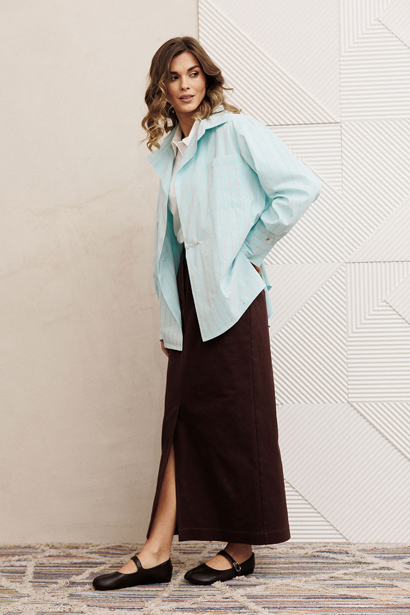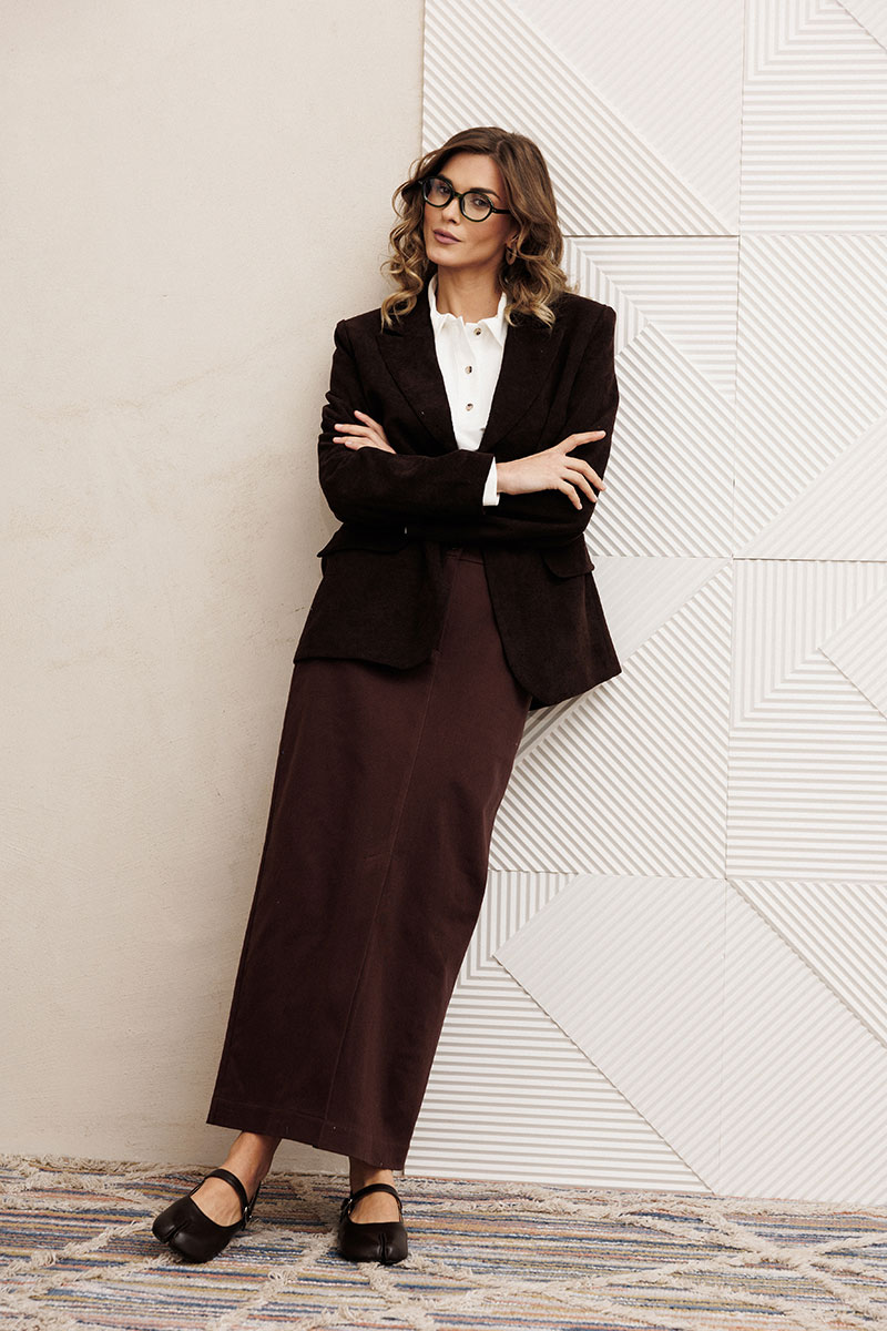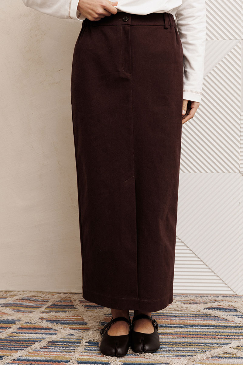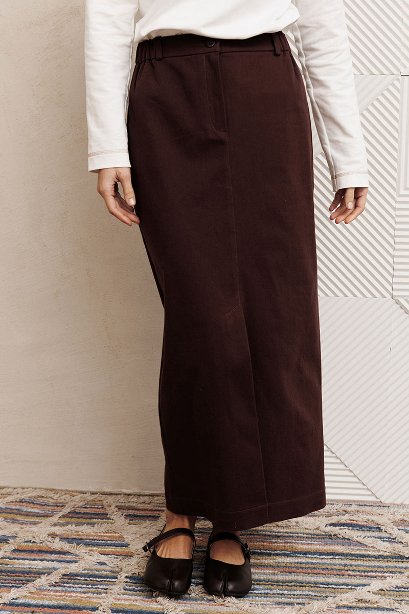 Юбка прямого силуэта выполненная из мягкой вельветовой ткани. Передняя честь юбки с вытачками, со средним швом и застежкой гульфиком на молнии и щлицей спереди. Задняя часть юбки с вытачками. Юбка на притачном поясе с затежкой на петлю и пуговицу спереди и резинками по бокам. Длина юбки с учетом пояса - 90 см.