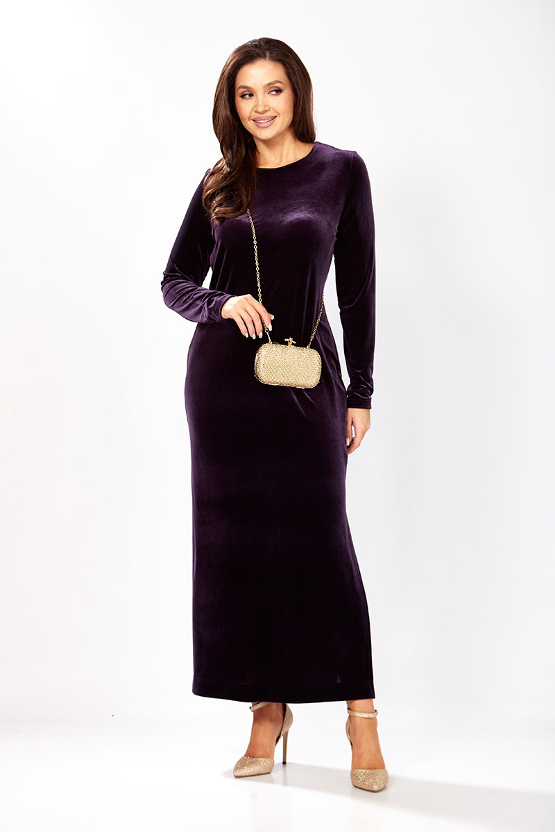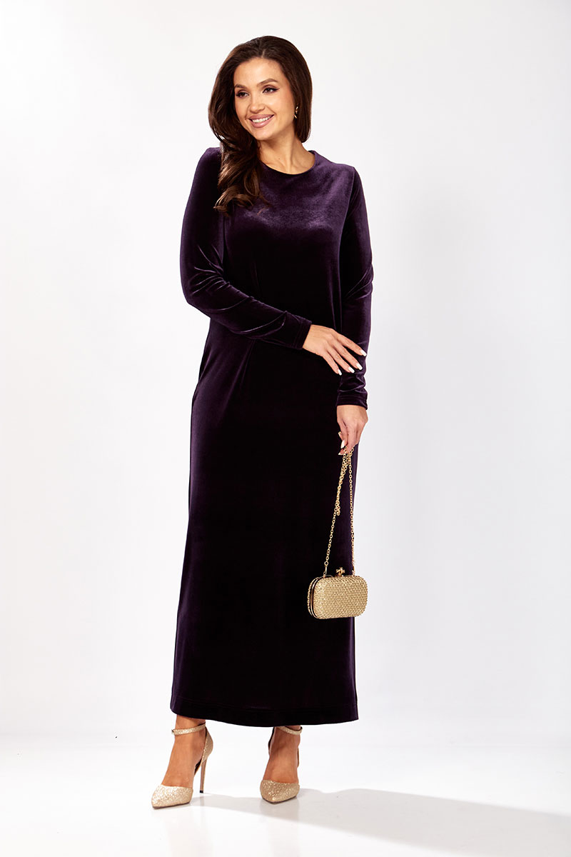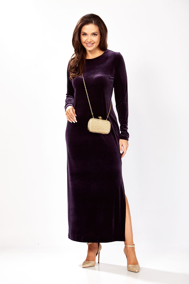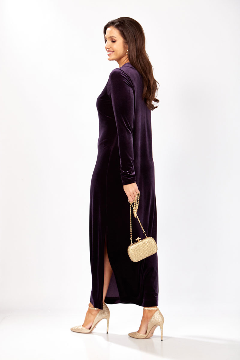 Платье прямого силуэта из бархата. В боковом шве разрез. Рукав втачной одношовный. По спинке застежка капелька на петлю и пуговицу.