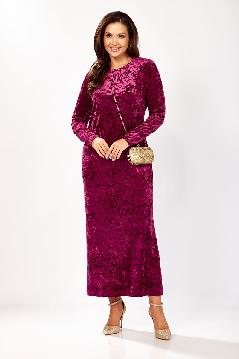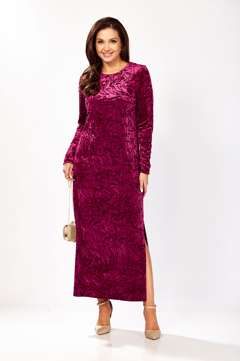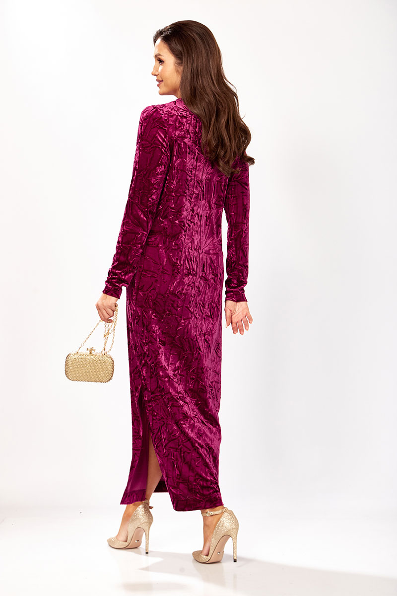 Платье прямого силуэта из бархата. В боковом шве разрез. Рукав втачной одношовный. По спинке застежка капелька на петлю и пуговицу.