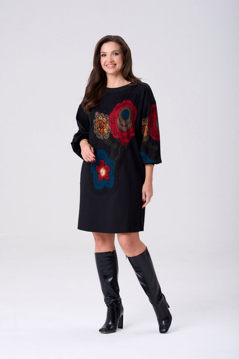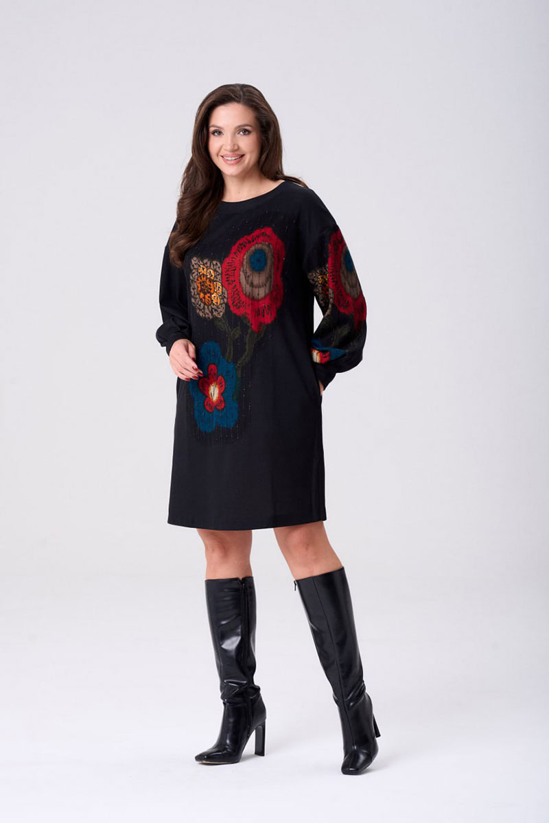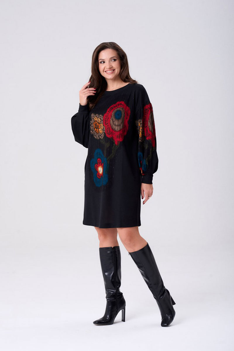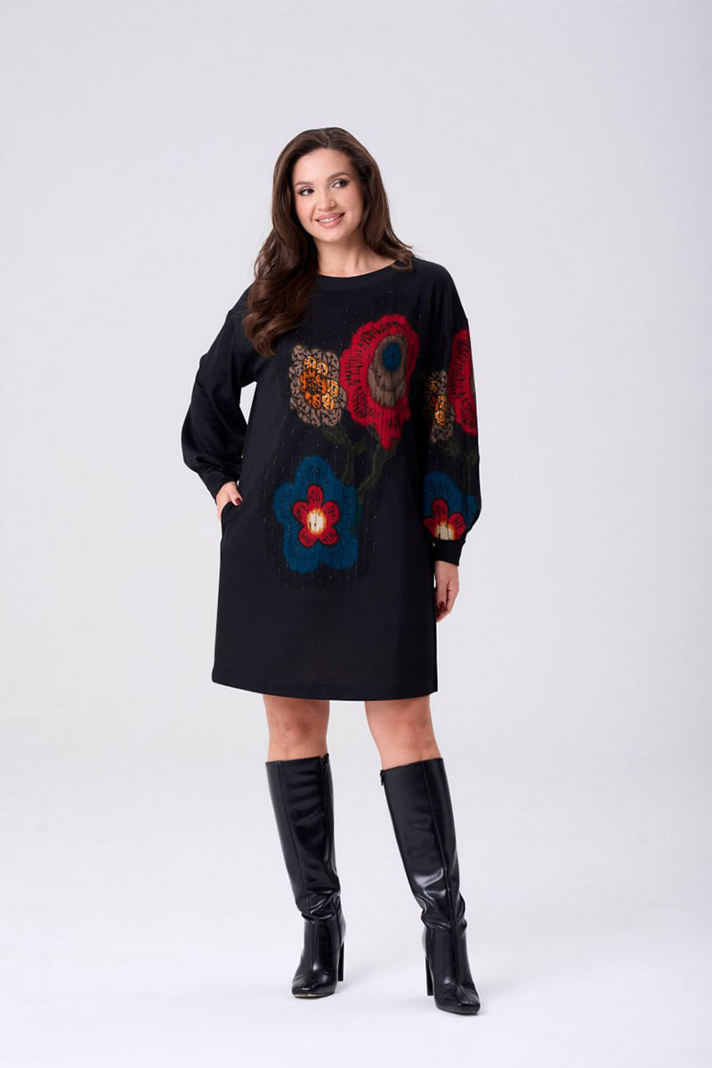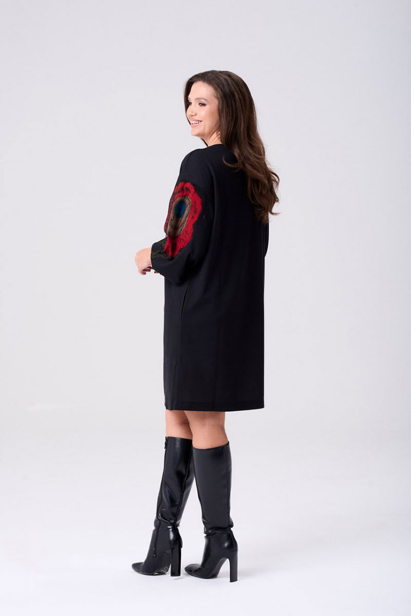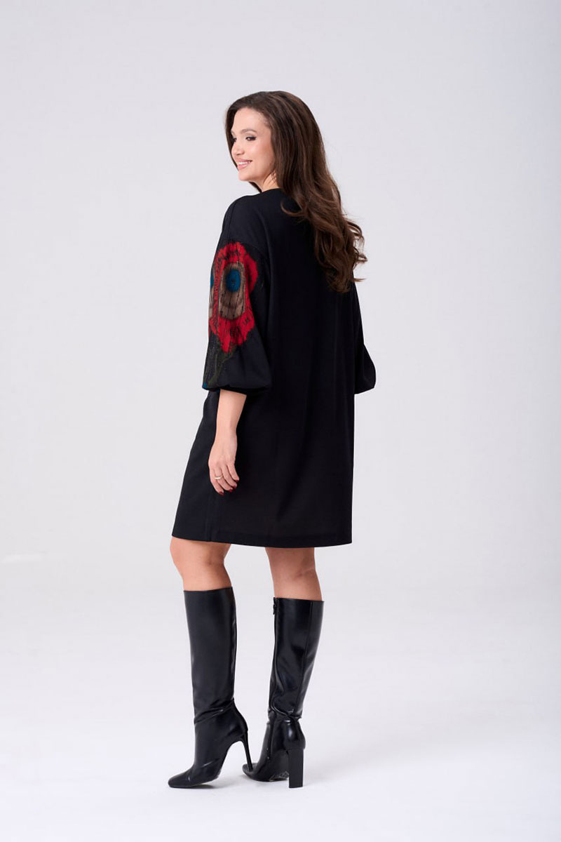 Платье свободного силуэта из трикотажной ткани с принтом. Рукав втачной одношовный со складками по низу и манжетой. В боковых швах карманы. Горловина обработана планкой в форме лодочки. По переду и по левому рукаву поверх принта настрочена сетка. Сетка может быть заменена с сохранением художественного образа изделия.