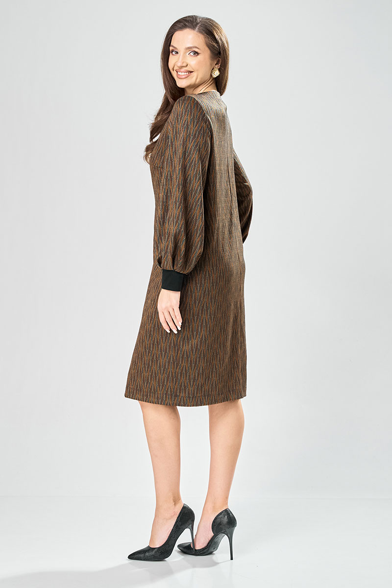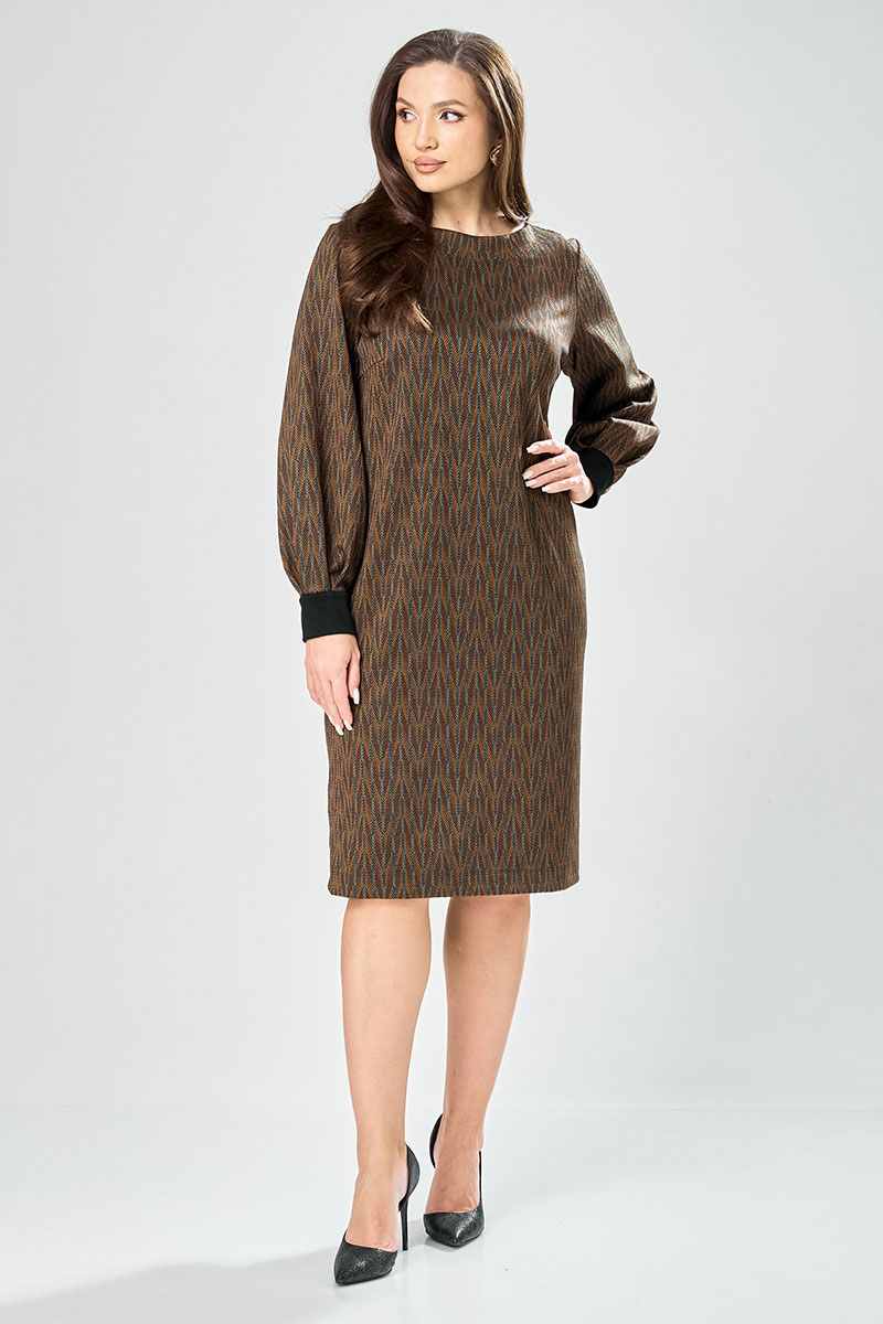 Платье прямого силуэта из плотного трикотажного полотна с рисунком. Перед с нагрудными вытачками. Спинка со средним швом. Горловина лодочкой обработана планкой. Рукав одношовный втачной по низу со складками собранными на манжету. В боковом шве карман.