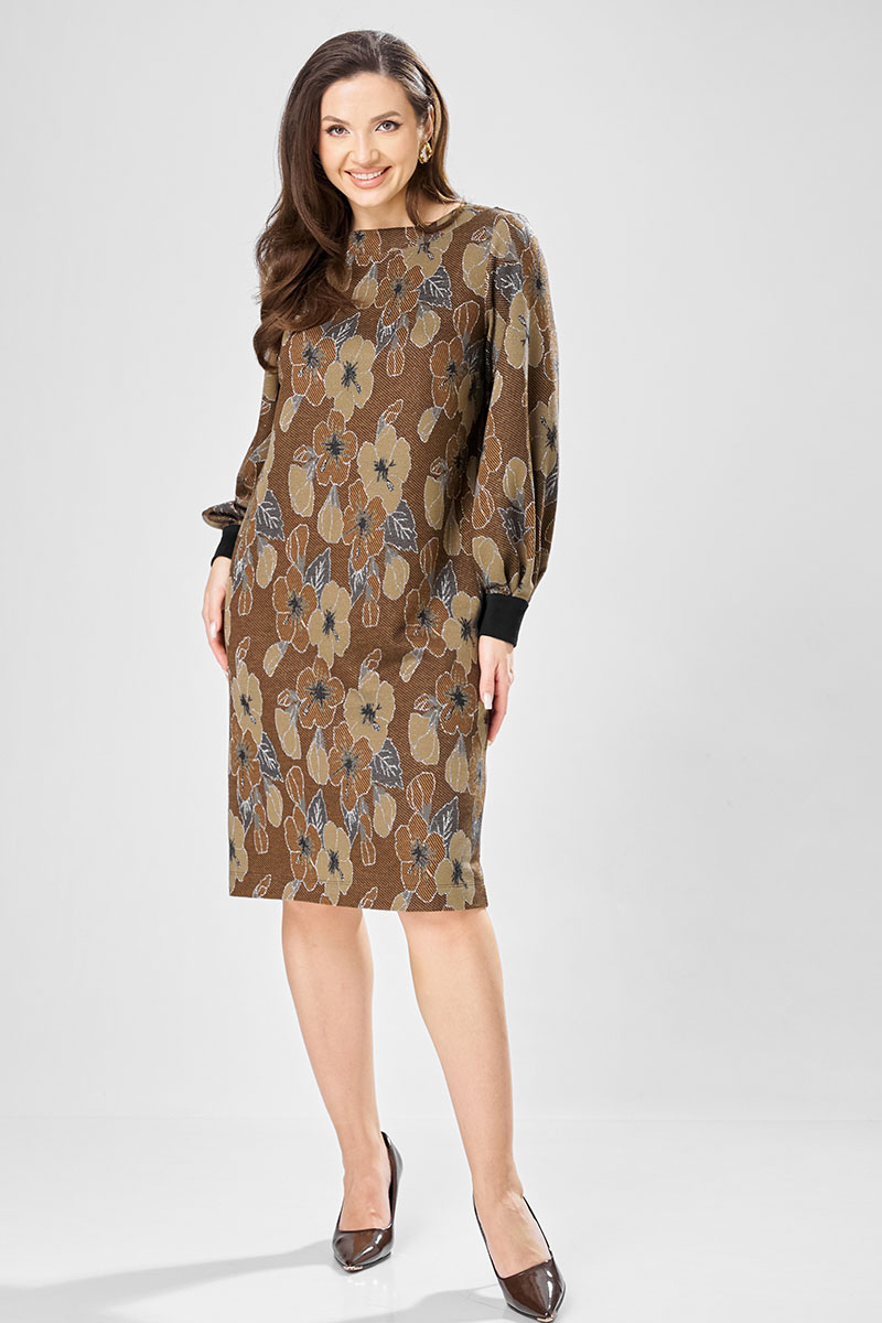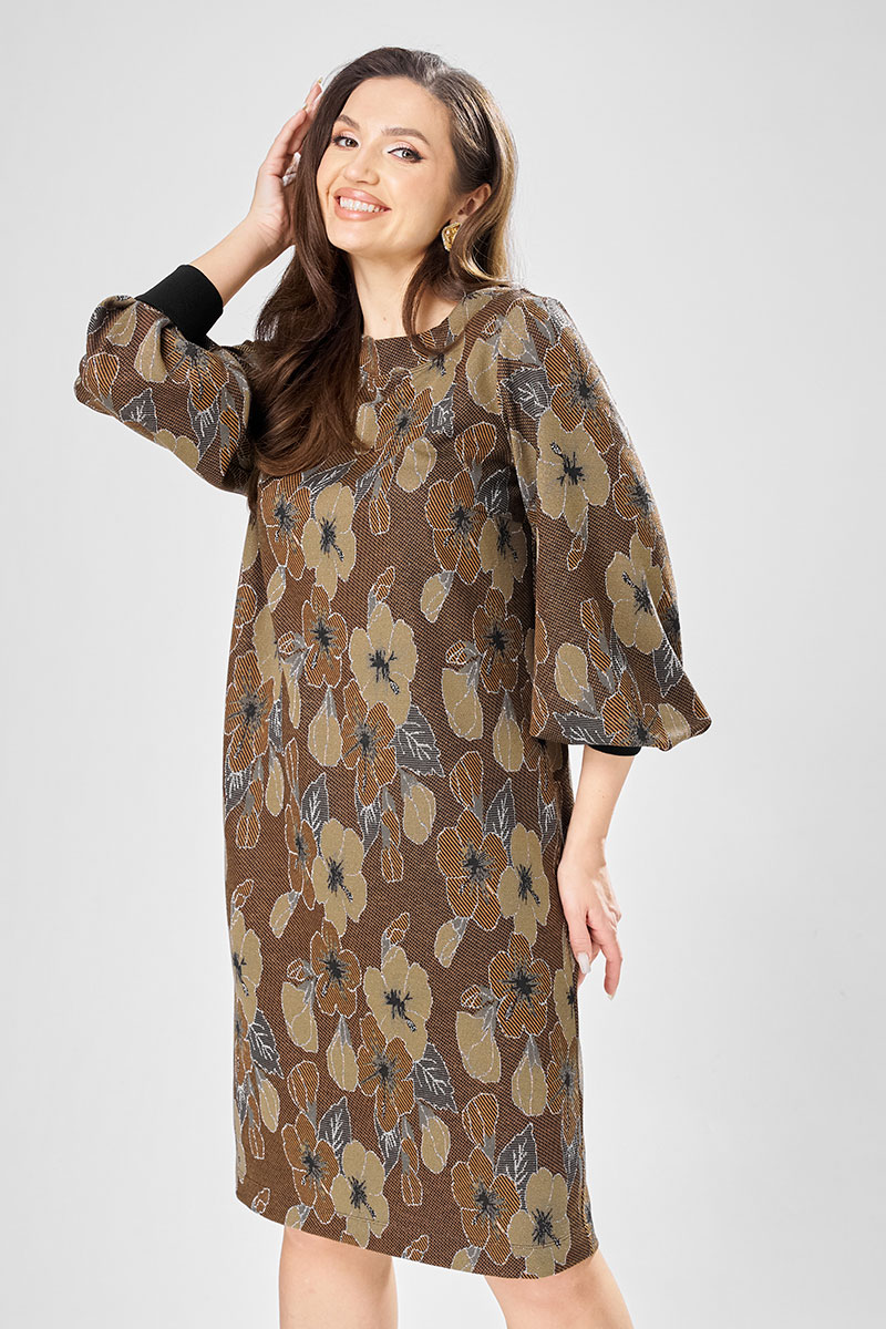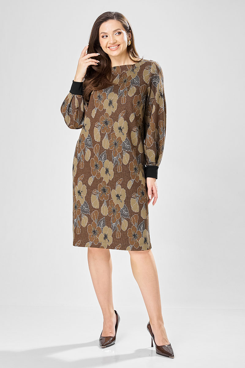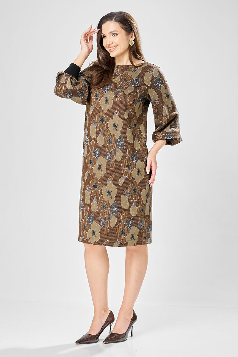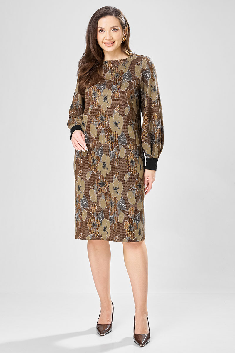 Платье прямого силуэта из плотного трикотажного полотна с рисунком. Перед с нагрудными вытачками. Спинка со средним швом. Горловина лодочкой обработана планкой. Рукав одношовный втачной по низу со складками собранными на манжету. В боковом шве карман.