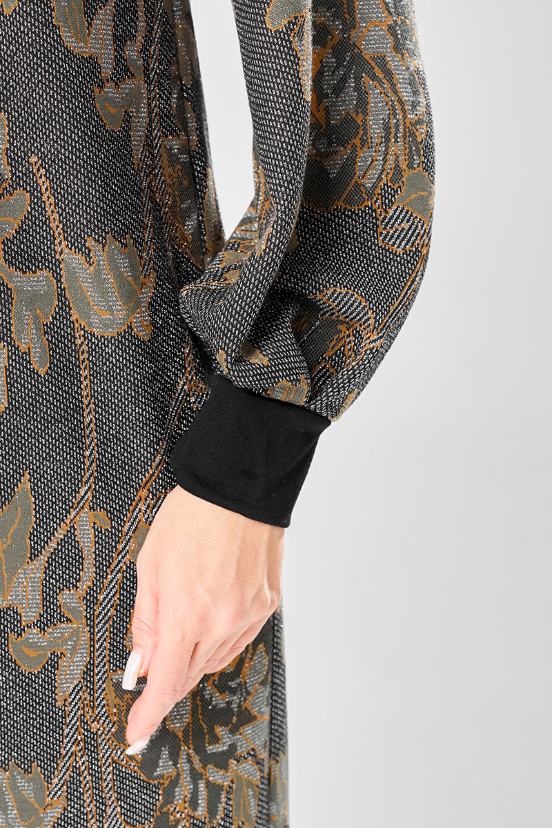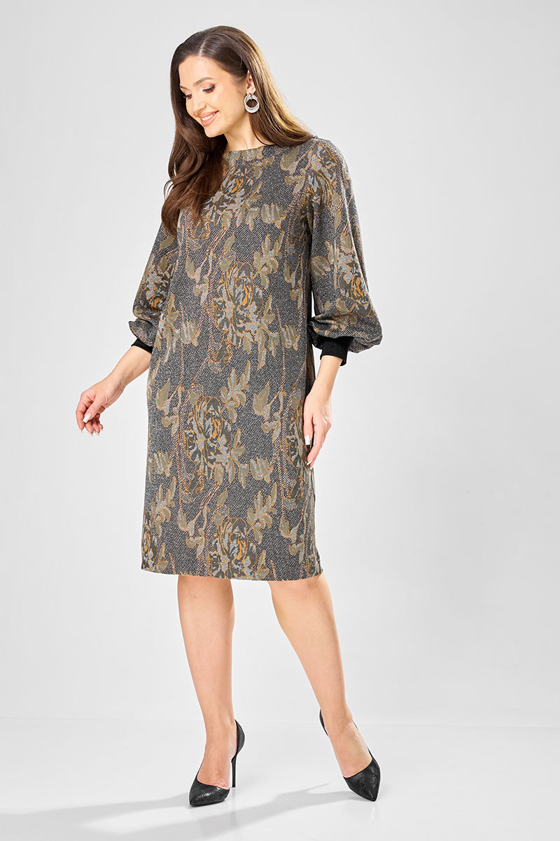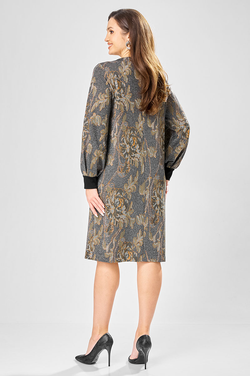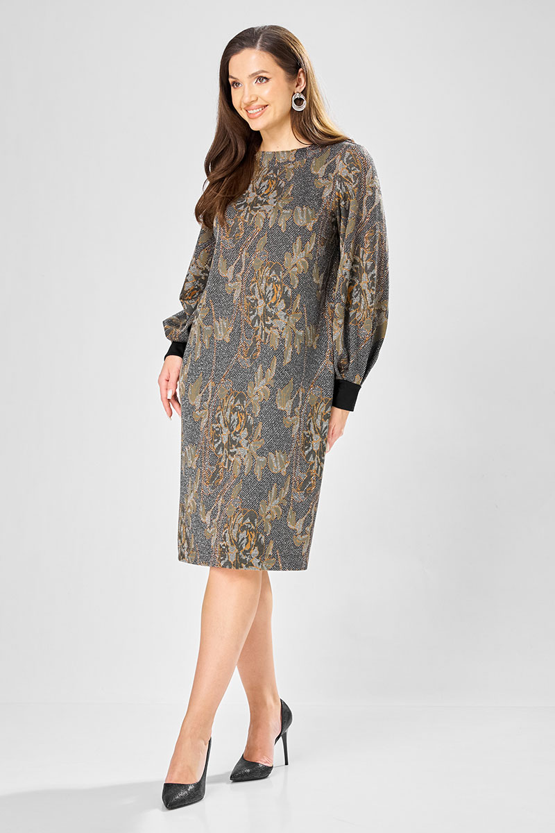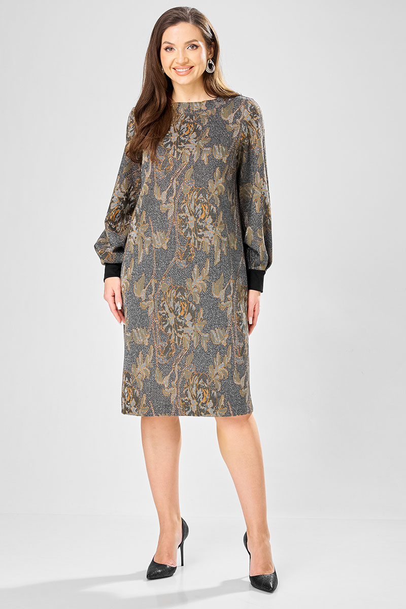 Платье прямого силуэта из плотного трикотажного полотна с рисунком. Перед с нагрудными вытачками. Спинка со средним швом. Горловина лодочкой обработана планкой. Рукав одношовный втачной по низу со складками собранными на манжету. В боковом шве карман.