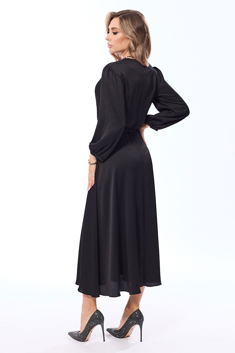 Платье, без воротника, без застежки, отрезное по линии талии. Лиф переда с запахом. Талия собрана на резинку. Верхняя часть спинки с талиевыми вытачками. Нижняя часть платья расширена к низу. Рукав втачной, 3/4, с манжетой, присборенной на резинку. Платье со съемным декоративны поясом из основной ткани и декоративным цветком на поясе.