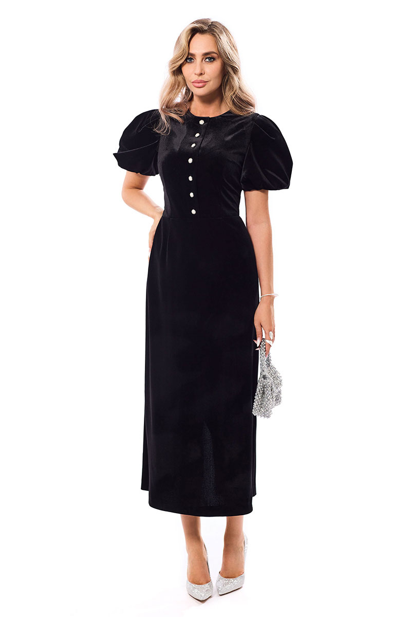 Платье без воротника, с круглым вырезом горловины, центральной застежкой на петли и пуговицы по лифу переда. Платье отрезное по линии талии. По лифу переда с нагрудными вытачками. Спинка со средним швом, заканчивающимся разрезом, талиевыми вытачками. Рукав втачной, короткий, по низу, присборен на резинку. Окат рукава присборен.