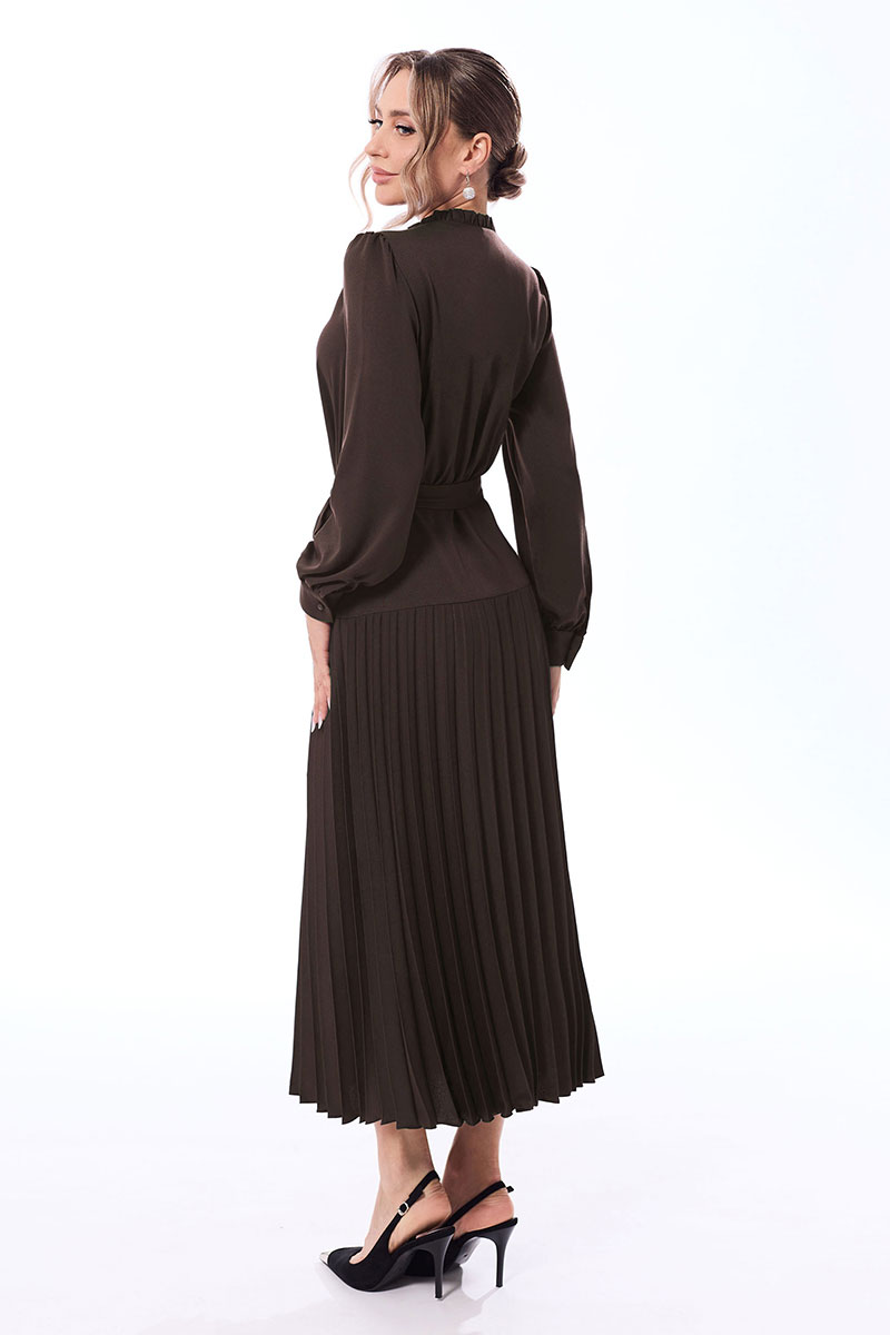 Платье с отрезным присборенным воротником- стойкой, горловина переда с разрезом, застегивающимся на одну навесную петлю и пуговицу. Платье отрезное по линии талии, шов по талии присборен. По низу платья- отрезная кокетка и деталь- гофре. Рукав втачной, длинный, с отрезной манжетой, застегивающейся на одну петлю и пуговицу. Платье со съемным поясом. На боковых швах расположены шлевки для пояса.