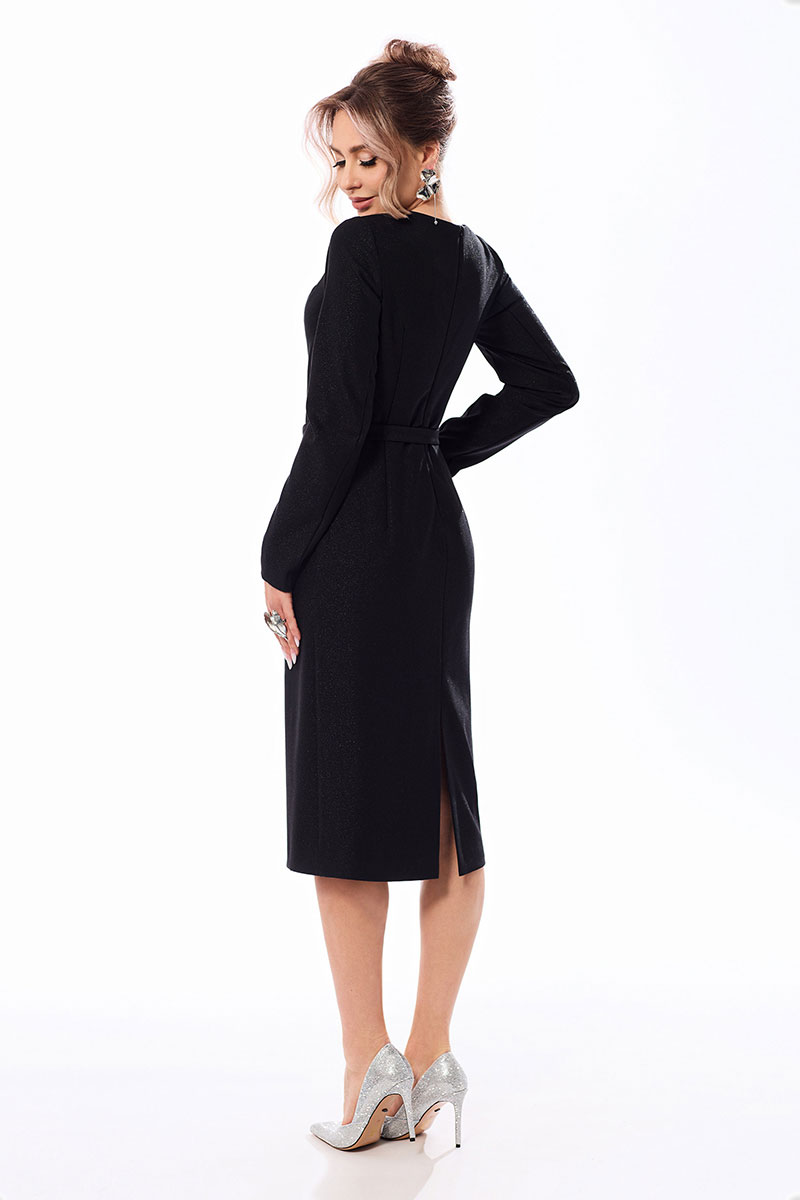 Платье без воротника, с фигурным вырезом горловины, застежкой на потайную молнию в среднем шве спинки. Платье отрезное по линии талии. По горловине переда фигурная драпировка со складками, горловина переда с отрезной планкой, декорированной тесьмой со стразами. Спинка со средним швом, заканчивающимся разрезом, талиевыми вытачками. Рукав втачной, длинный. Платье со съемным поясом.