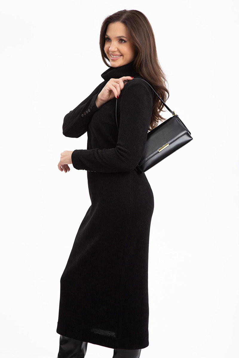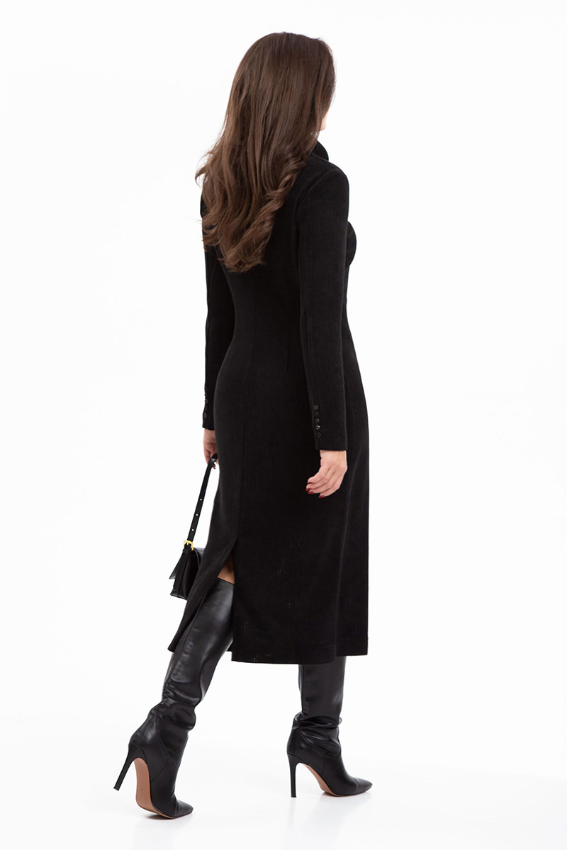 Платье без застежки, с отрезным воротником- хомут. Перед с нагрудными вытачками. Спинка с талиевыми вытачками, средним швом, заканчивающимся шлицей. Рукав втачной, длинный, двухшовный.