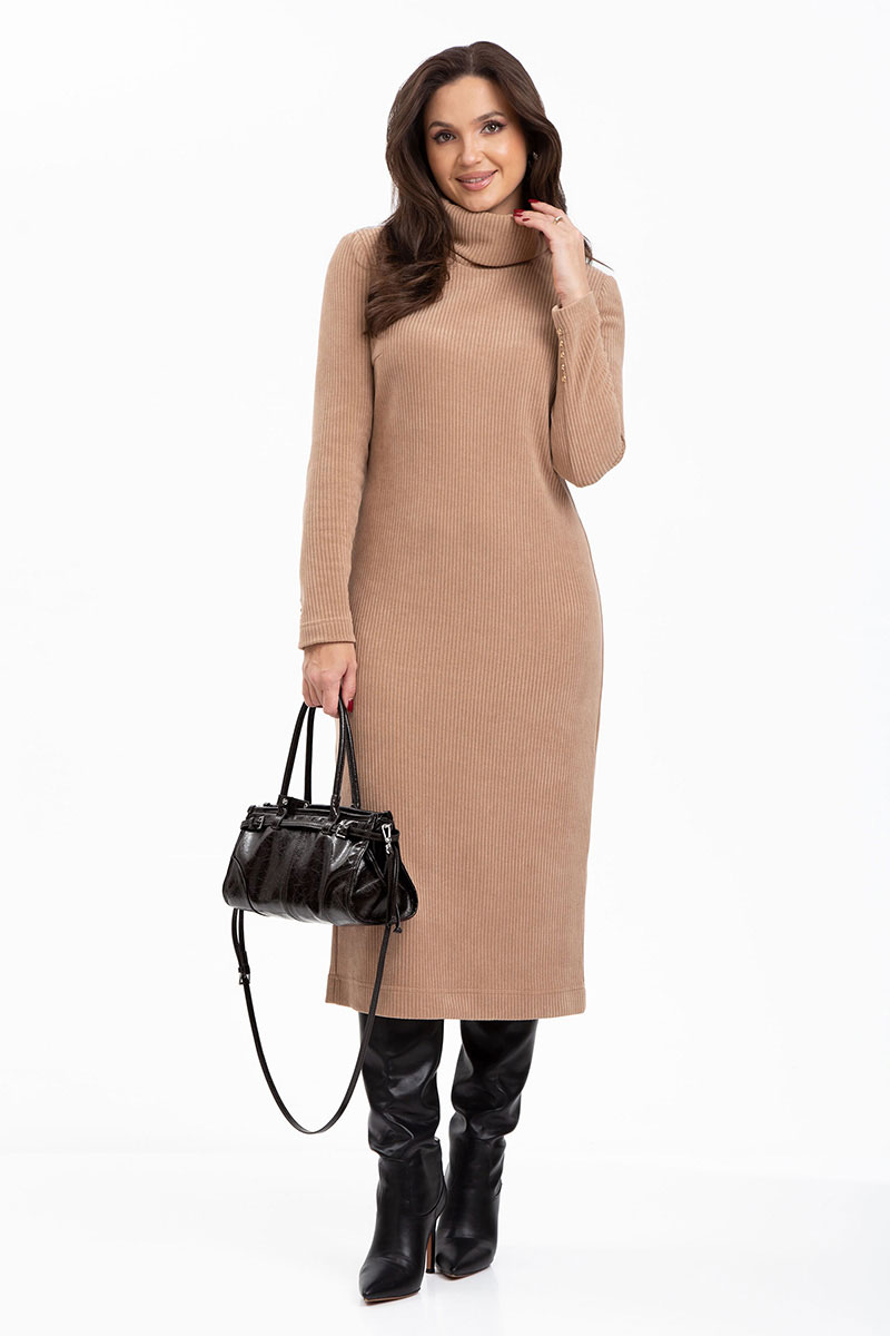 Платье без застежки, с отрезным воротником- хомут. Перед с нагрудными вытачками. Спинка с талиевыми вытачками, средним швом, заканчивающимся шлицей. Рукав втачной, длинный, двухшовный.